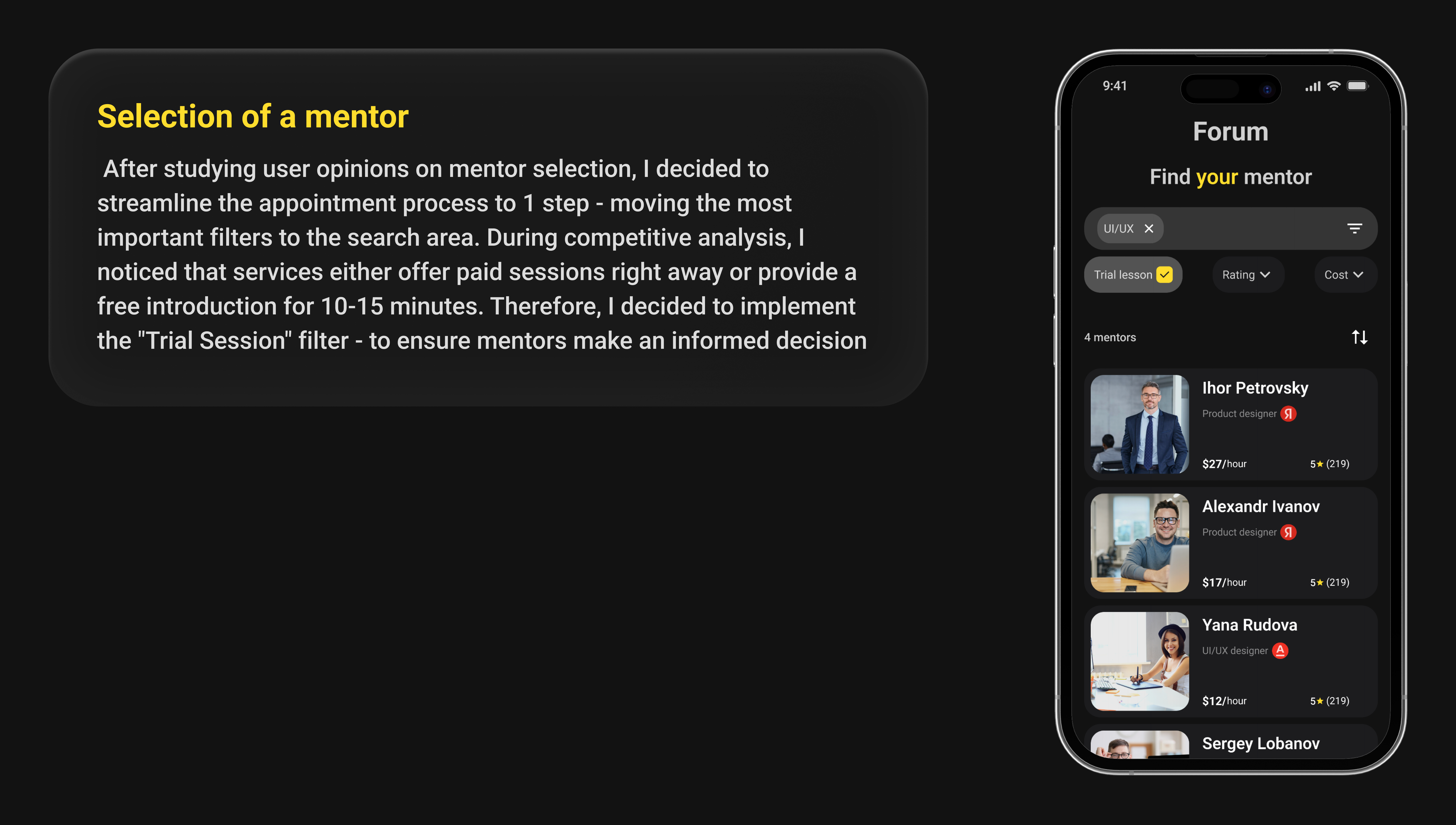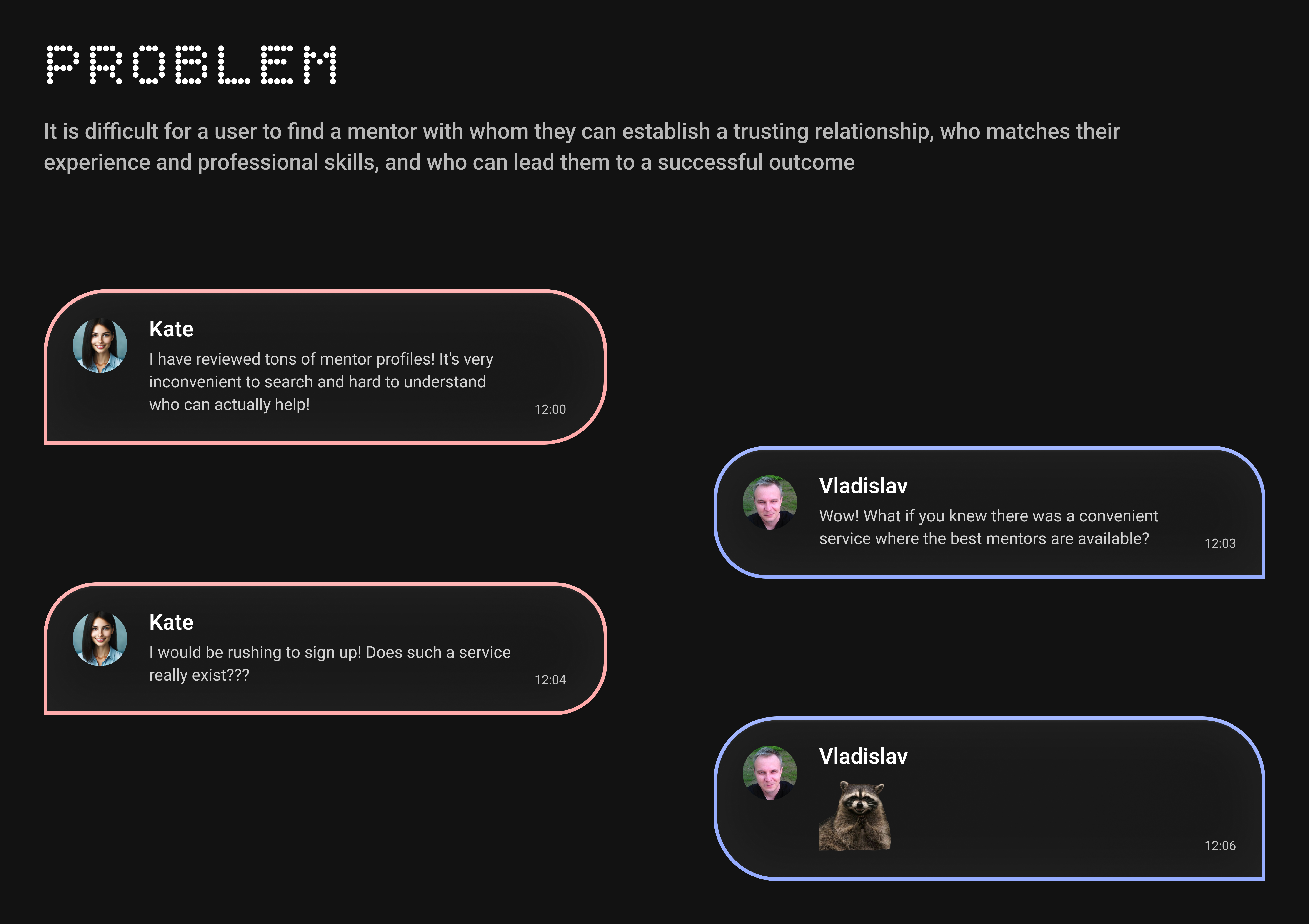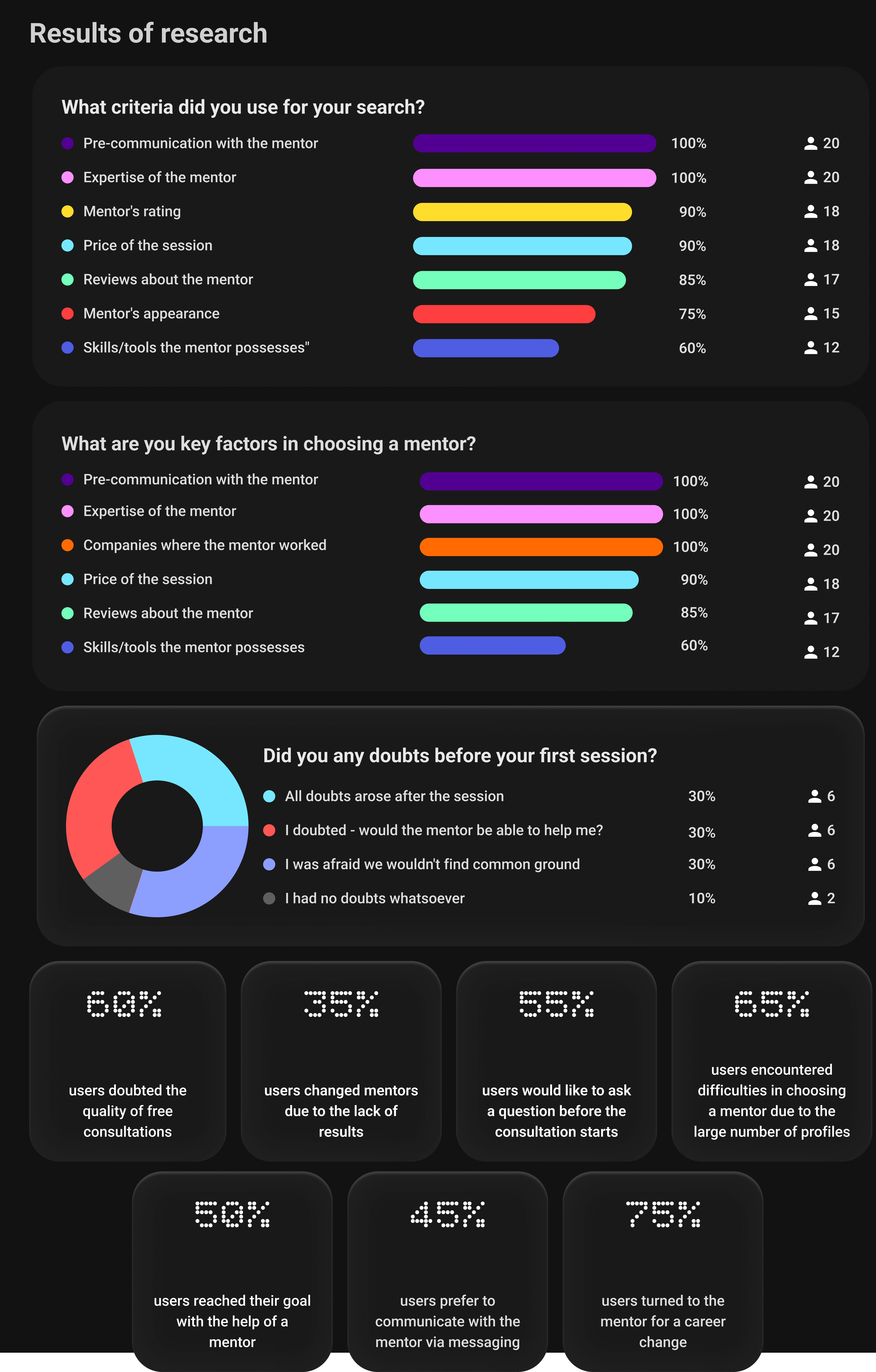 During my research, it was important for me to understand how menties look for a mentors, and how existing services help with this process. I found that users generally prefer to use third-party platforms such as Telegram and Google Meet for communication with mentors, while using the Forum as a tool to search, evaluate, and initially communicate with mentors. Unfortunately, I wasn’t able to explain this in my case study as well as I would have liked, due to my limited English skills.