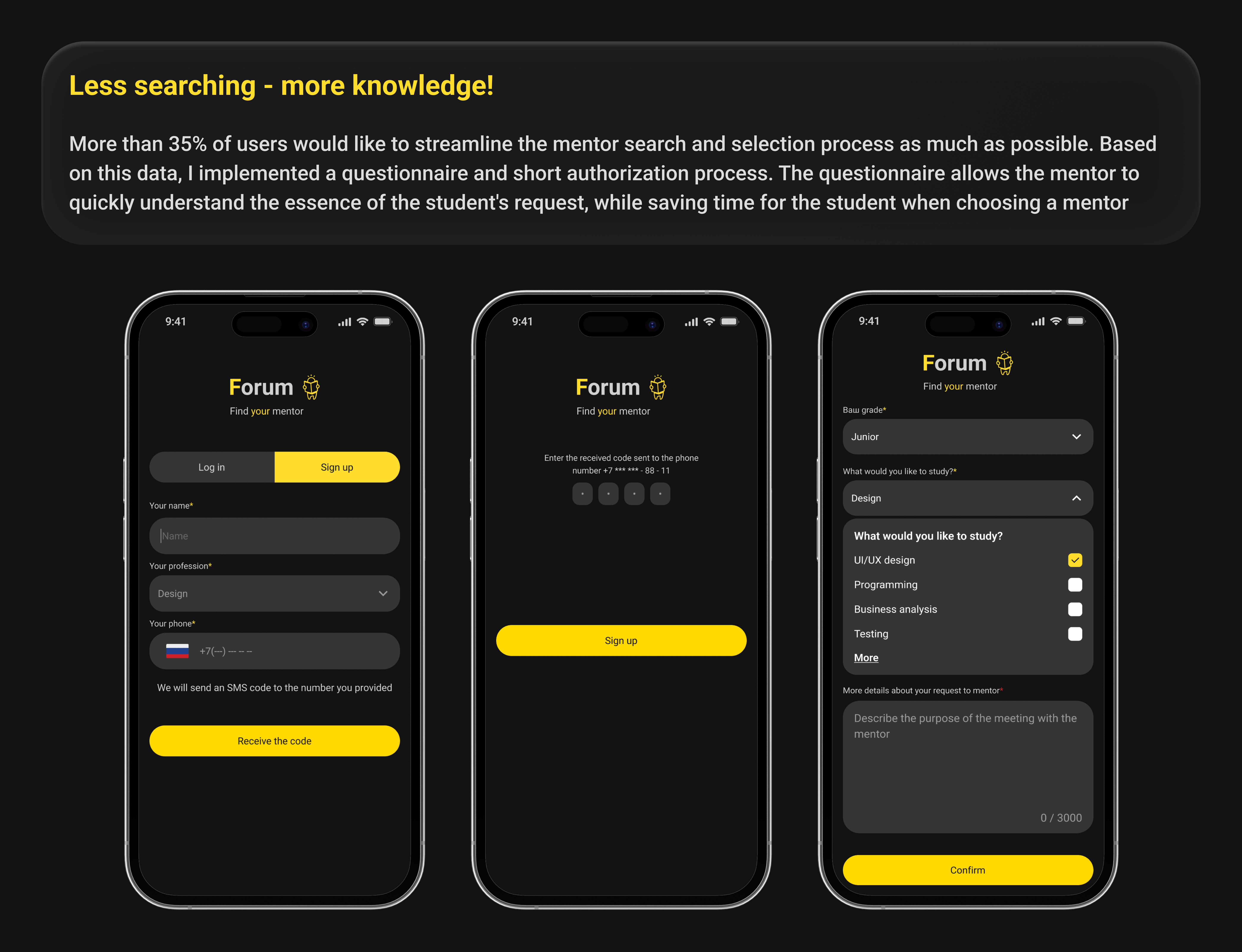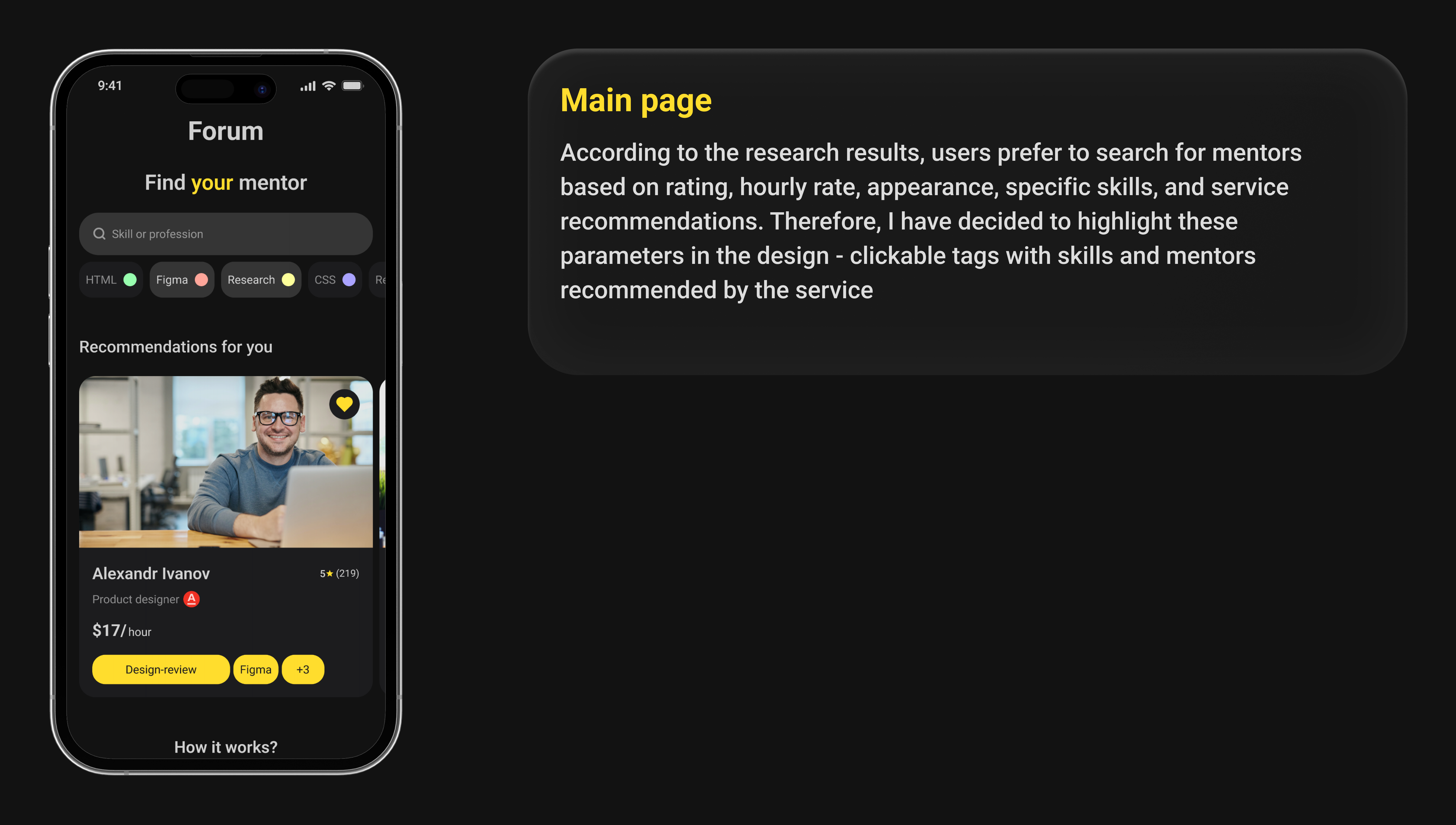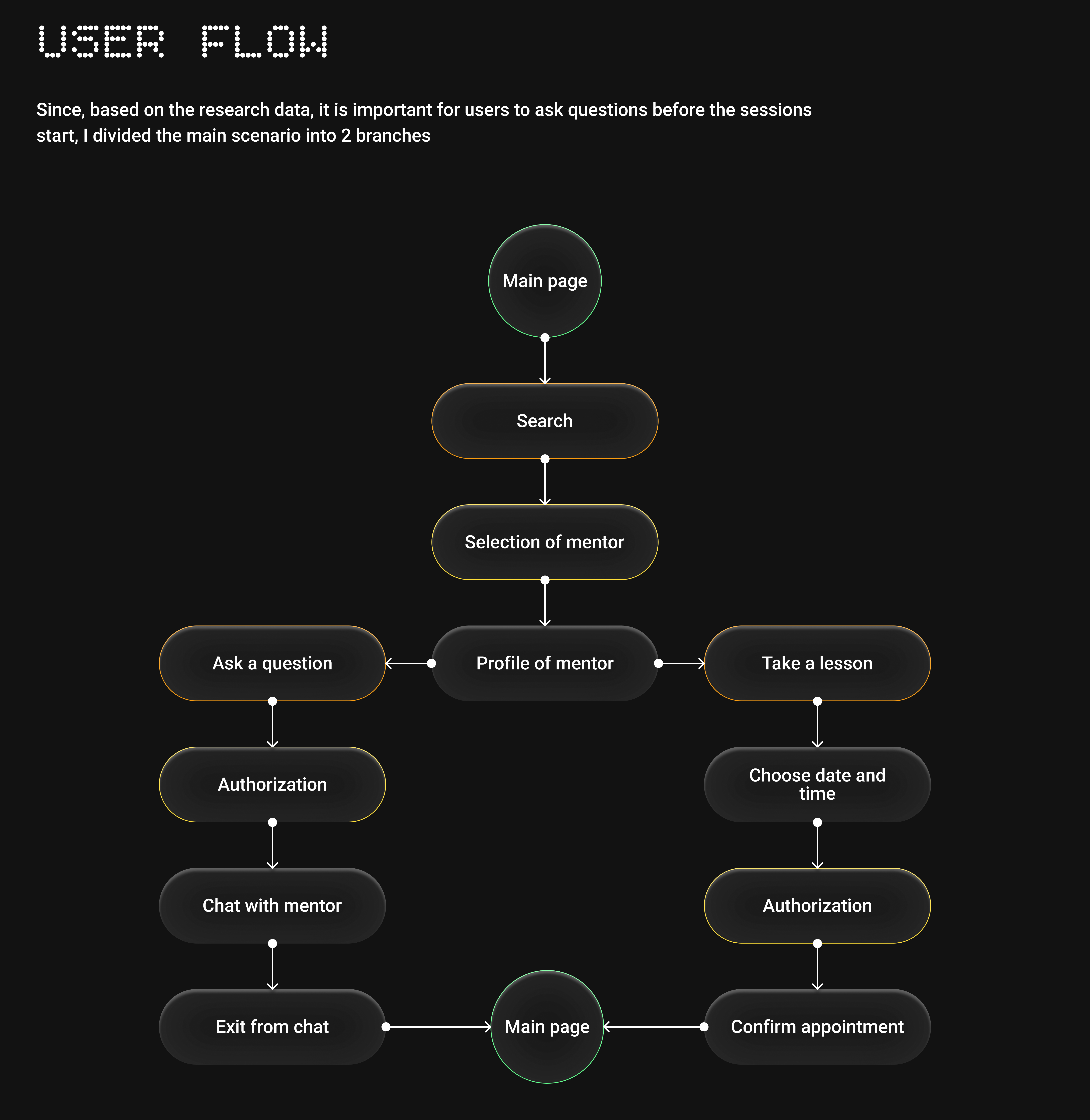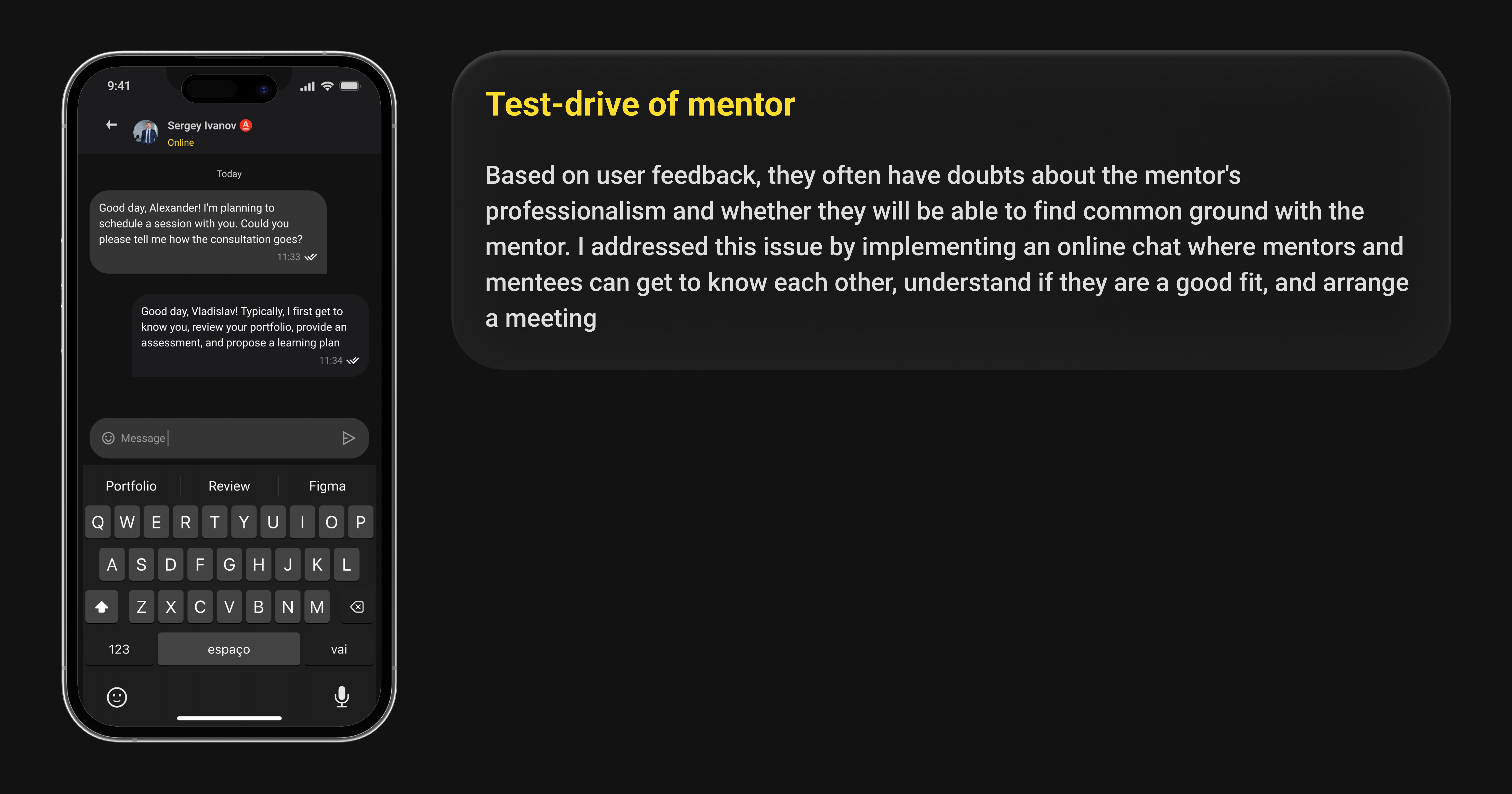 During my research, it was important for me to understand how menties look for a mentors, and how existing services help with this process. I found that users generally prefer to use third-party platforms such as Telegram and Google Meet for communication with mentors, while using the Forum as a tool to search, evaluate, and initially communicate with mentors. Unfortunately, I wasn’t able to explain this in my case study as well as I would have liked, due to my limited English skills.