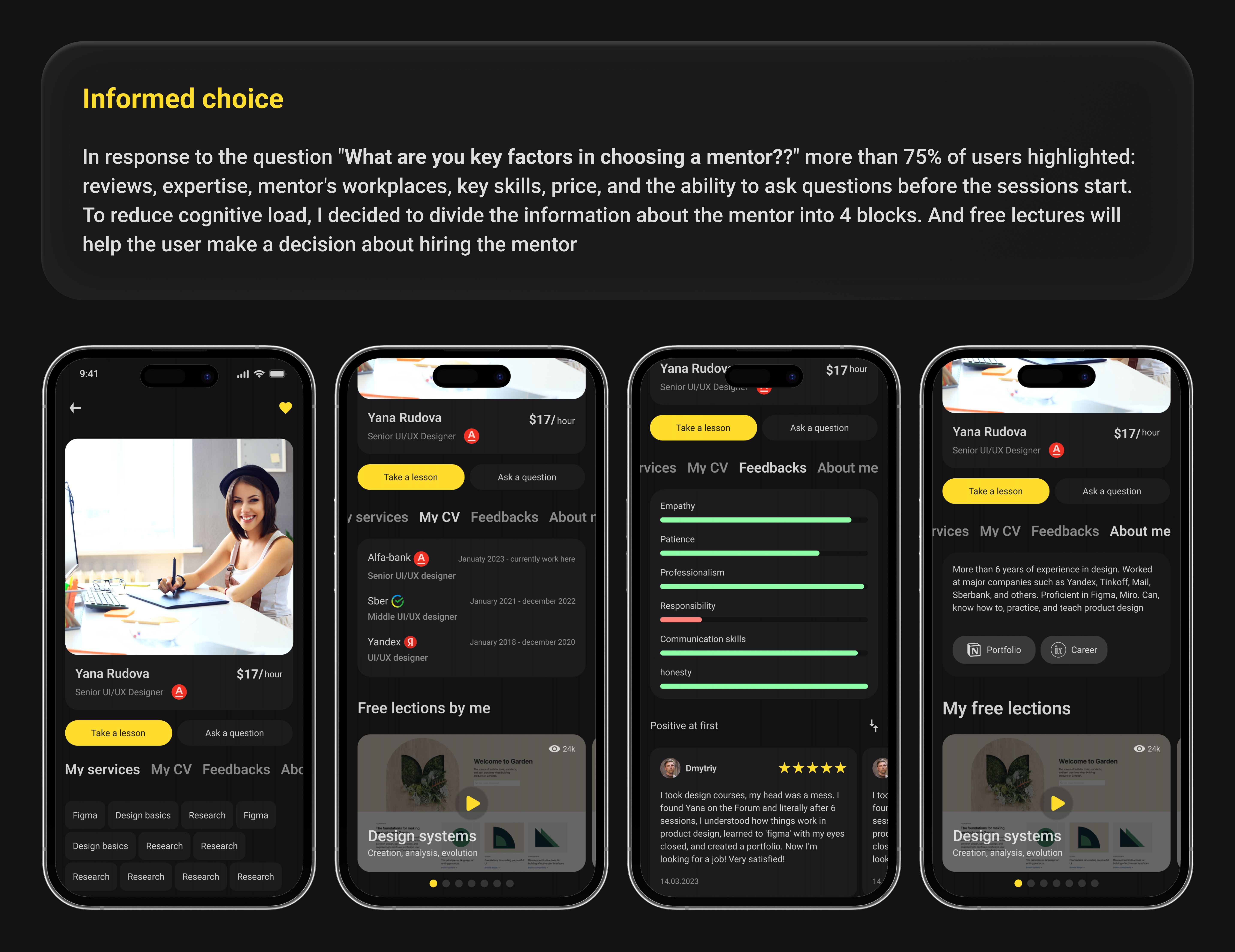 That's a fantastic piece of work and a great case study. It's thoughtful, well-explained, and backed by research data. The only thing that confused me is the lesson functionality: I assumed that mentors are for consulting, reviewing, and providing recommendations - more like one-on-one work or working in a group rather than giving design lessons. Nevertheless, your work is excellent and well-articulated - thank you for sharing!