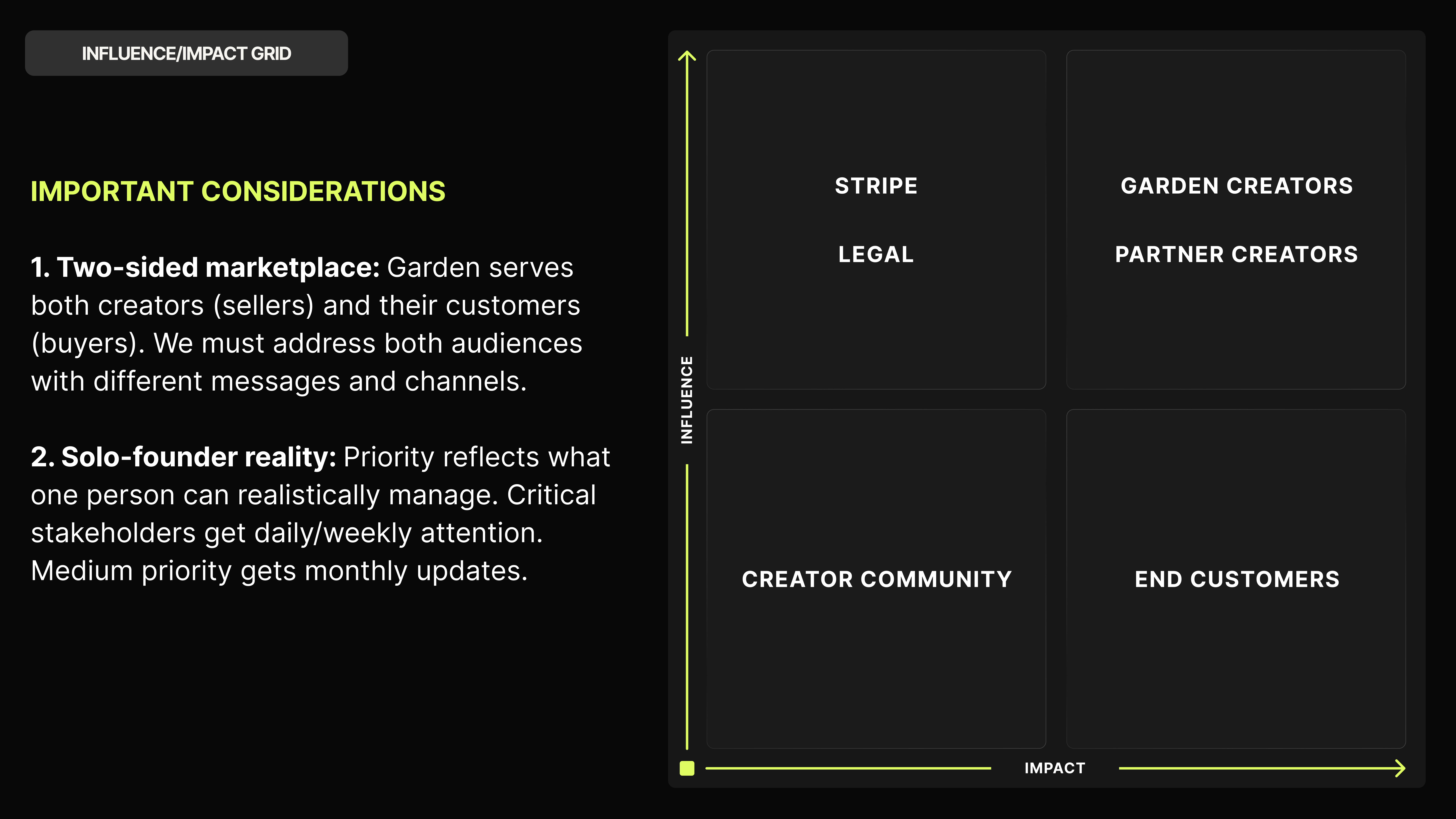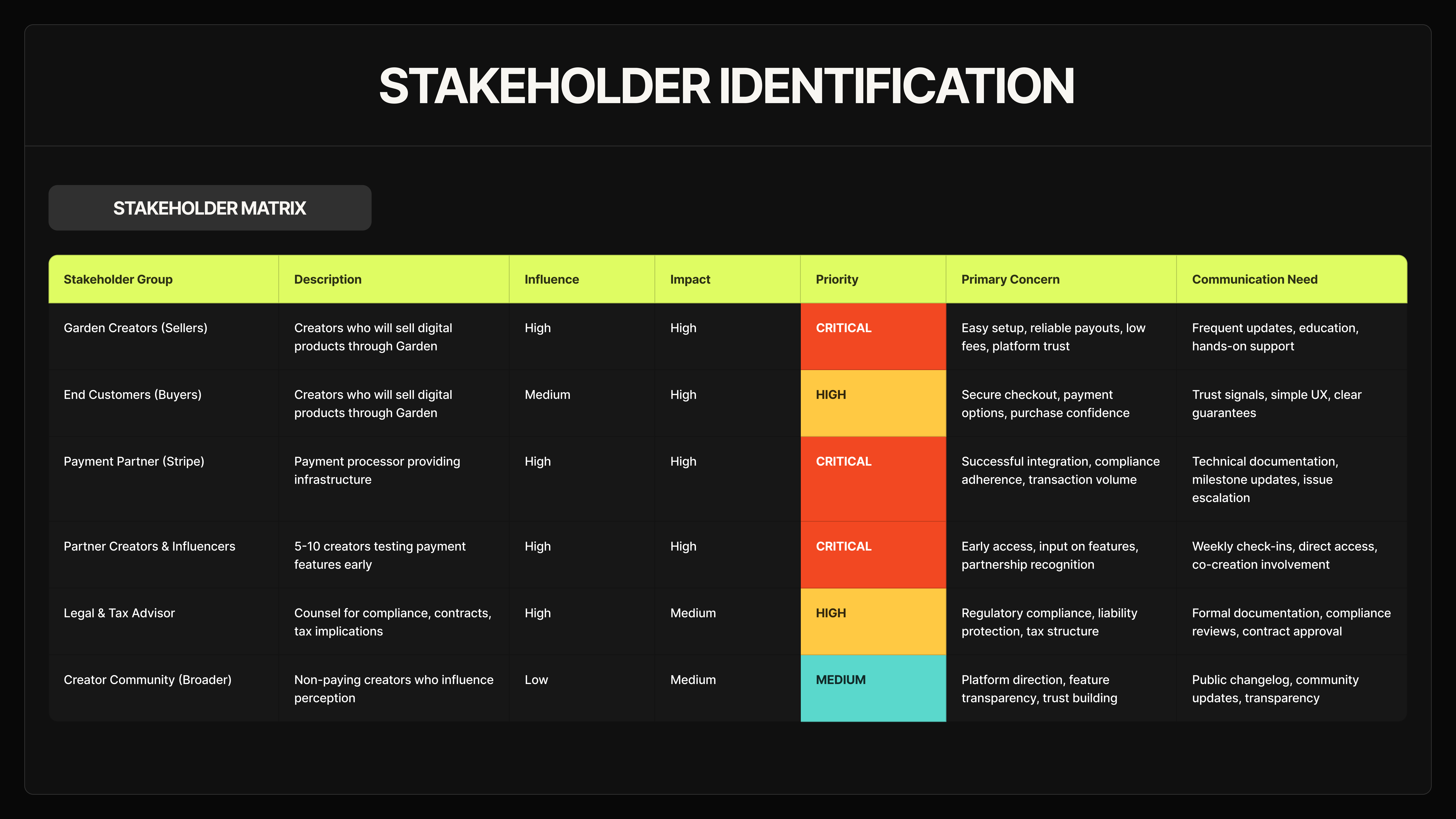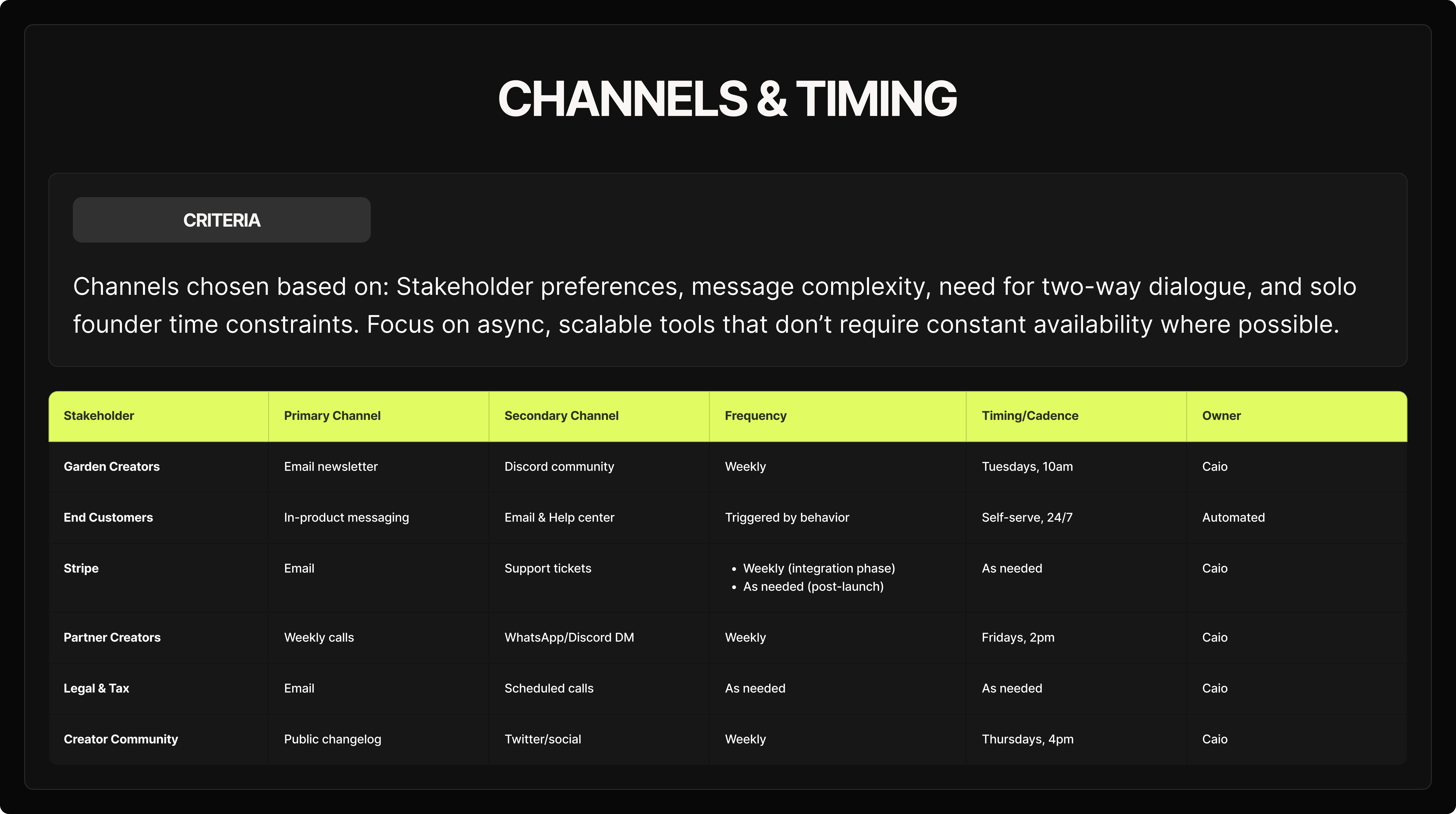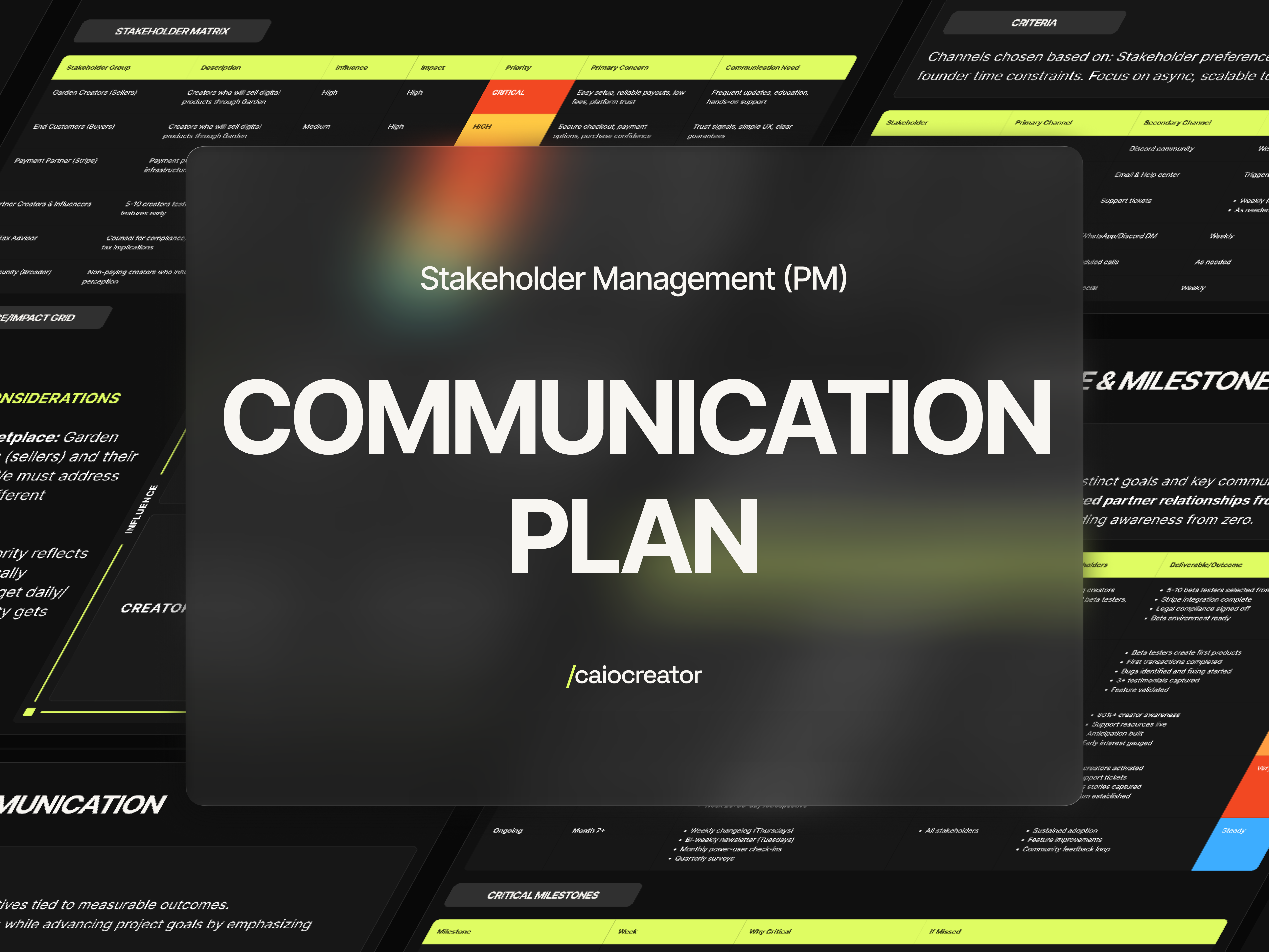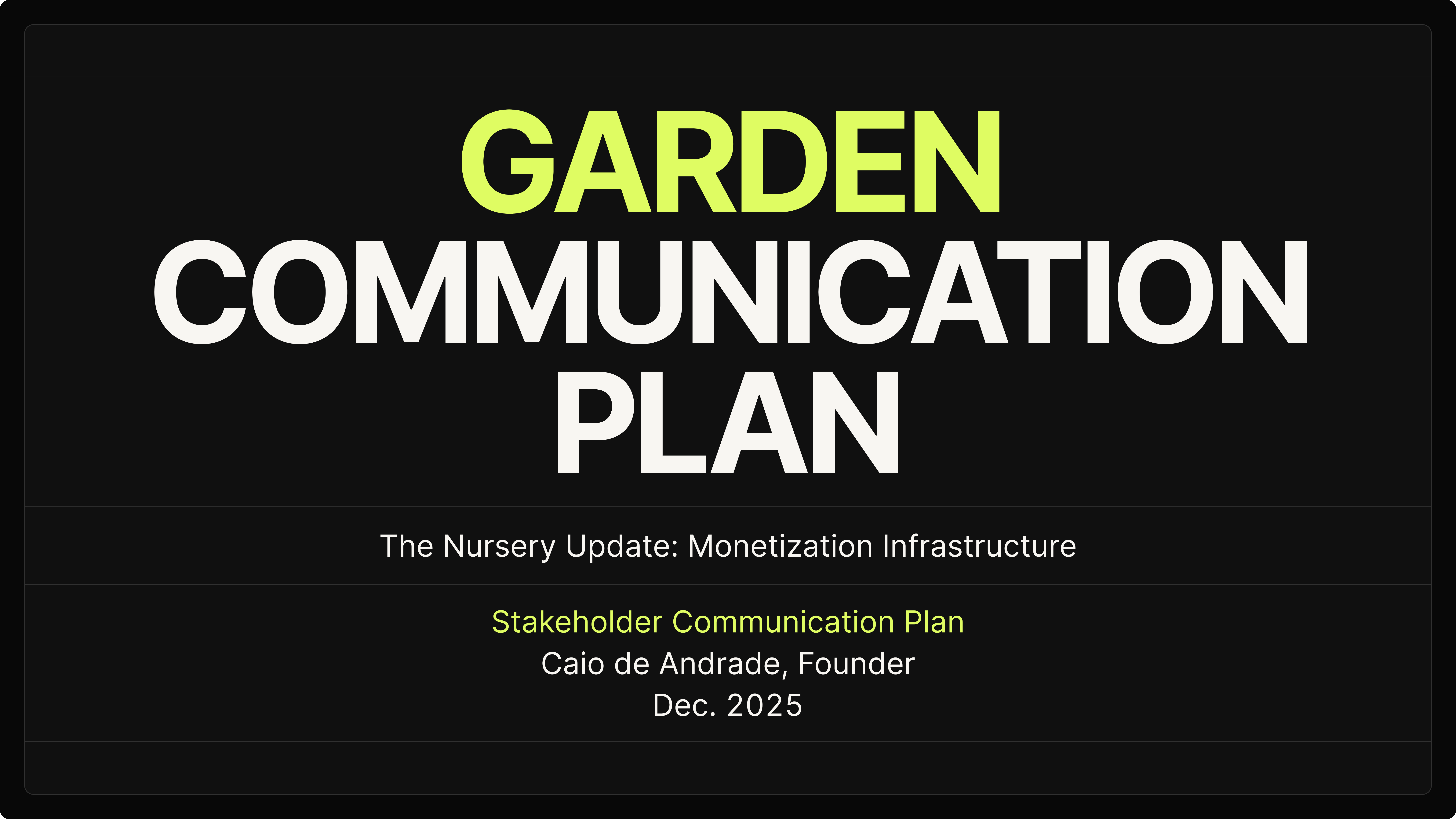 Hey, welcome. This is a stakeholder communication plan for Garden, a download gate platform I'm founding as a solopreneur.