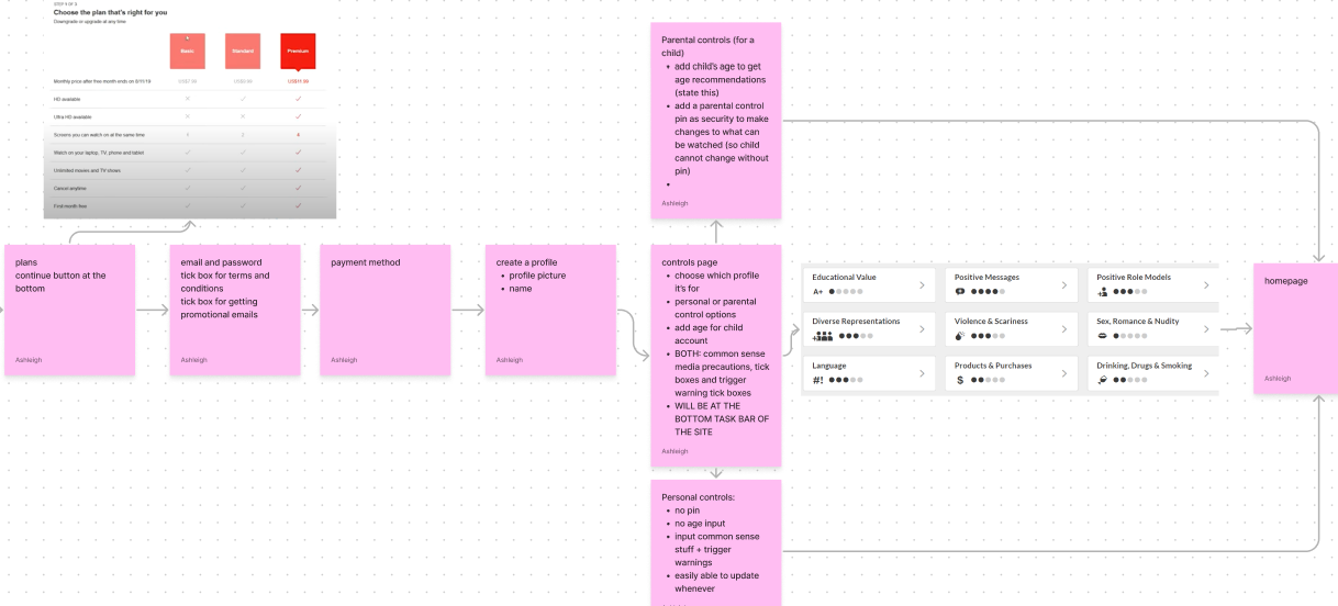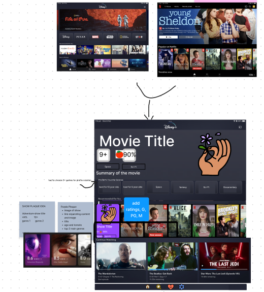 I didn’t have my pen and paper drawing out my ideas of screens like I would now. For the home screen I took features from Disney+ and Netflix and my own ideas and meshed it into one Frankenstein screen at the bottom of my Figjam page.