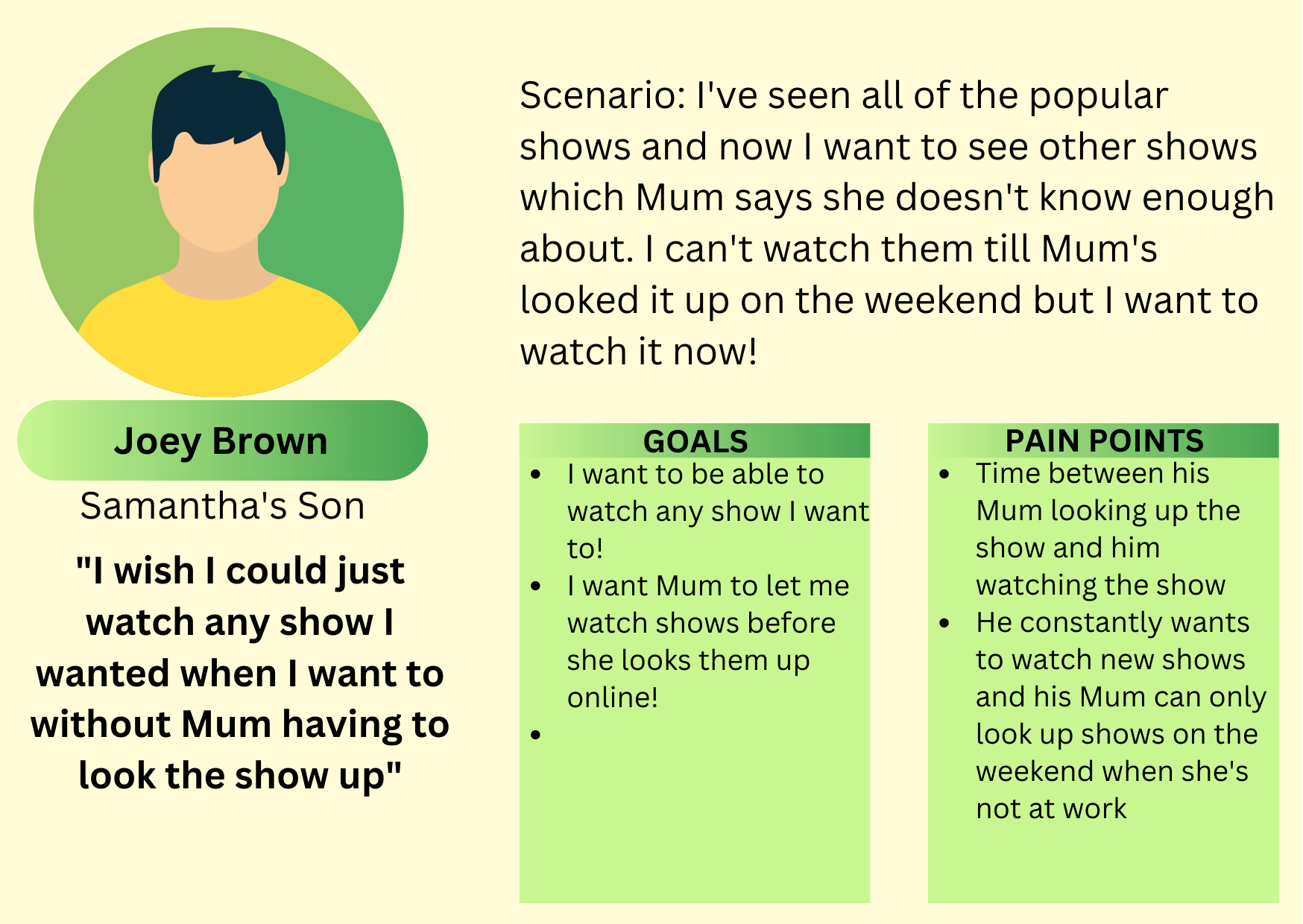 For Samantha’s son Joey Brown, Samantha’s son I added the following features to minimize pain points: