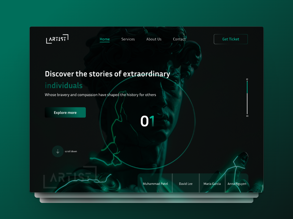 The hero looks too busy and contrast is lost in certain areas. The monotone color scheme is alright but introducing and analogous or complementary color could breath more life into it.