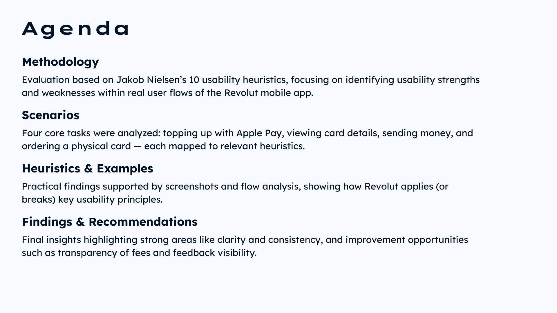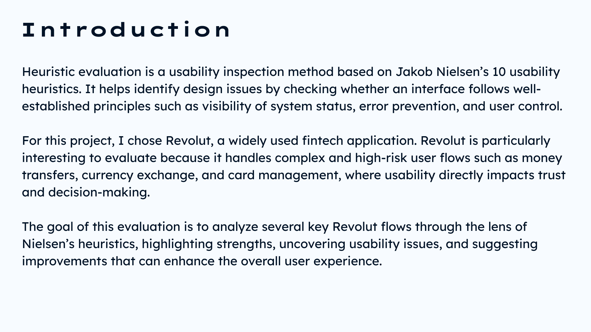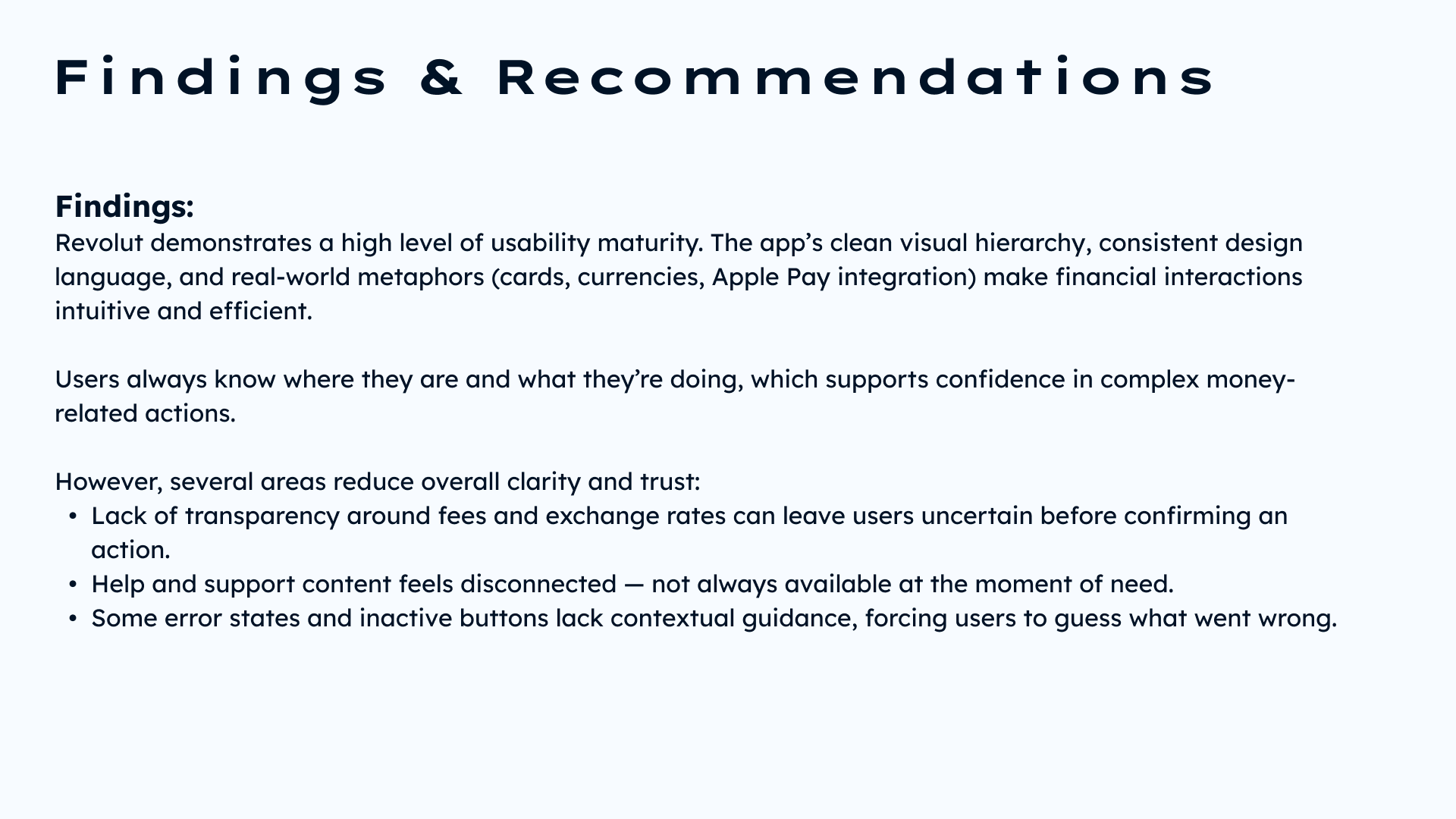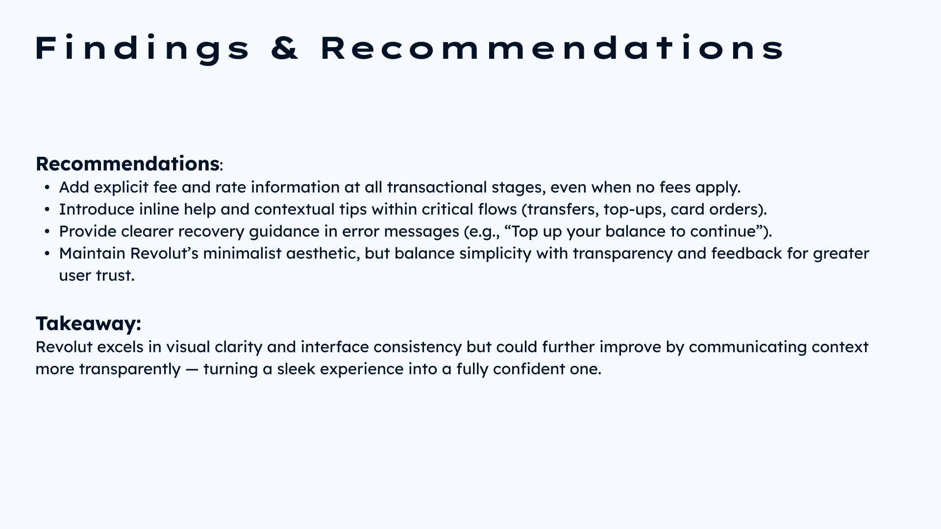 Good job! You can see you approached this systematically and extracted concrete insights. Clear breakdown into scenarios and heuristics, easy to read and find specific issues. This isn't another generic report. You show exactly what and where, not limiting yourself to generics like "poor status visibility". Screenshots with annotations are a plus. Balance between positive and negative – you don't just focus on problems, you show what Revolut does well too. This builds credibility for the analysis.