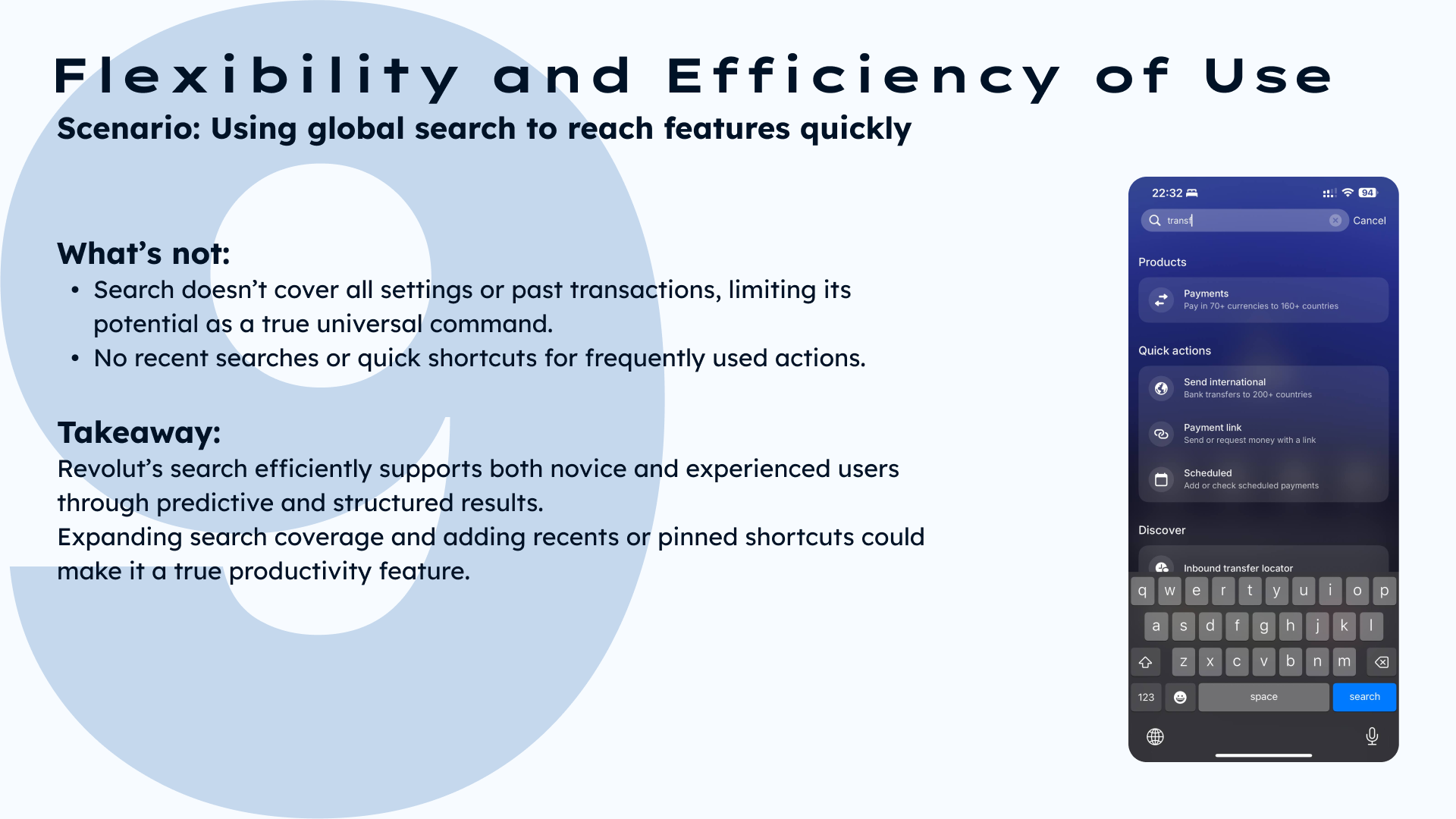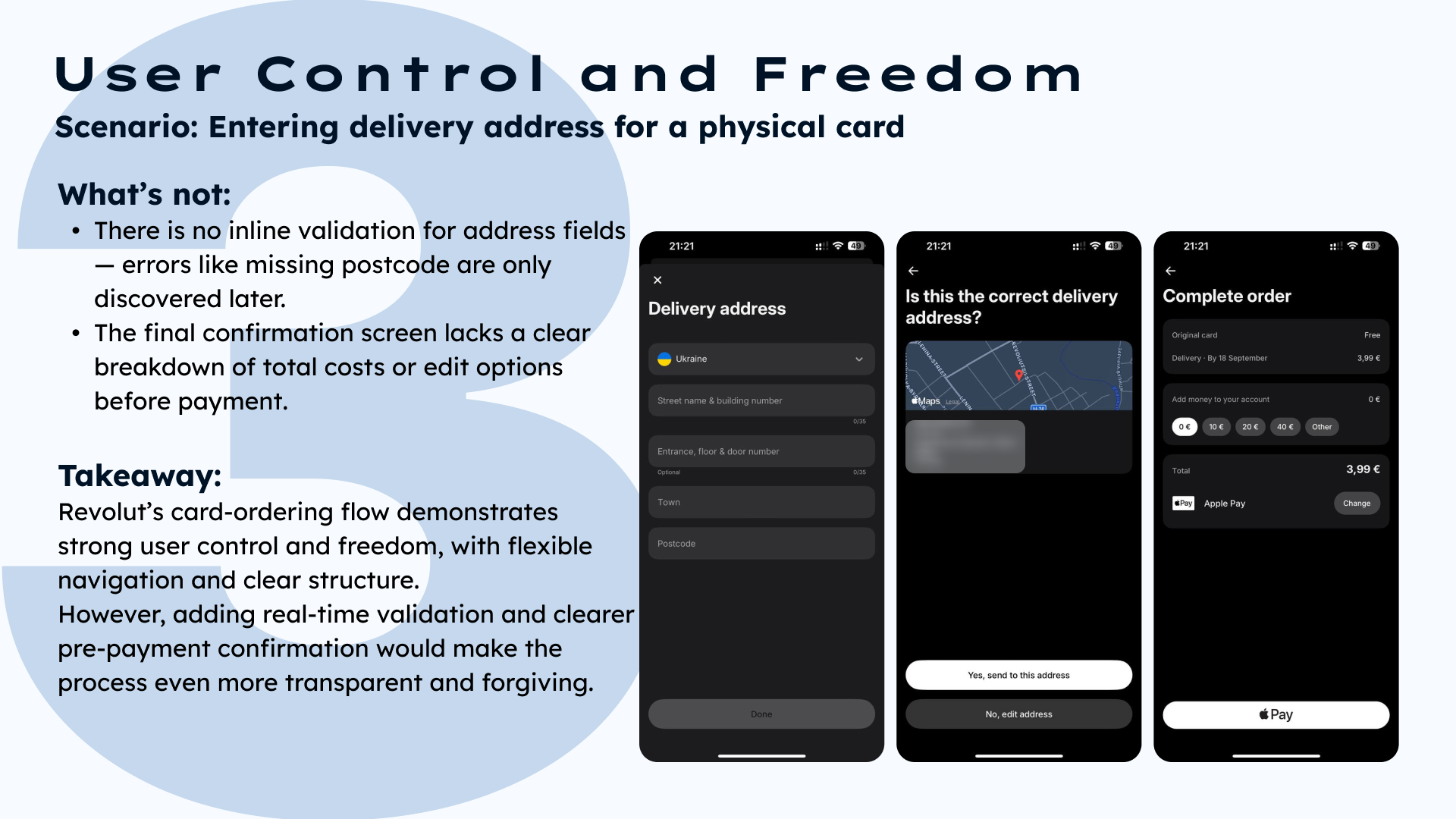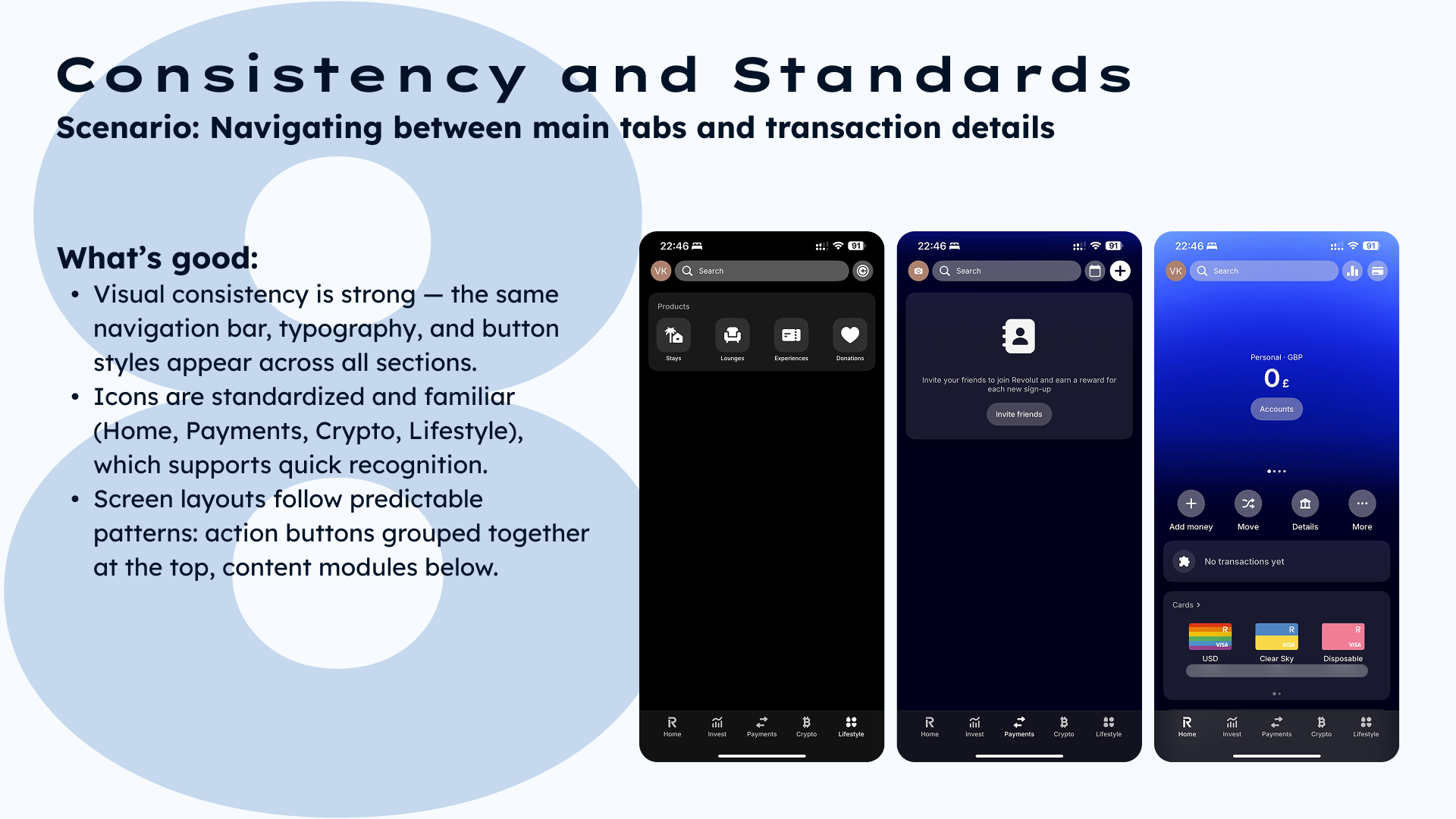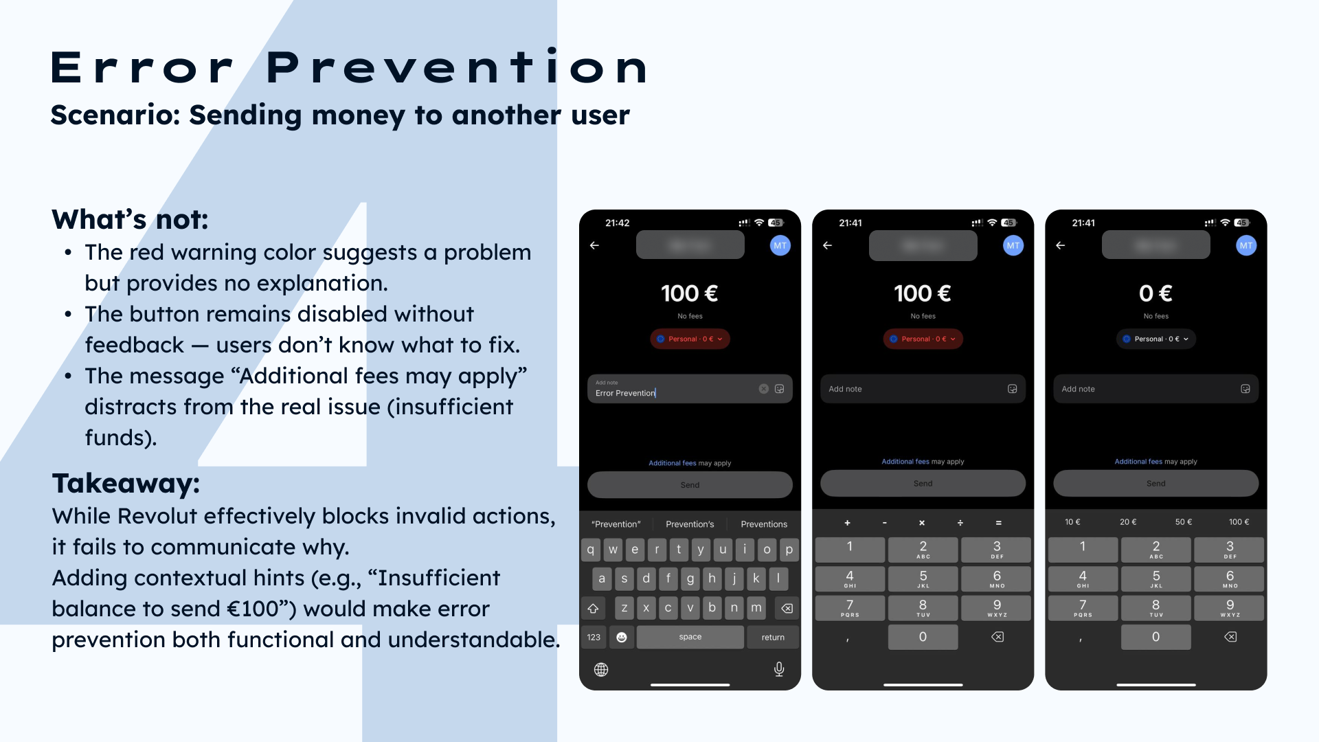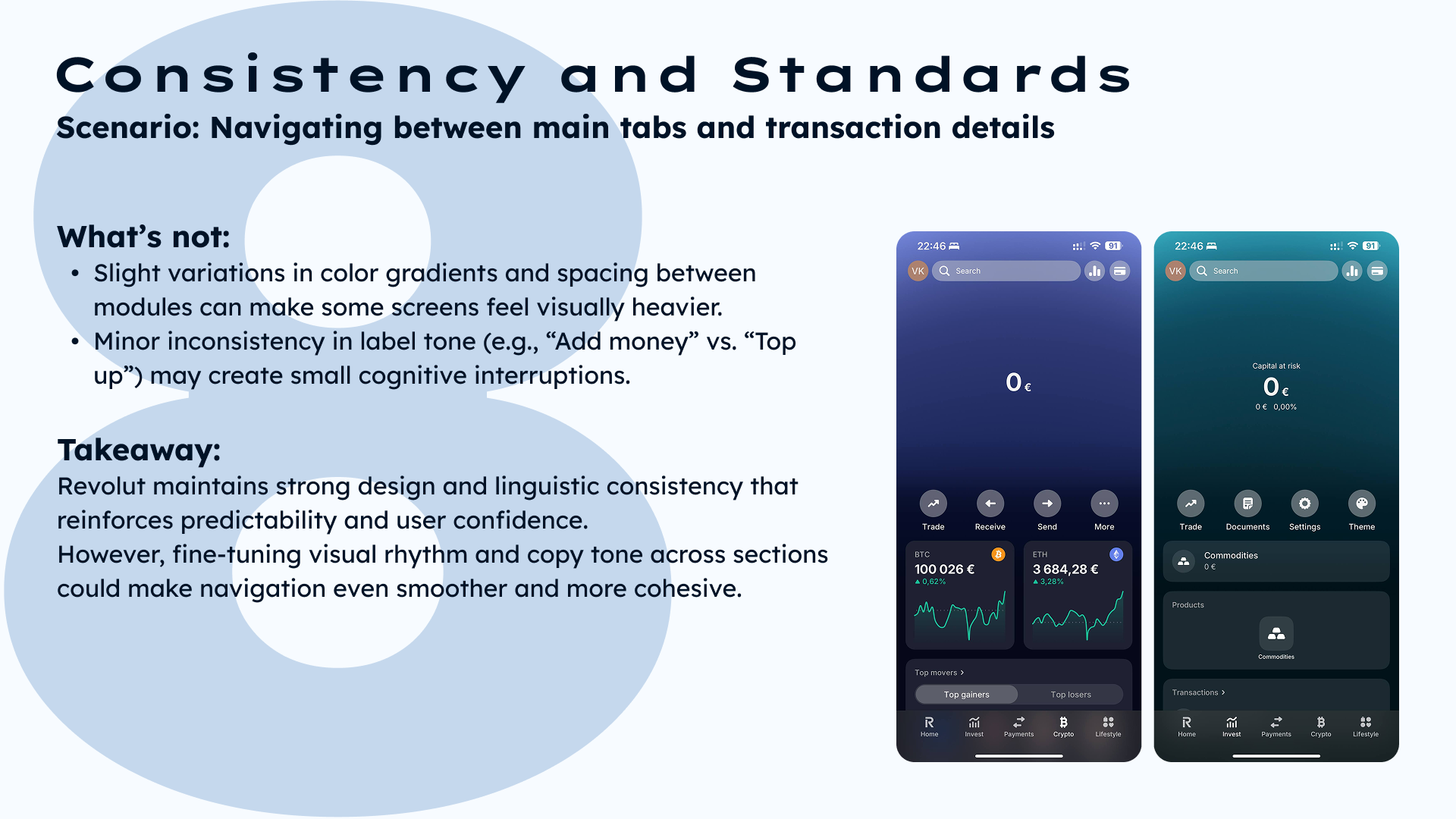 Good job! You can see you approached this systematically and extracted concrete insights. Clear breakdown into scenarios and heuristics, easy to read and find specific issues. This isn't another generic report. You show exactly what and where, not limiting yourself to generics like "poor status visibility". Screenshots with annotations are a plus. Balance between positive and negative – you don't just focus on problems, you show what Revolut does well too. This builds credibility for the analysis.