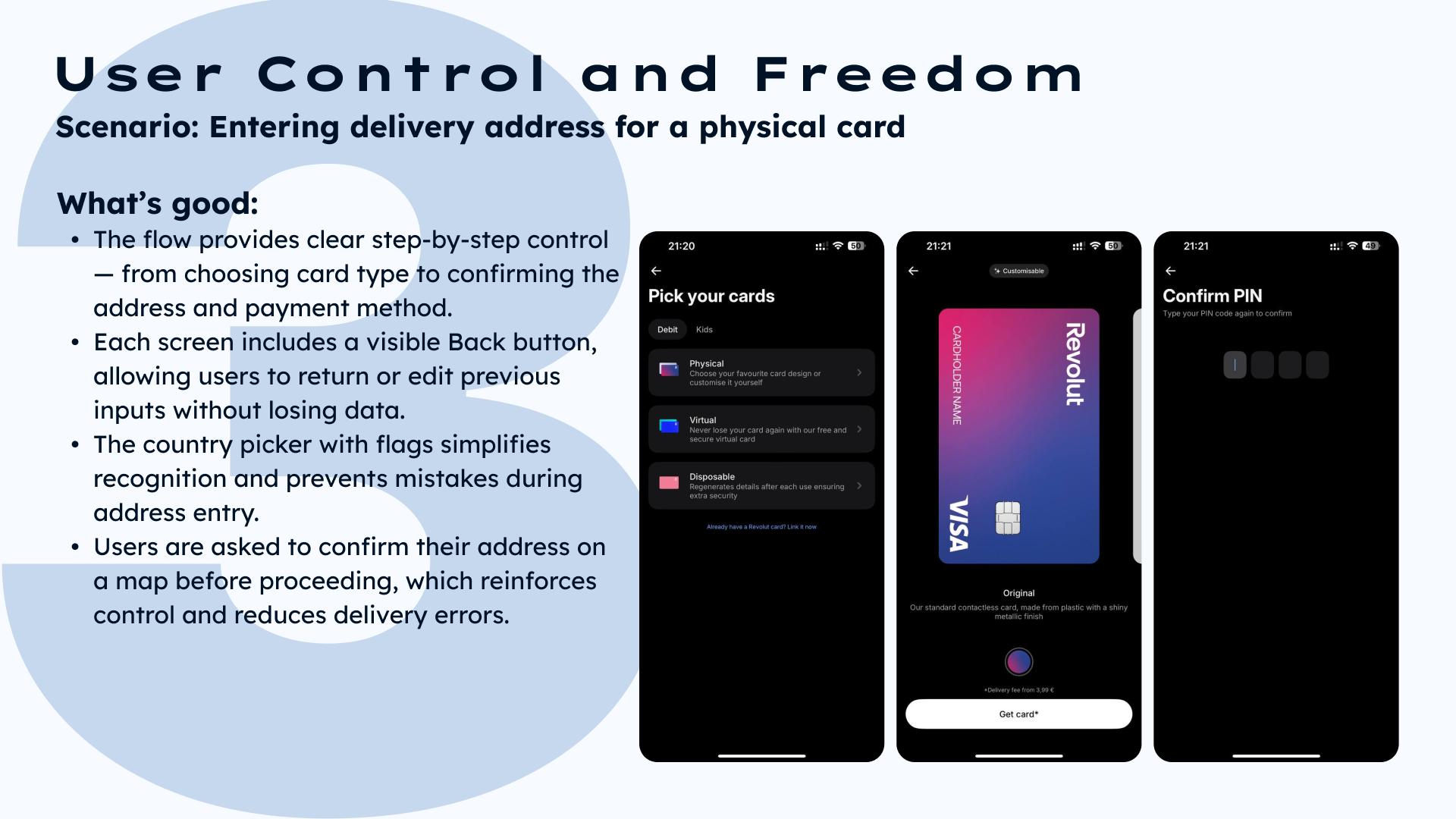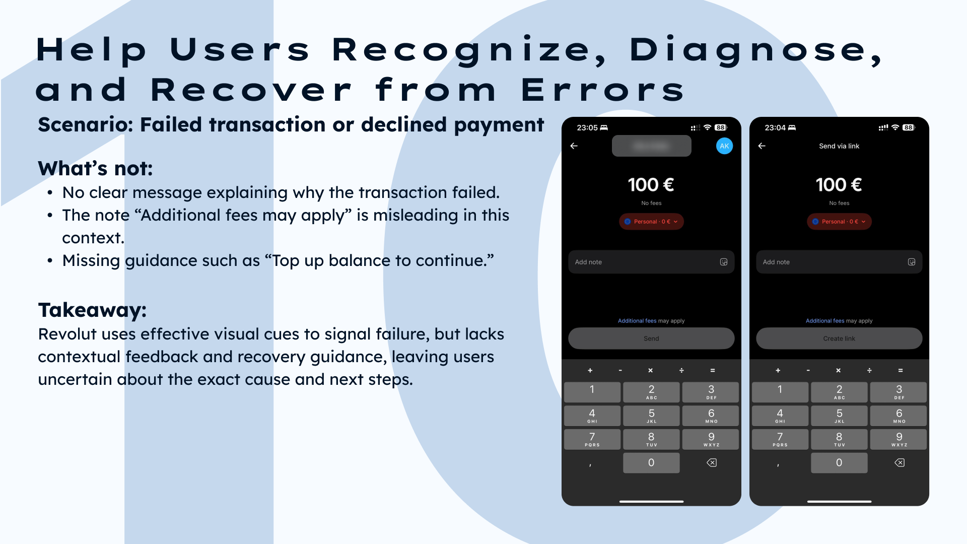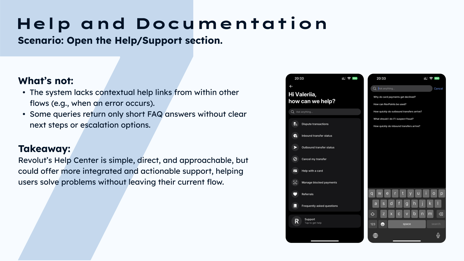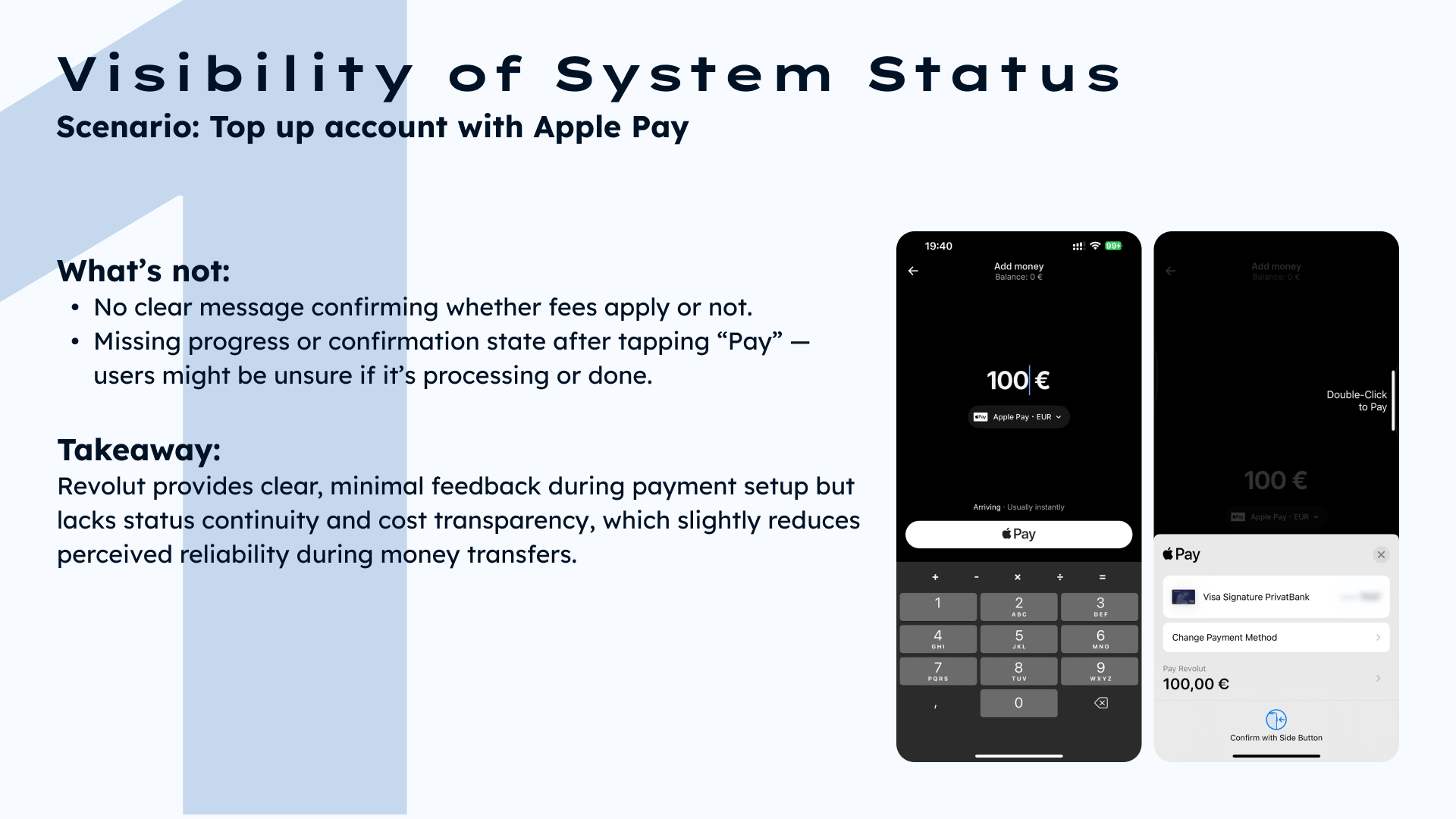 Good job! You can see you approached this systematically and extracted concrete insights. Clear breakdown into scenarios and heuristics, easy to read and find specific issues. This isn't another generic report. You show exactly what and where, not limiting yourself to generics like "poor status visibility". Screenshots with annotations are a plus. Balance between positive and negative – you don't just focus on problems, you show what Revolut does well too. This builds credibility for the analysis.