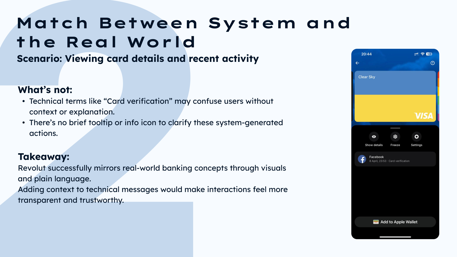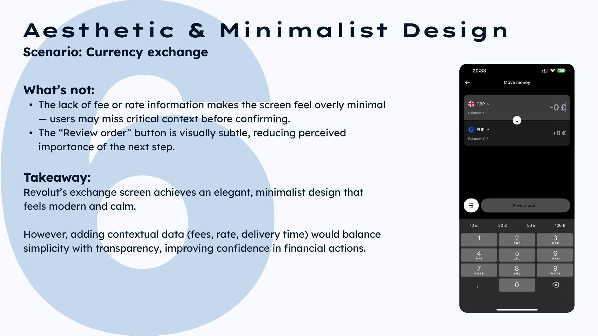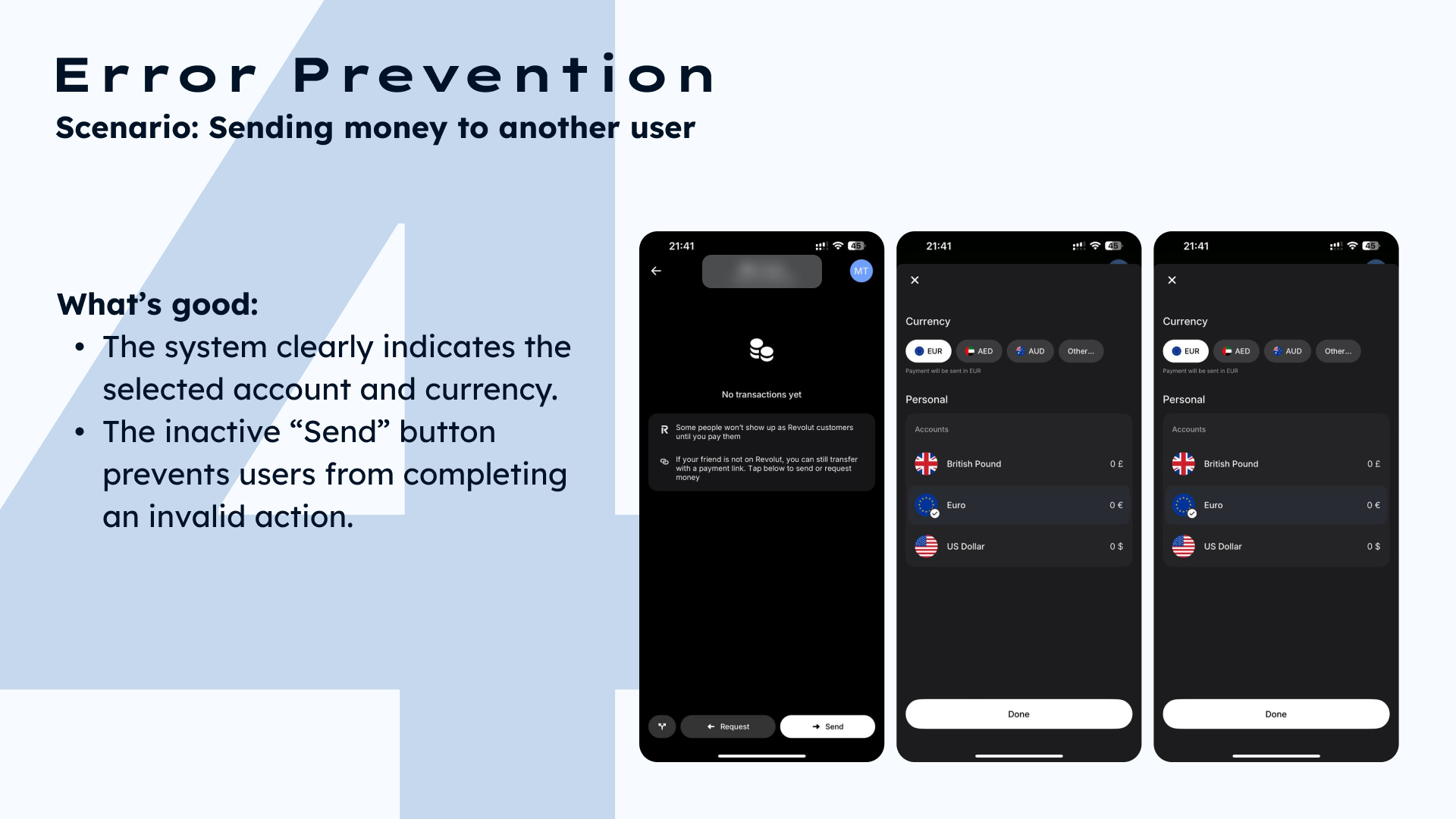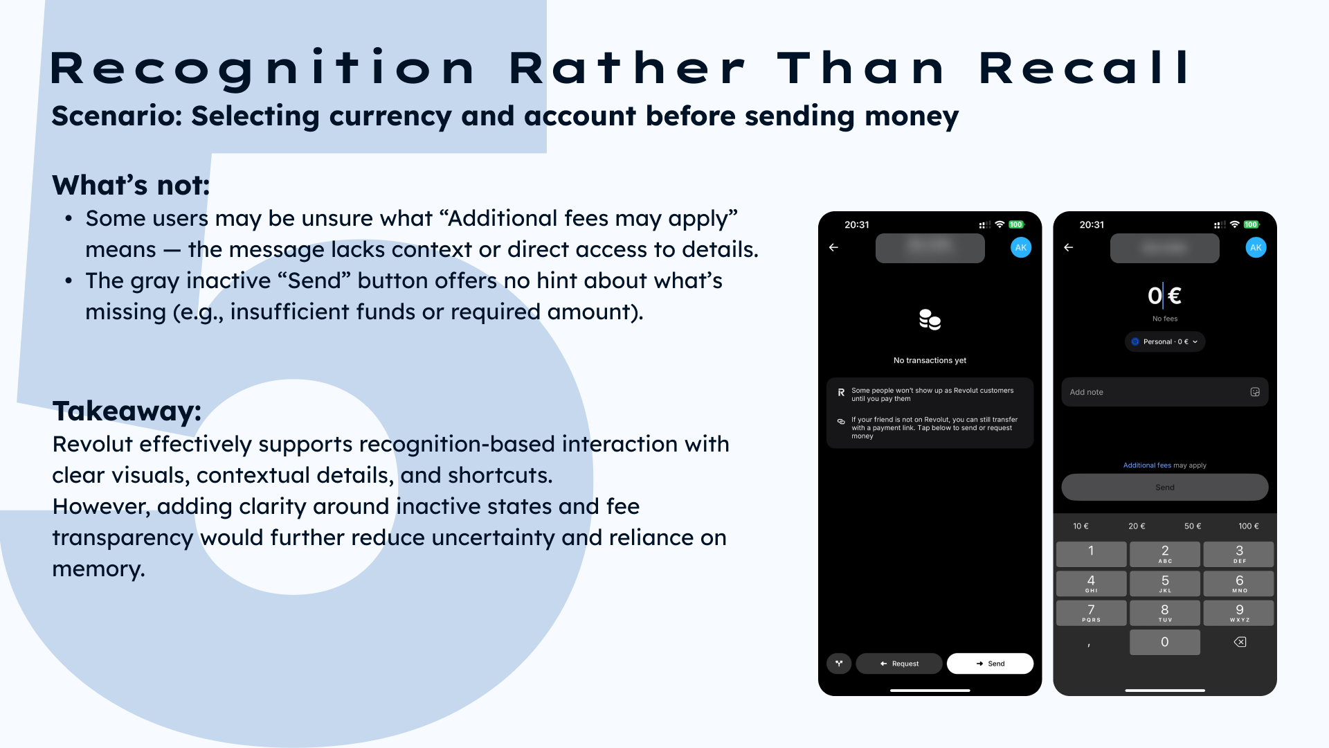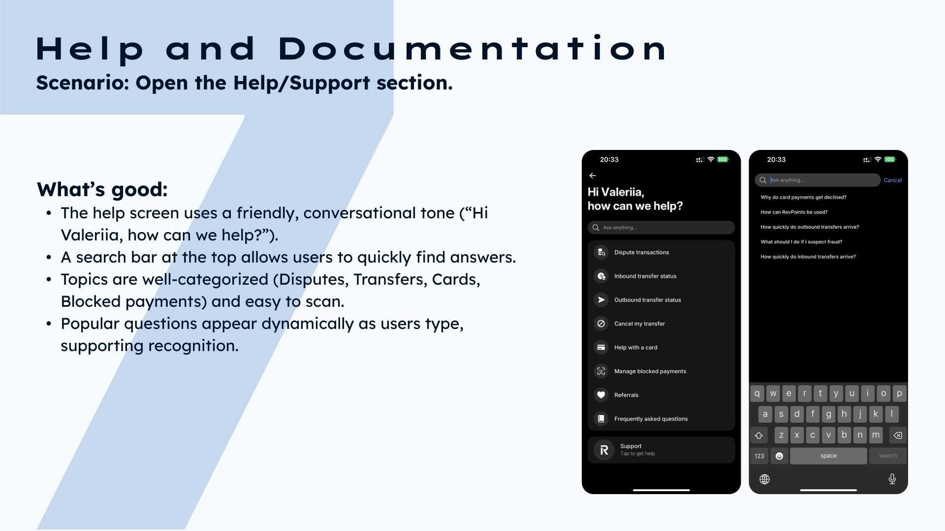 Good job! You can see you approached this systematically and extracted concrete insights. Clear breakdown into scenarios and heuristics, easy to read and find specific issues. This isn't another generic report. You show exactly what and where, not limiting yourself to generics like "poor status visibility". Screenshots with annotations are a plus. Balance between positive and negative – you don't just focus on problems, you show what Revolut does well too. This builds credibility for the analysis.