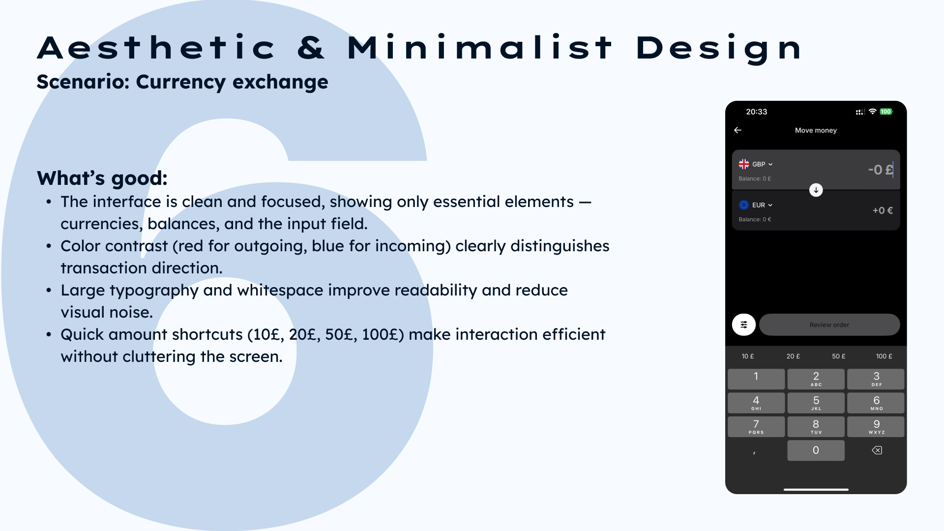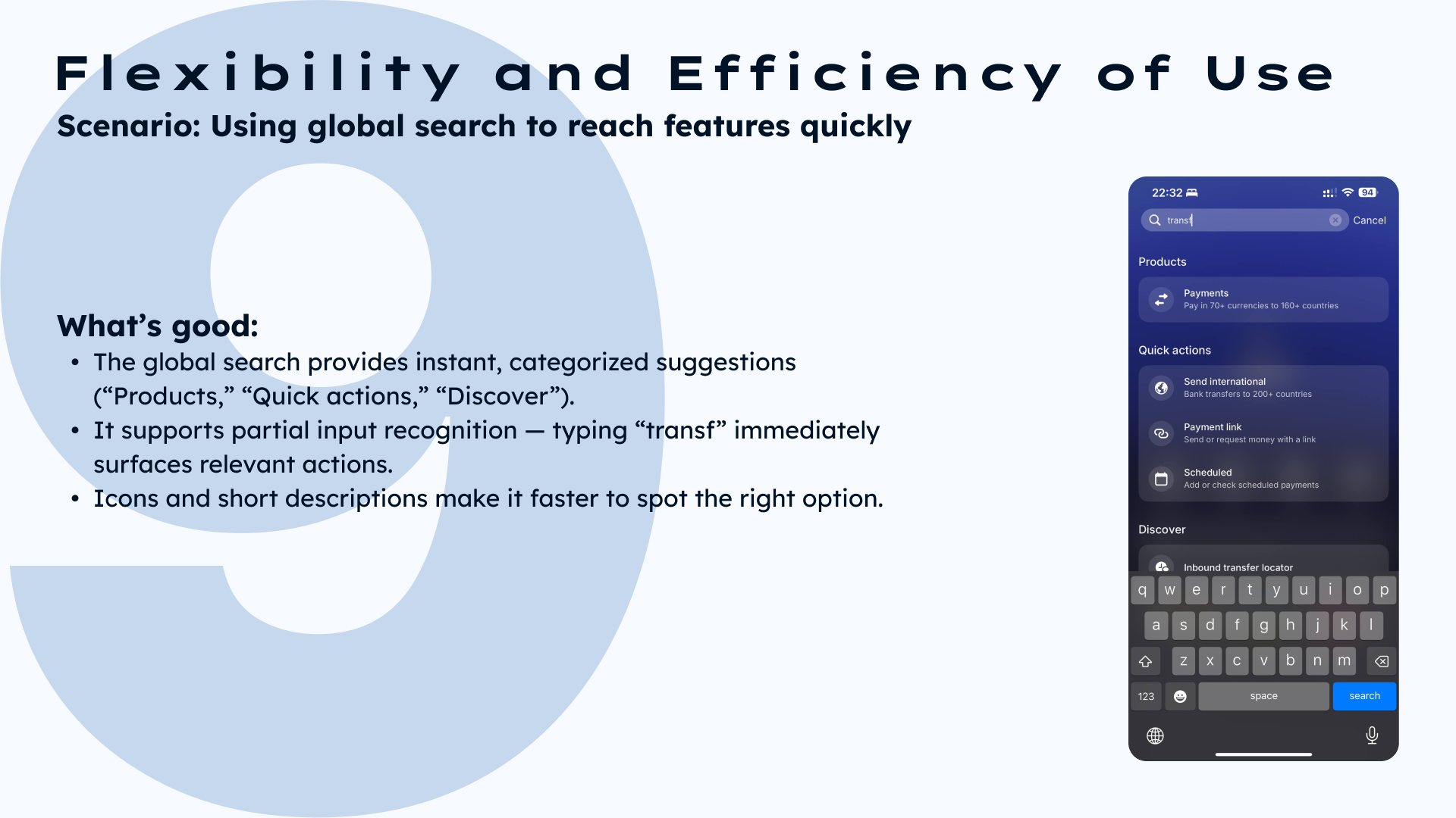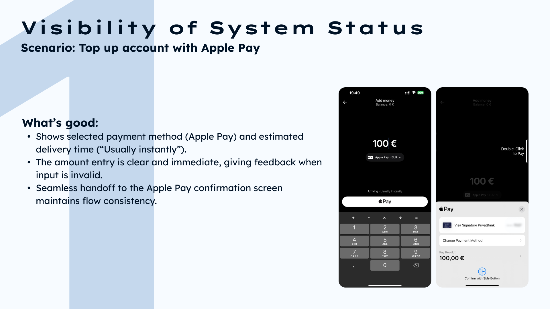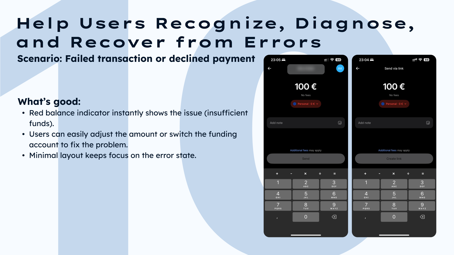 Good job! You can see you approached this systematically and extracted concrete insights. Clear breakdown into scenarios and heuristics, easy to read and find specific issues. This isn't another generic report. You show exactly what and where, not limiting yourself to generics like "poor status visibility". Screenshots with annotations are a plus. Balance between positive and negative – you don't just focus on problems, you show what Revolut does well too. This builds credibility for the analysis.