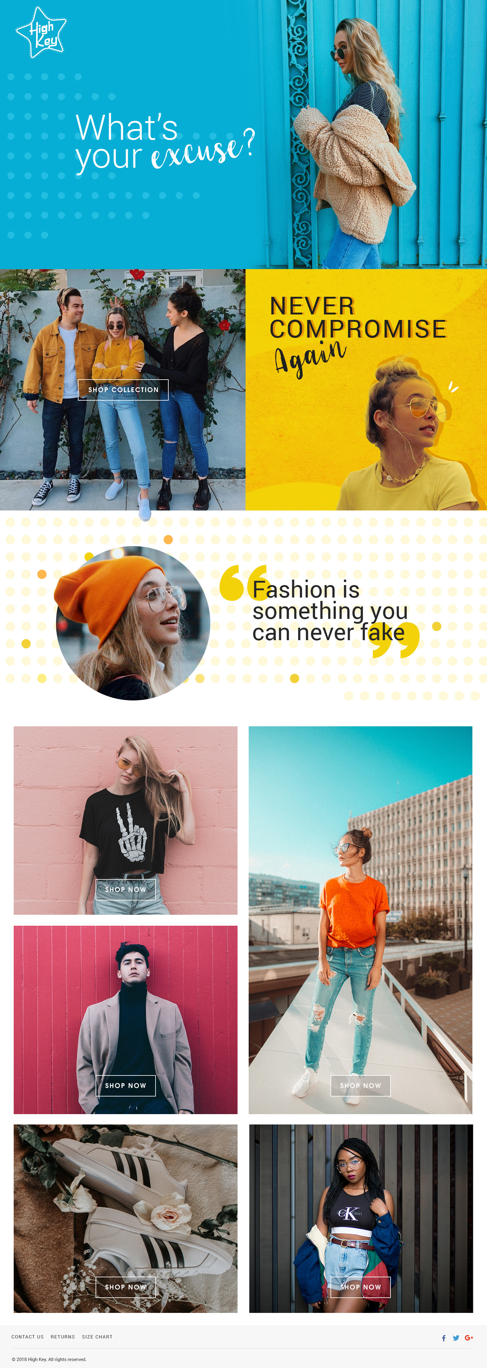 Designed the homepage for High Key, a clothing brand. The layout features prominent "Shop Now" buttons for various clothing categories, creating a straightforward and engaging shopping experience.