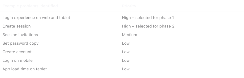 To prioritise the issues, I held cross-functional stakeholder workshops to rate them based on user impact, effort and alignment with business goals. The two most high impact improvements we selected were (1) Login and (2) session creation.