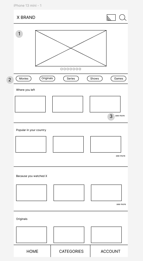 4) I created 4 subcategories to ease the users' job to help them find what they want to watch: Where you left, Popular in your country, Because you watched X and Originals