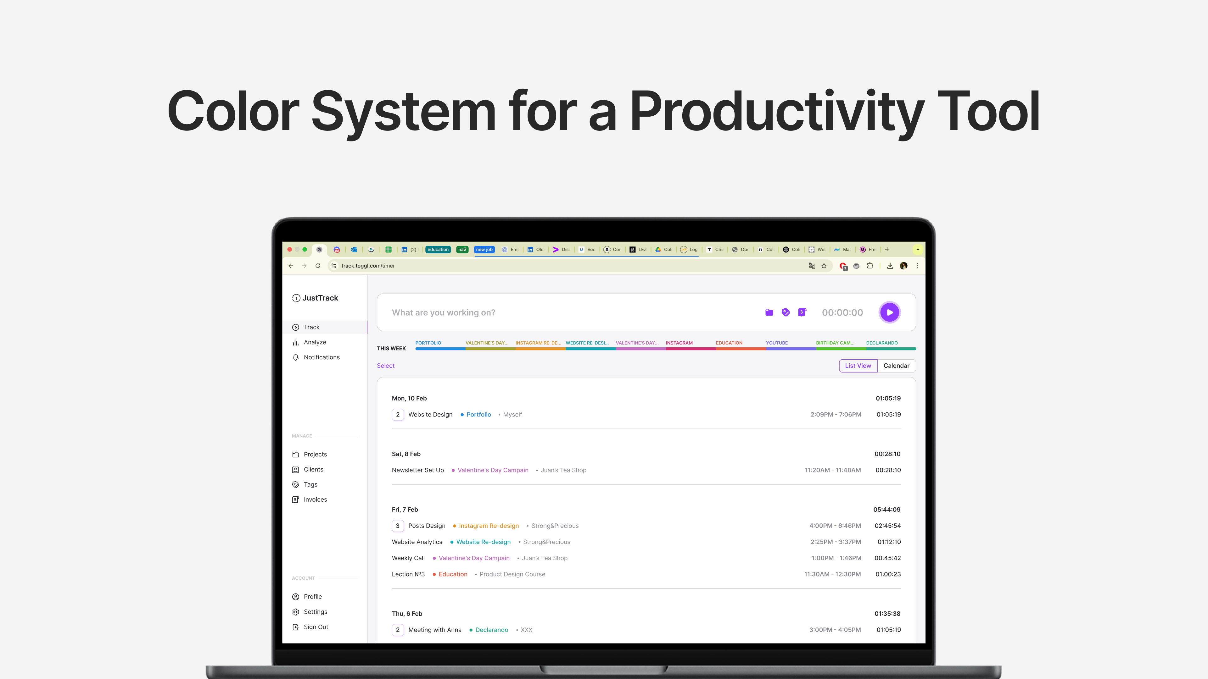 The goal was to build a color system tailored for a productivity tool that supports productivity and clarity. I chose ToggleTrack as the base and briefly re-designed the web version of it.