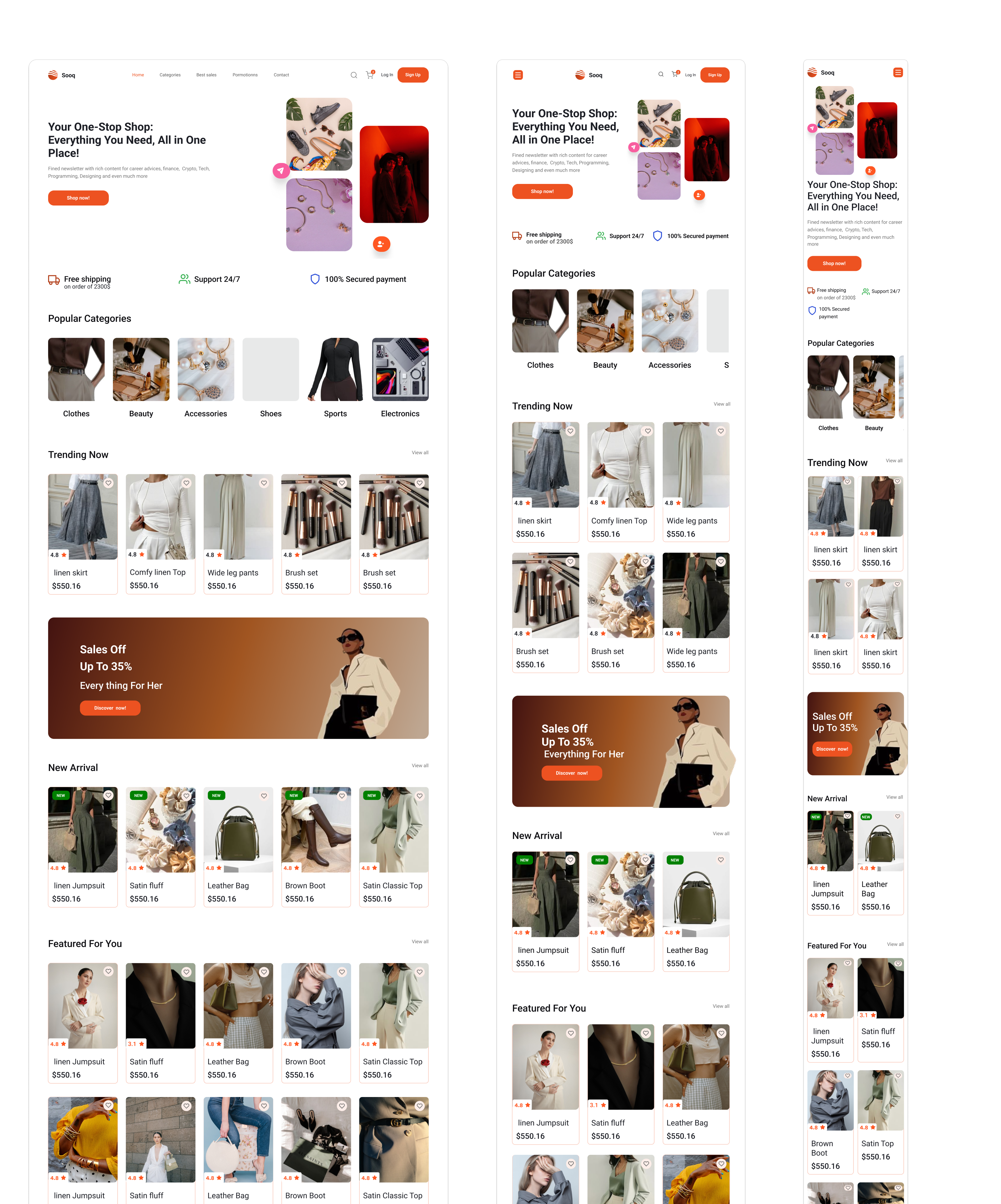 - Trending & New Arrivals: Displays featured and recently added products in grids or sliders.