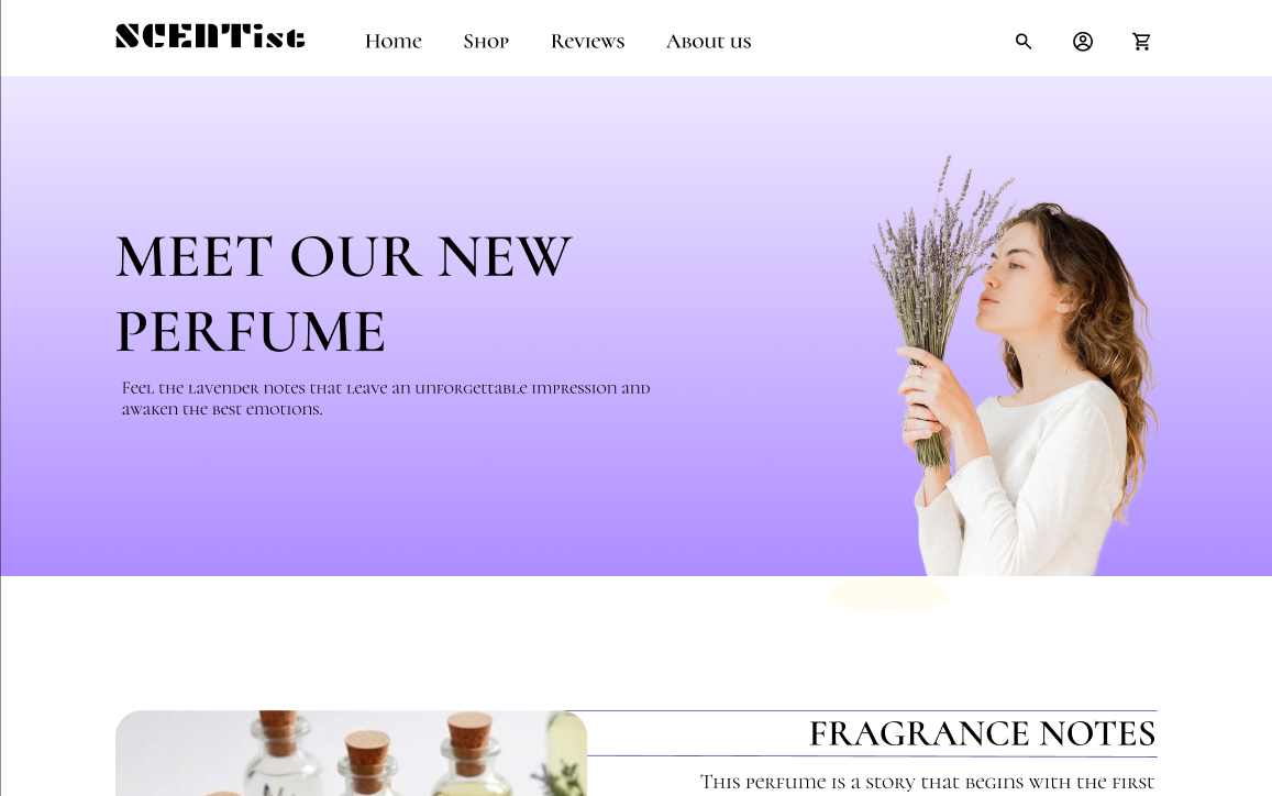 In this Design brief, a desktop-oriented landing page was created for a fictional company SCENTist, which specializes in perfumes. The goal is to promote a new fragrance. Purple was chosen as the main color because it conveys a feeling of sophistication and interlaces with the main note of perfume: lavender.