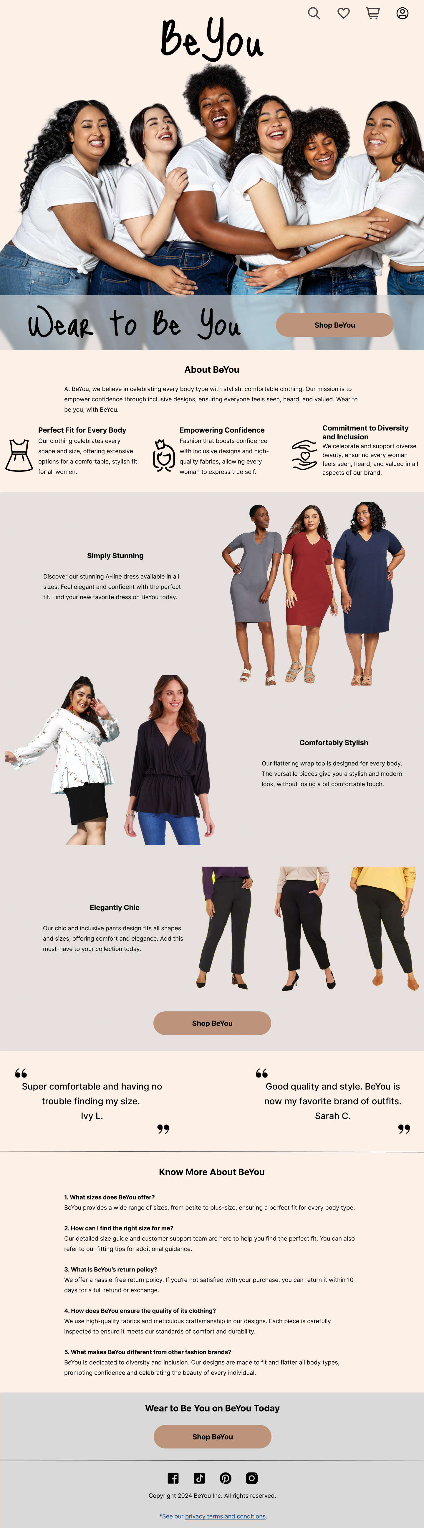 This landing page is for a fictional fashion brand called “BeYou”, providing comfortable and stylish clothing for diverse body size.