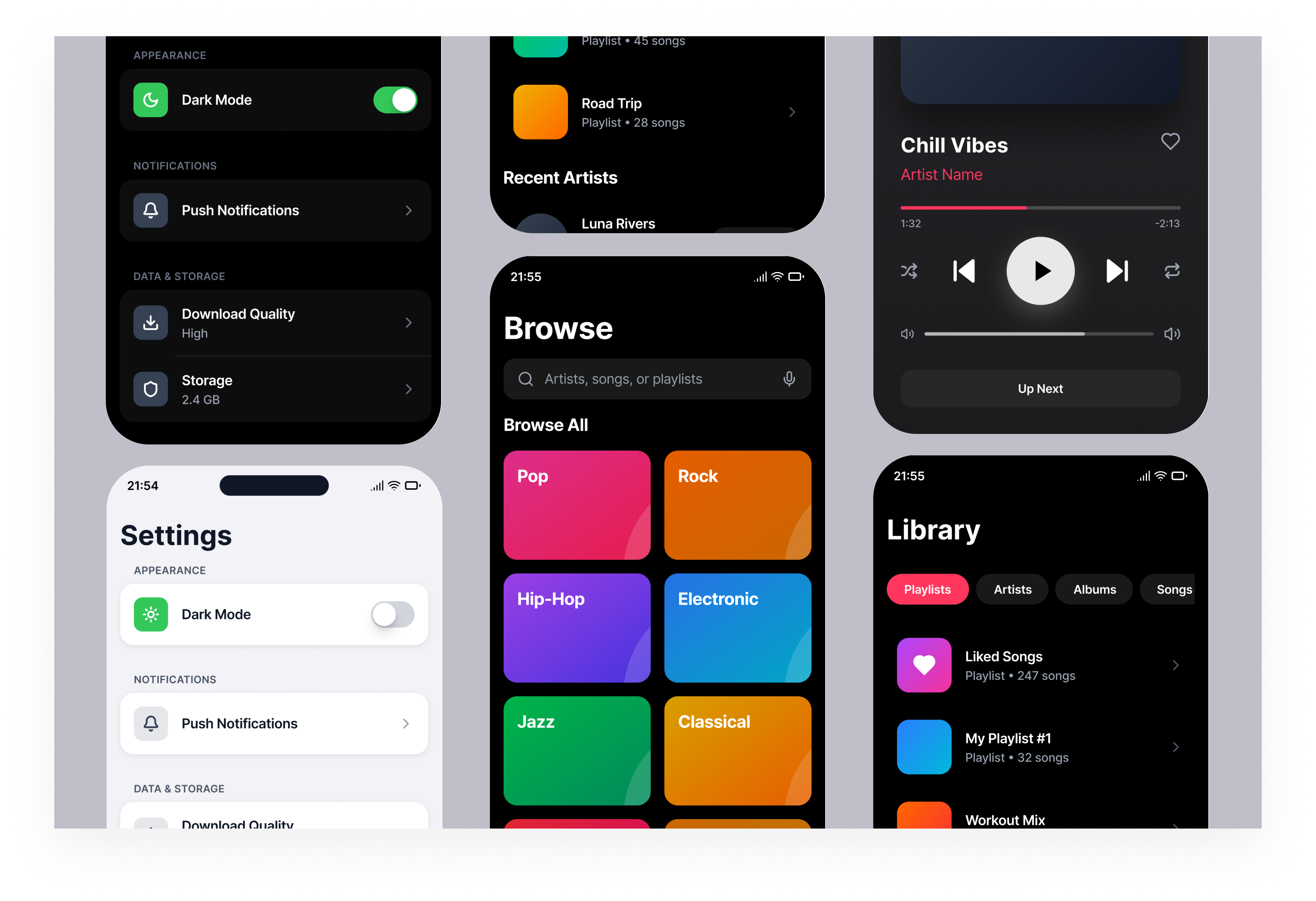 This project explores how a music streaming app can adapt naturally between light and dark mode.