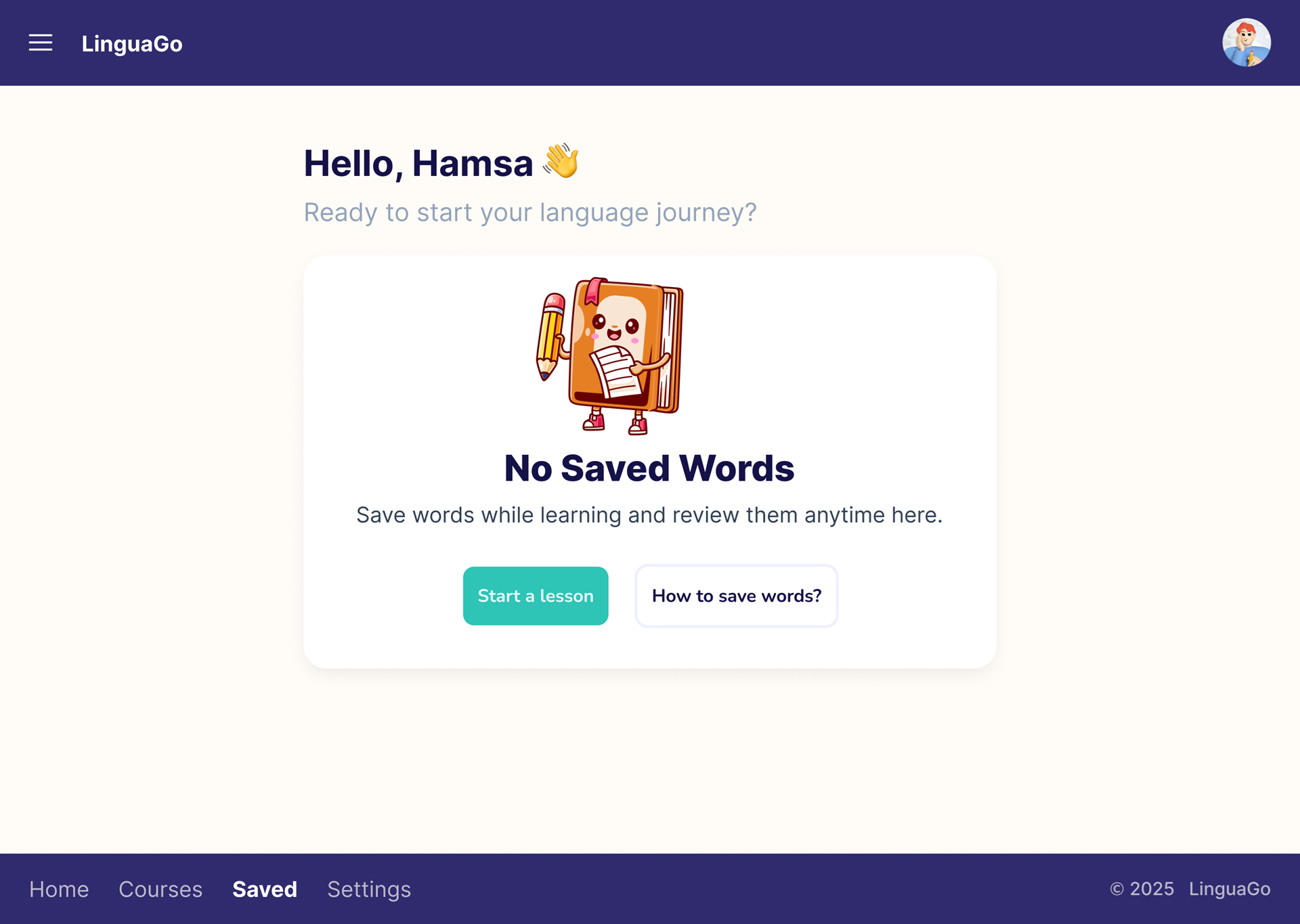 - Actions: “Start a Lesson” (primary) and “How to save words?” (secondary help link).