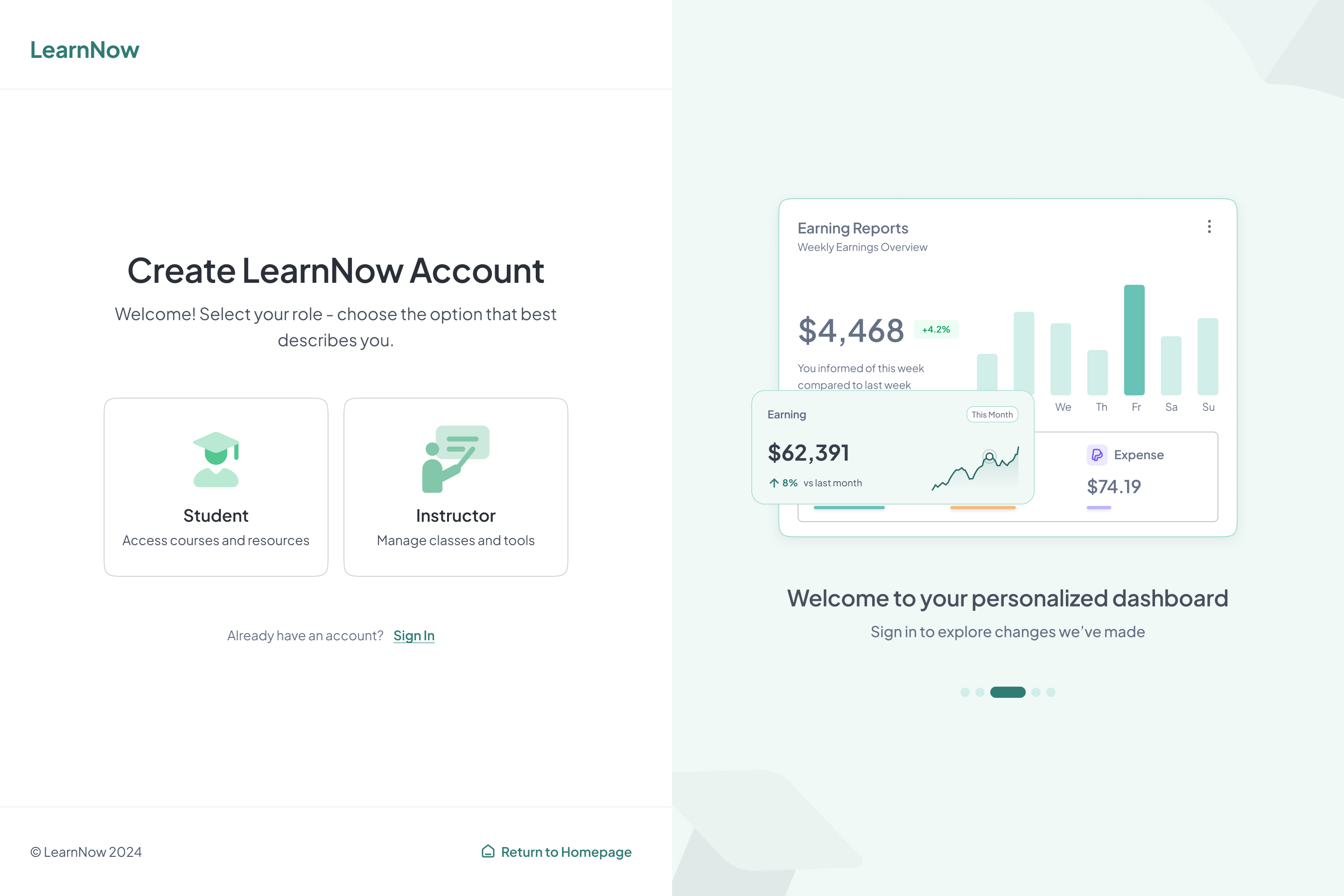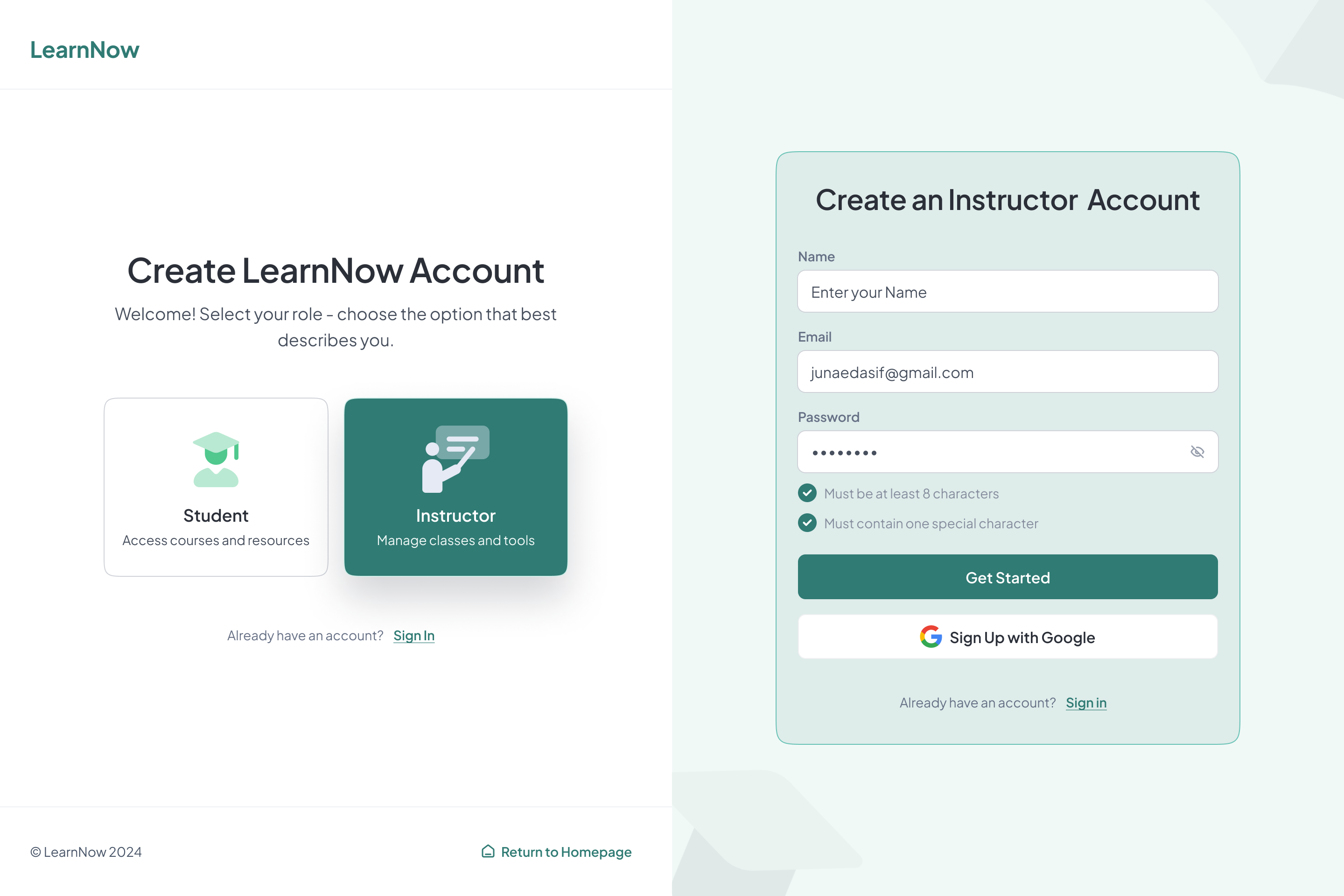 New Account Creation Page for Learning Management System (LMS) Web Application.
