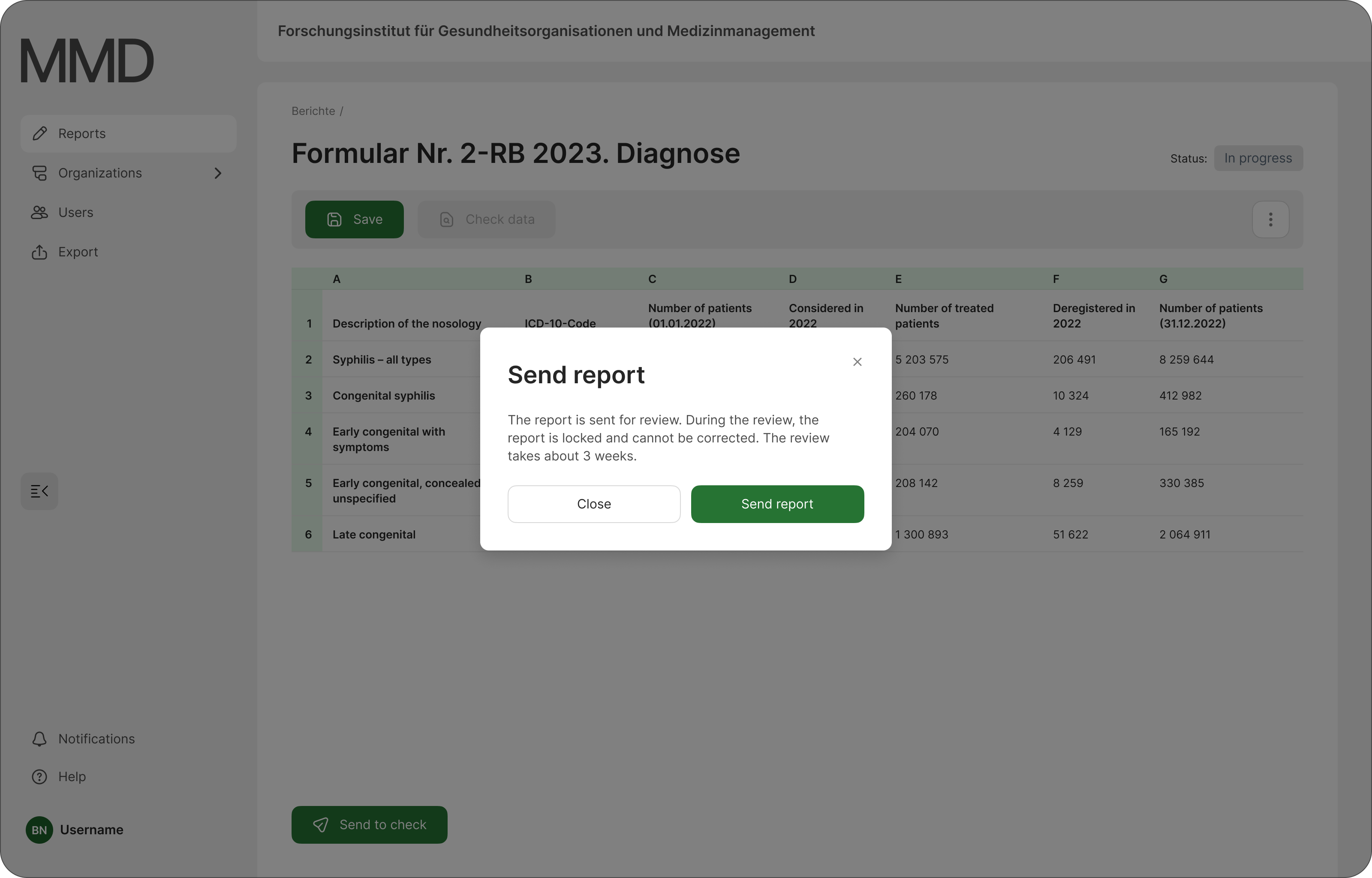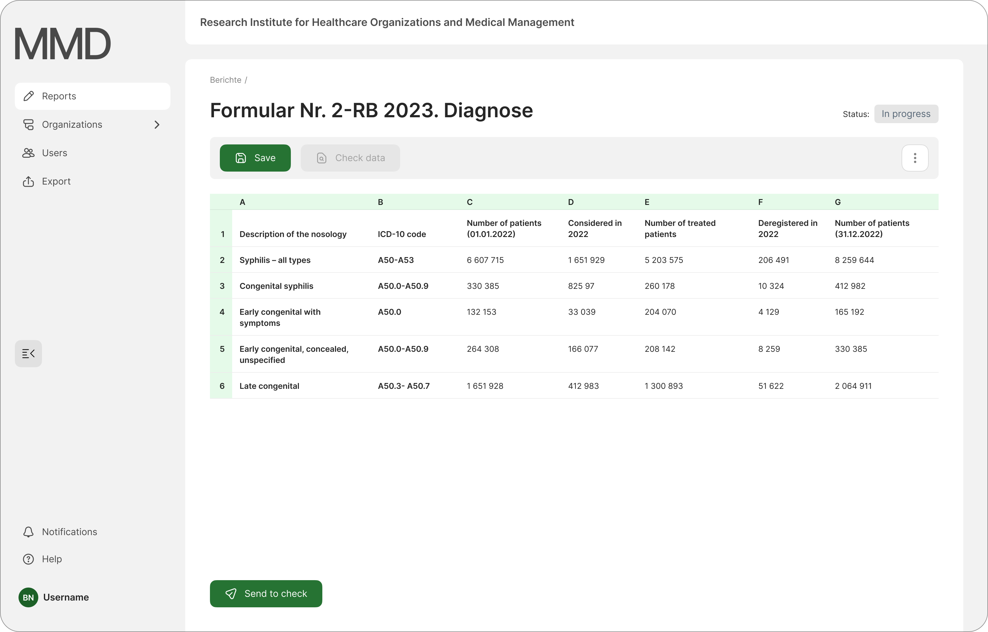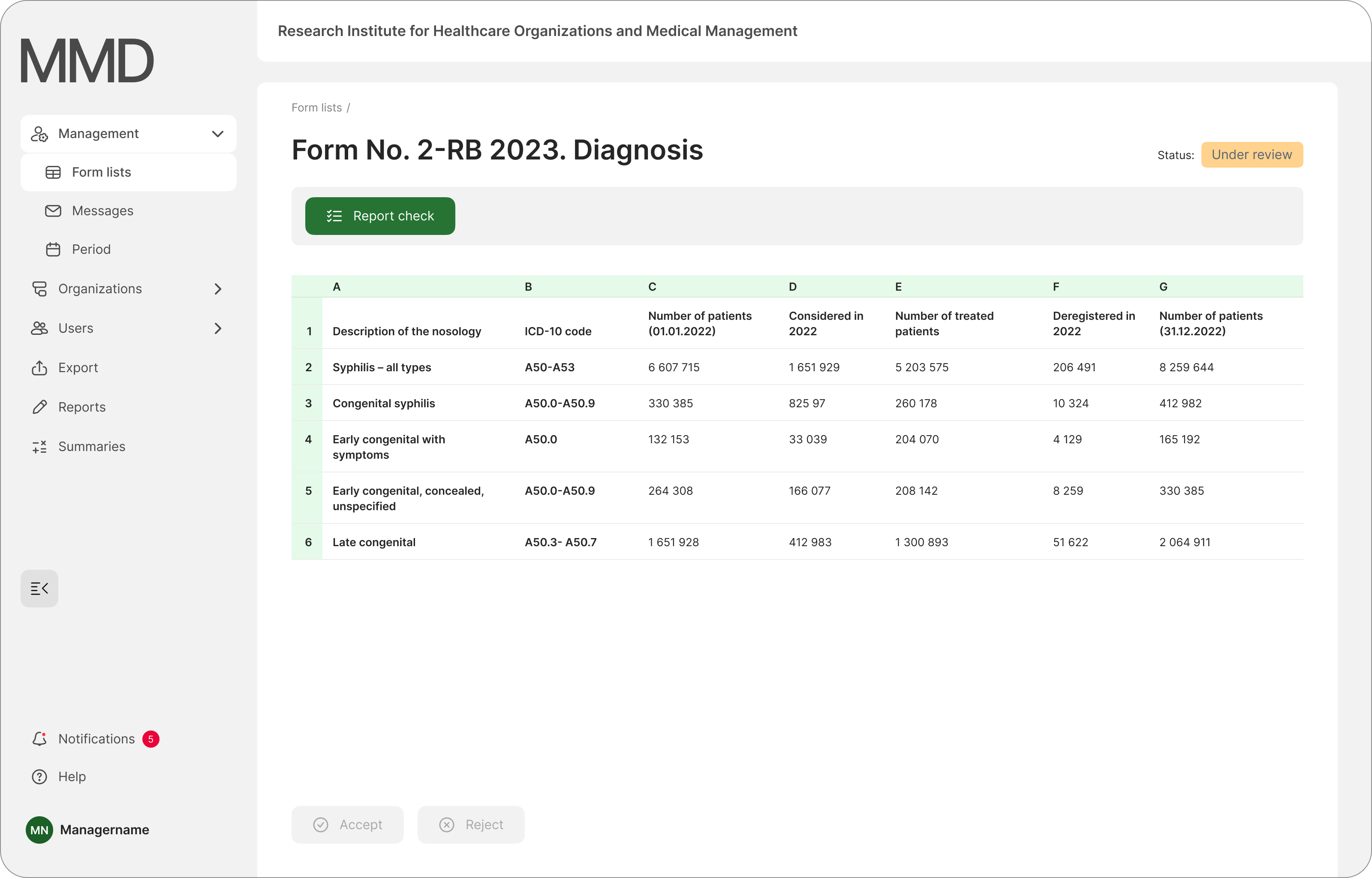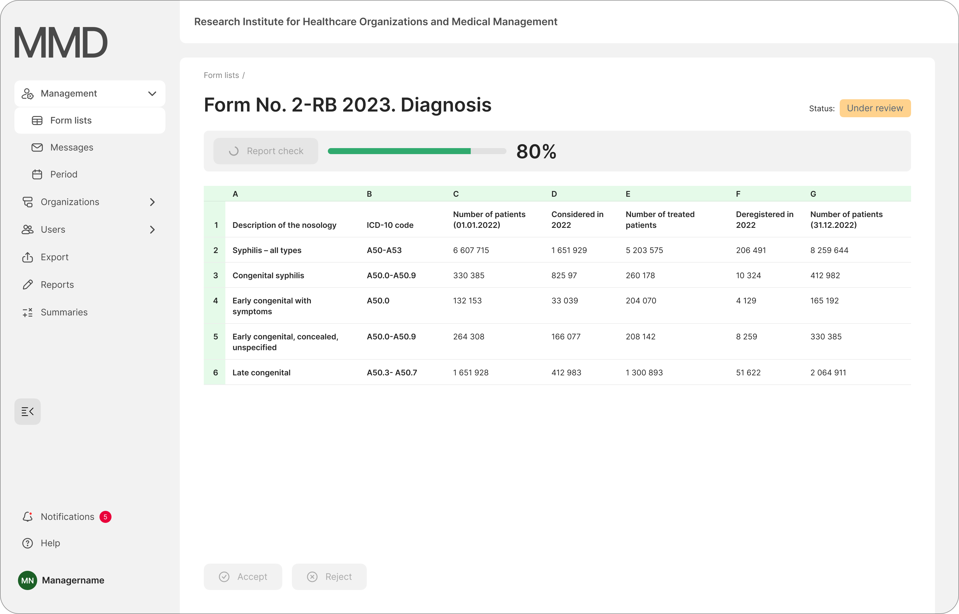 System for processing reports from medical organizations. It enables the collection of data from medical organizations in a central location, the processing of reports, the collection of statistics and the monitoring of subordinate medical facilities.