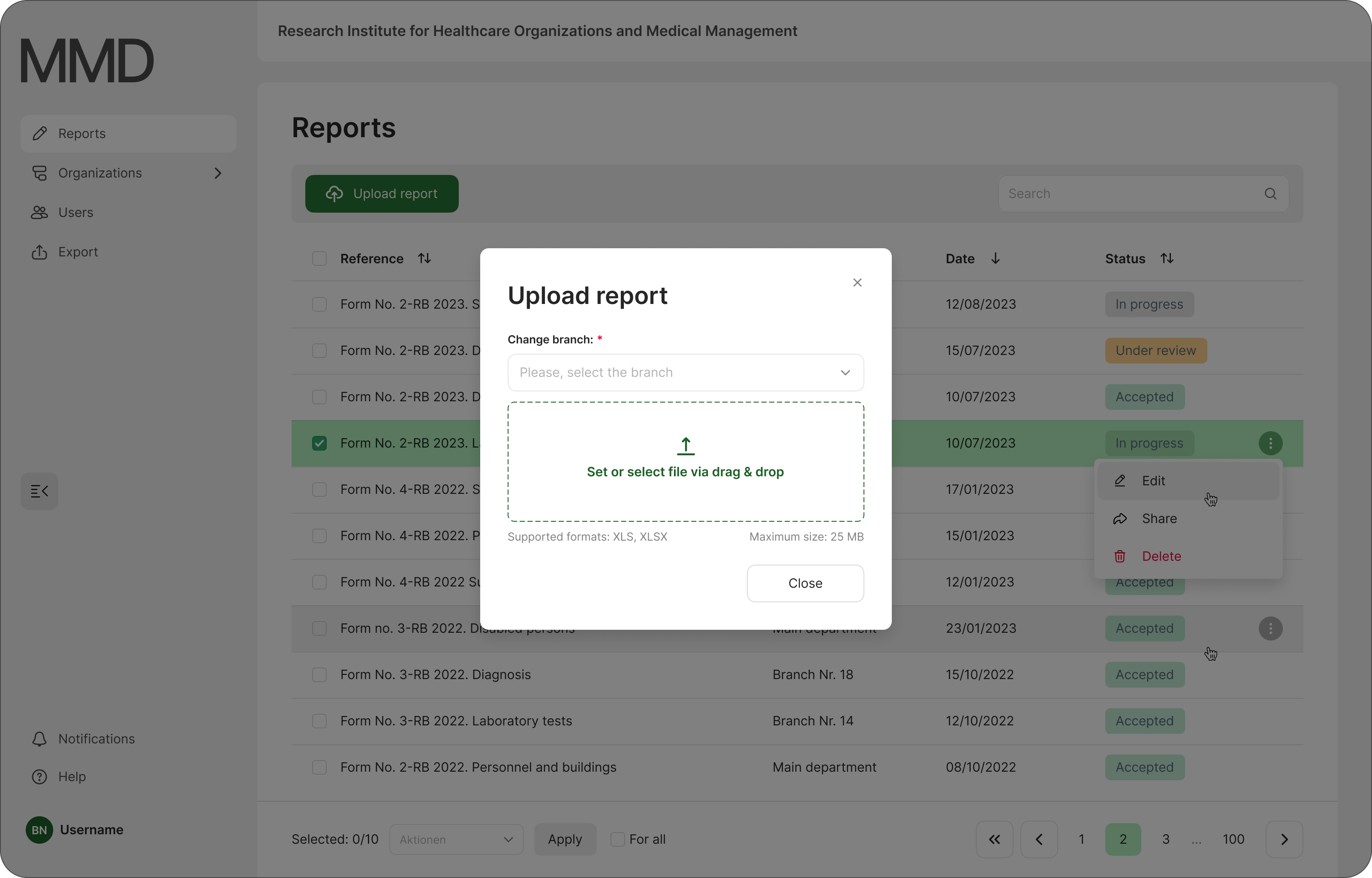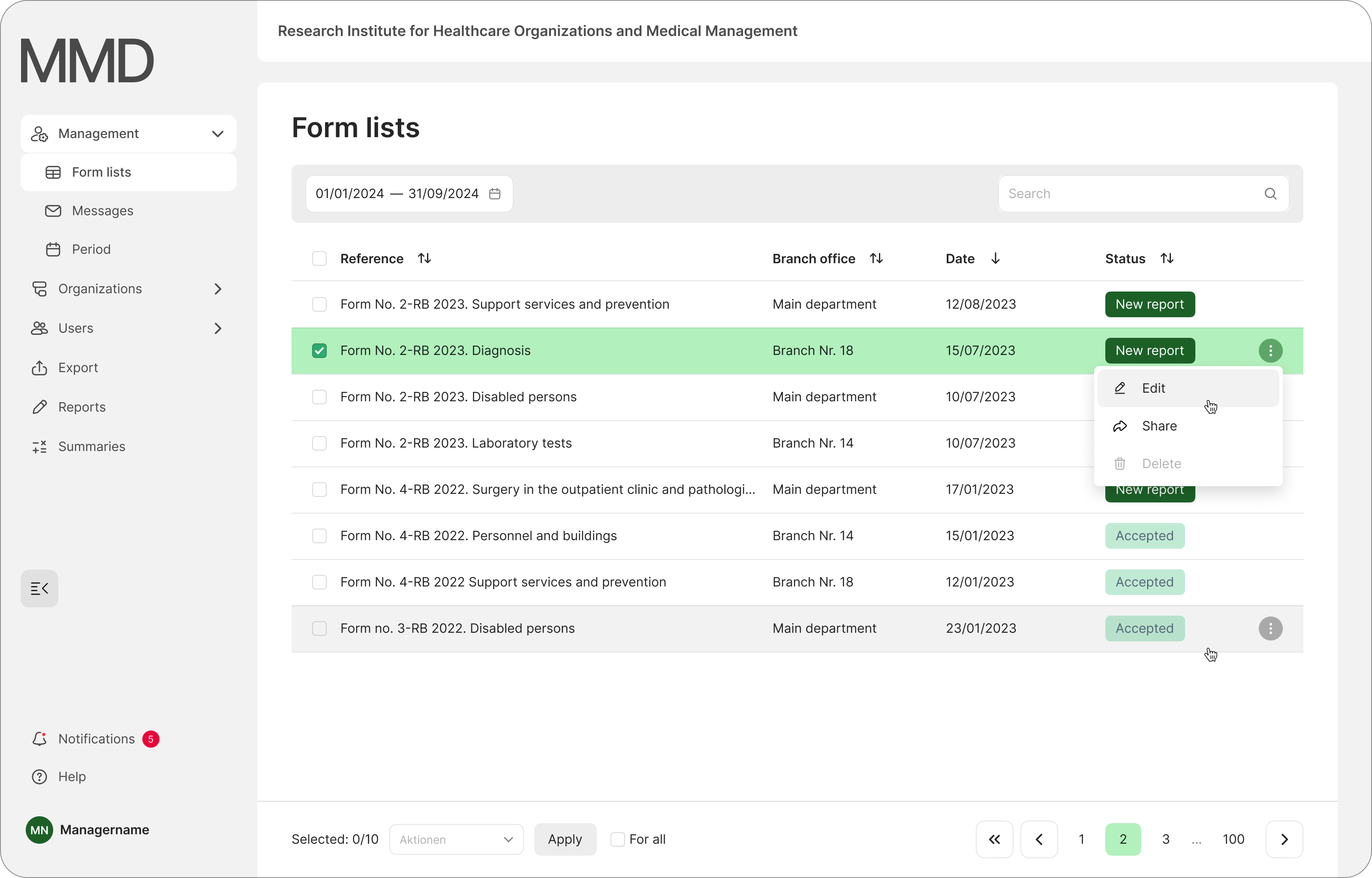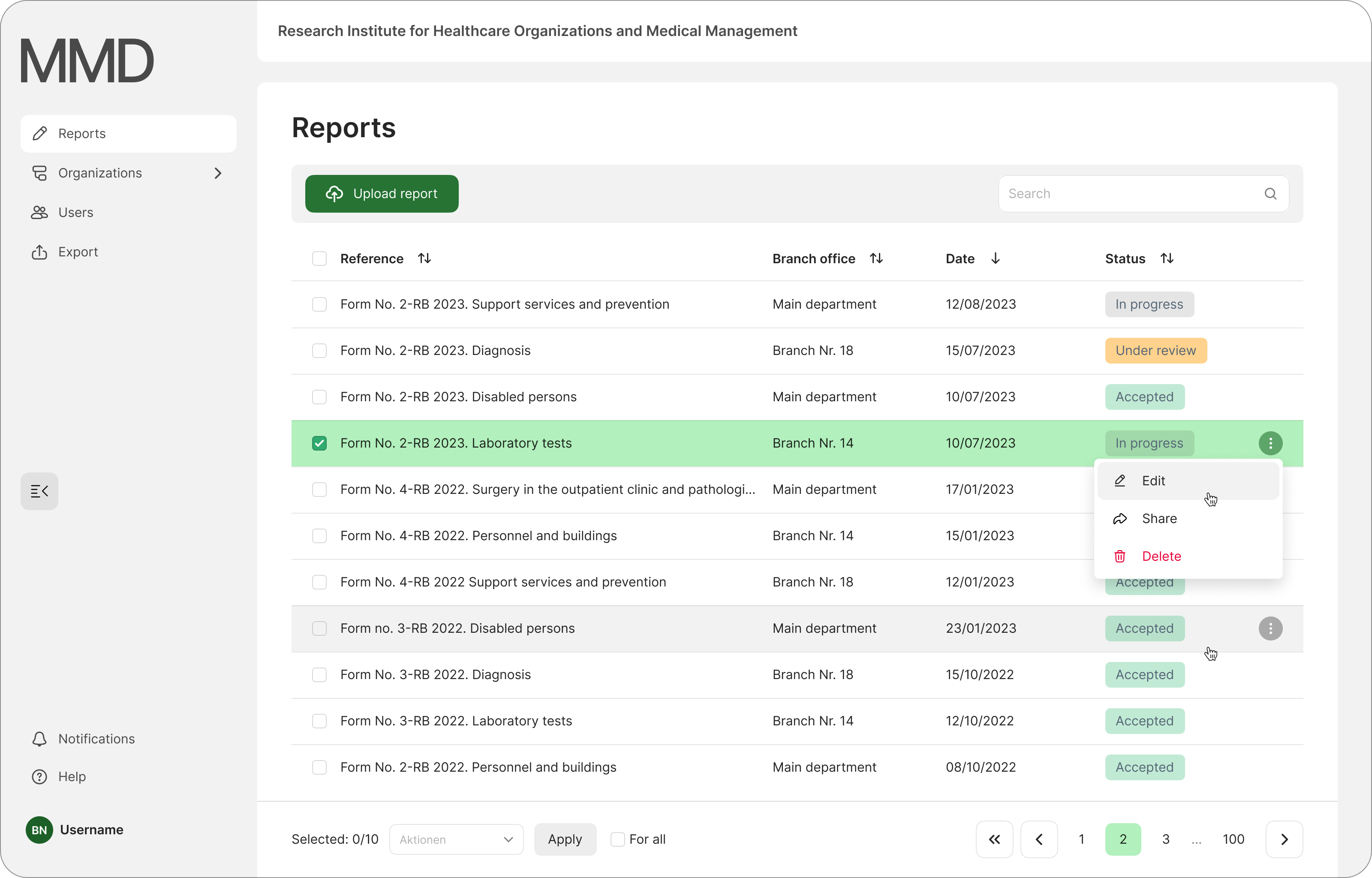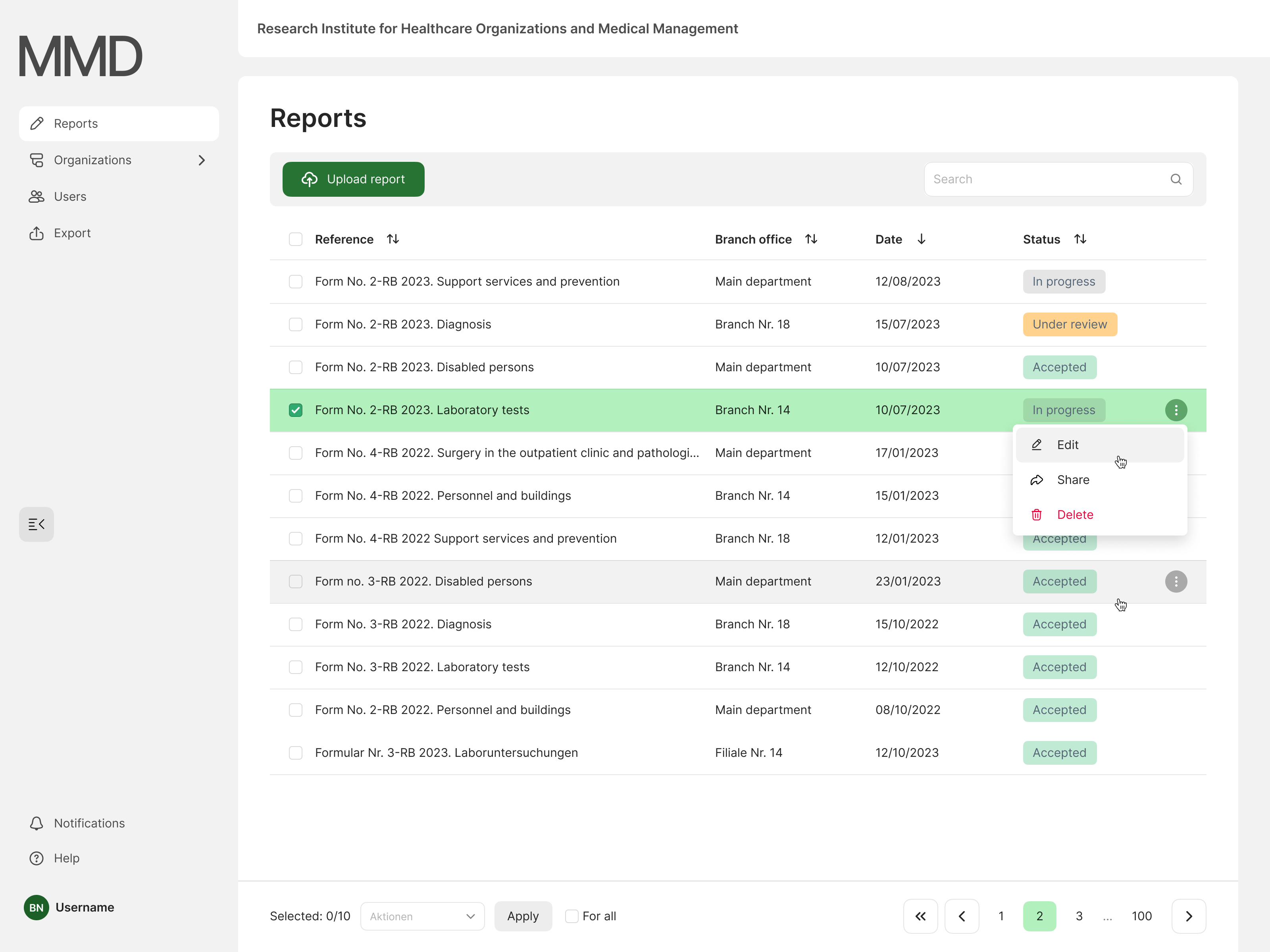 A list of all reports from the medical facility. The following functions are available to the user: Download report, Share report, Go back to edit report, Delete report