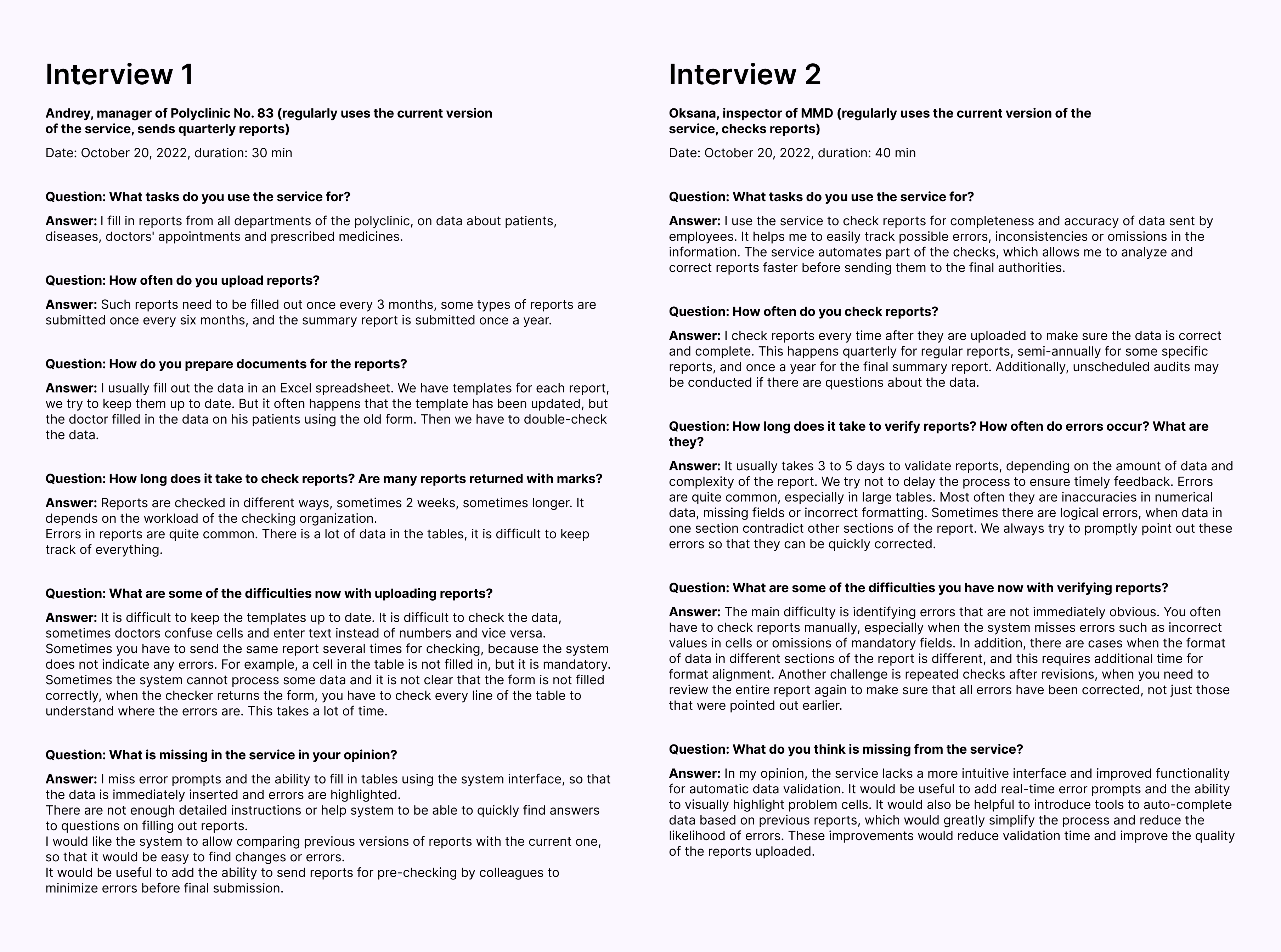 To analyze the target group, I conducted several in-depth interviews. In our system, the users have two roles: the head of the polyclinic who sends the report and the head of the administrative organization who reviews the report. During the interviews, the main problems of the users were identified.