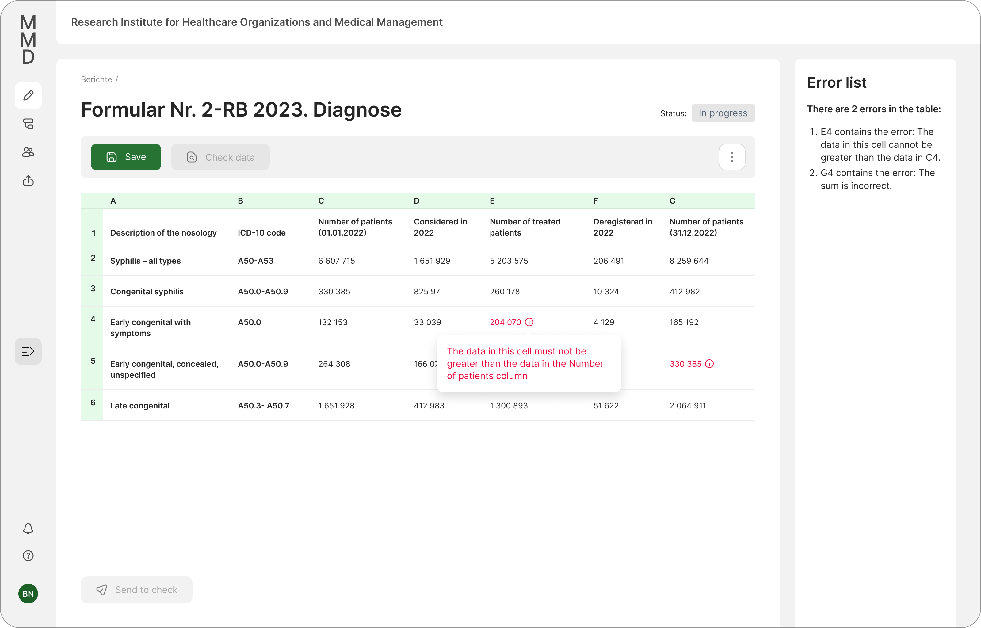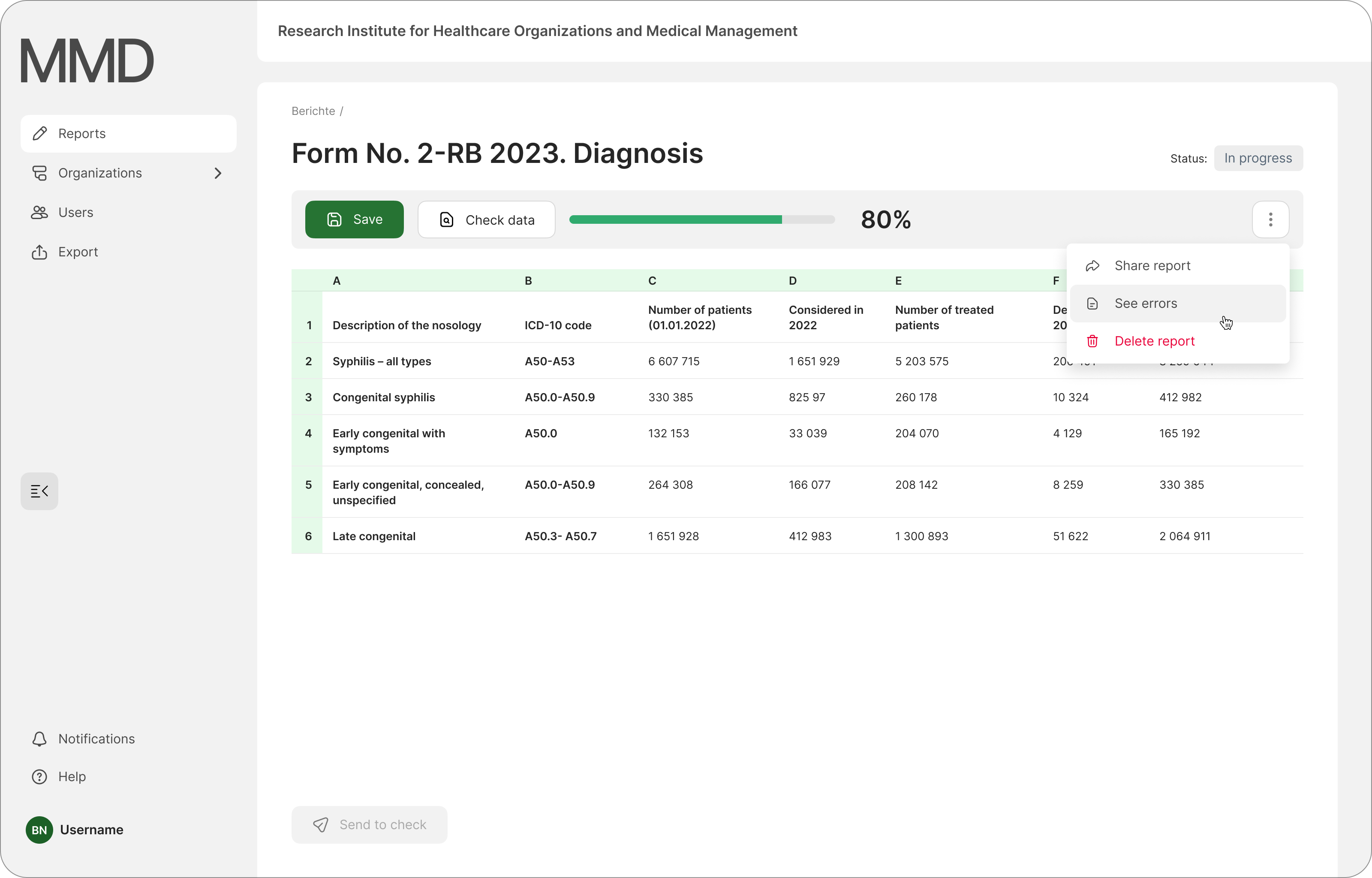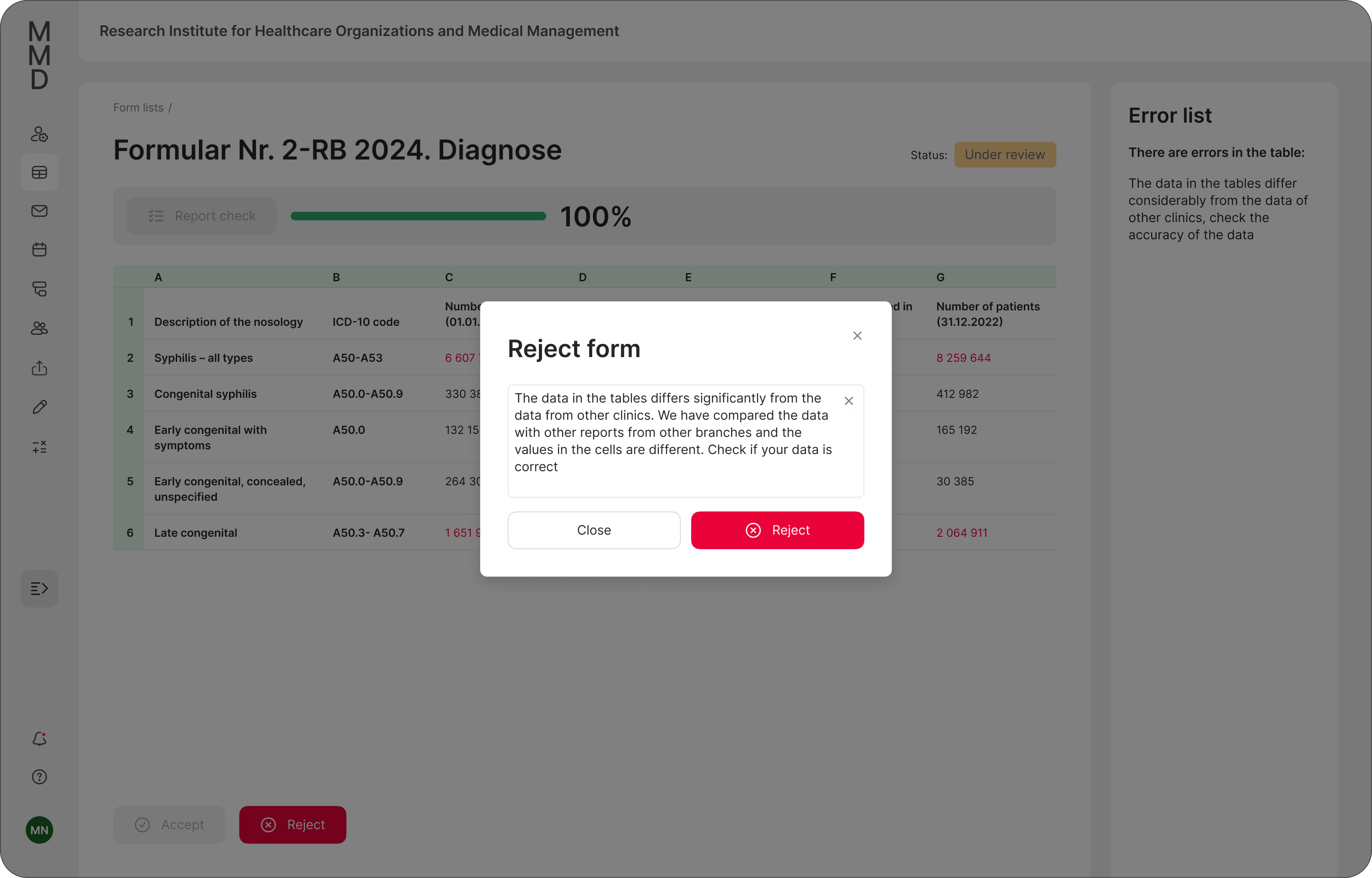 It is necessary to create a system with which medical organizations can send reports to control organizations. Since such reports used to be sent according to rapidly outdated templates, a lot of work had to be done manually. The system helps to automate the report processing and at the same time not to overload the managers of medical organizations when filling out reports. It was necessary to create such a system that would allow managers to intuitively understand how to upload various reports, detect errors in the reports and quickly correct them.