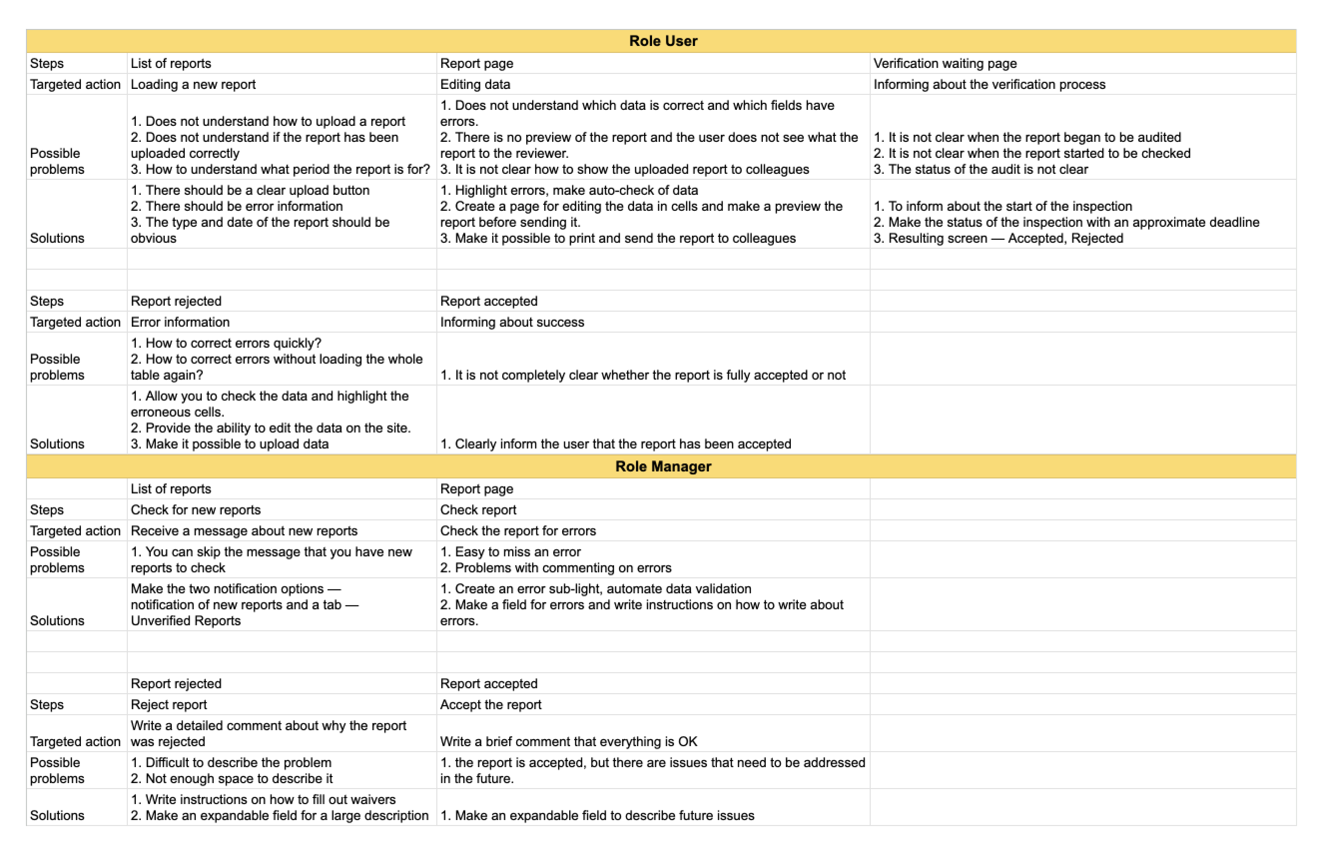 I analyzed the difficulties users face and developed several hypotheses to avoid potential problems. As the service includes two different usage scenarios for different user roles, I created a table describing the main interactions between the user and the system.