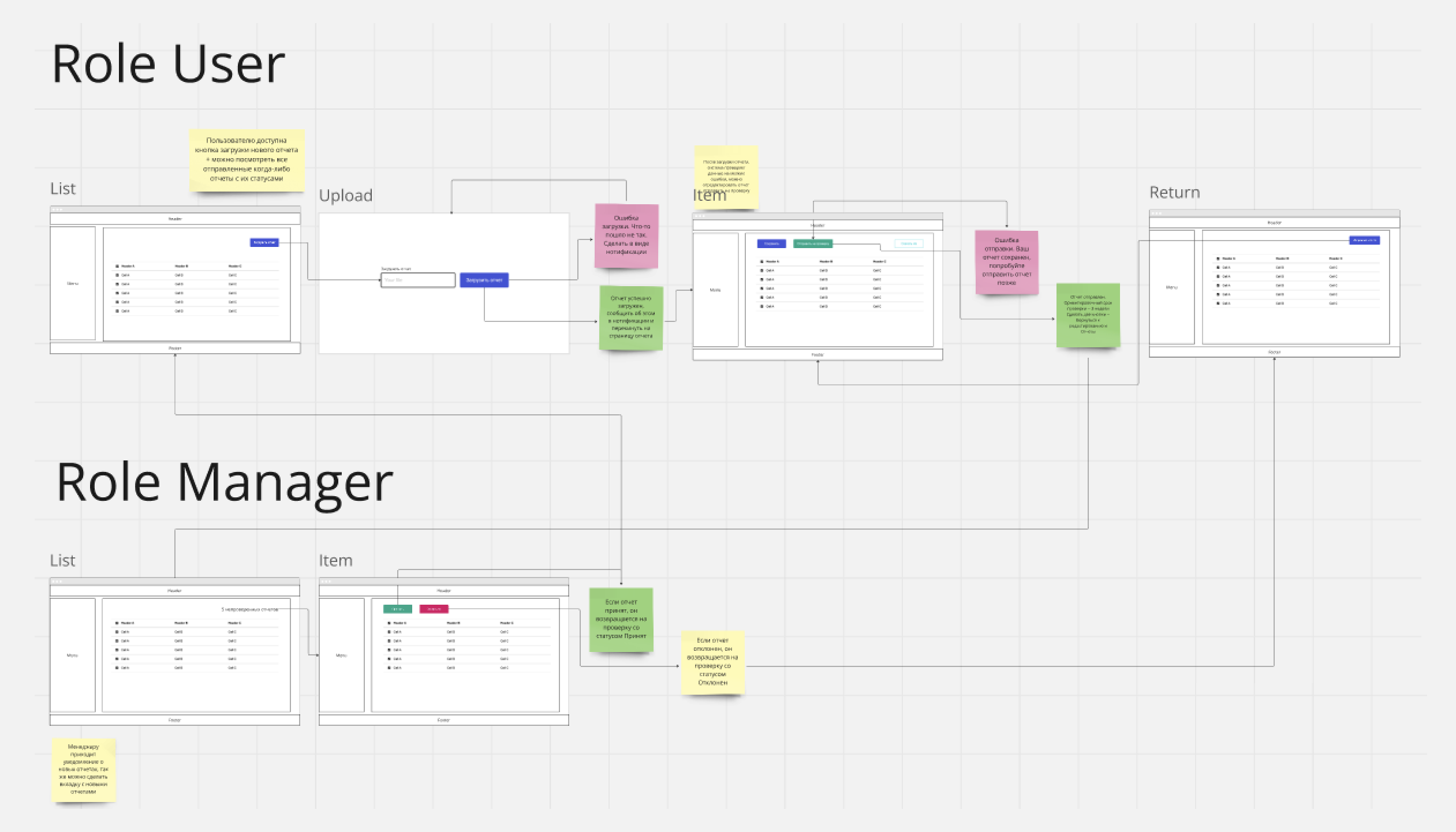 To describe the screens, I used Wireflow — a combination of wireframe and userflow functionality. In Miro, I described the main screens in detail and visualized how the elements interact depending on the user role and scenario.