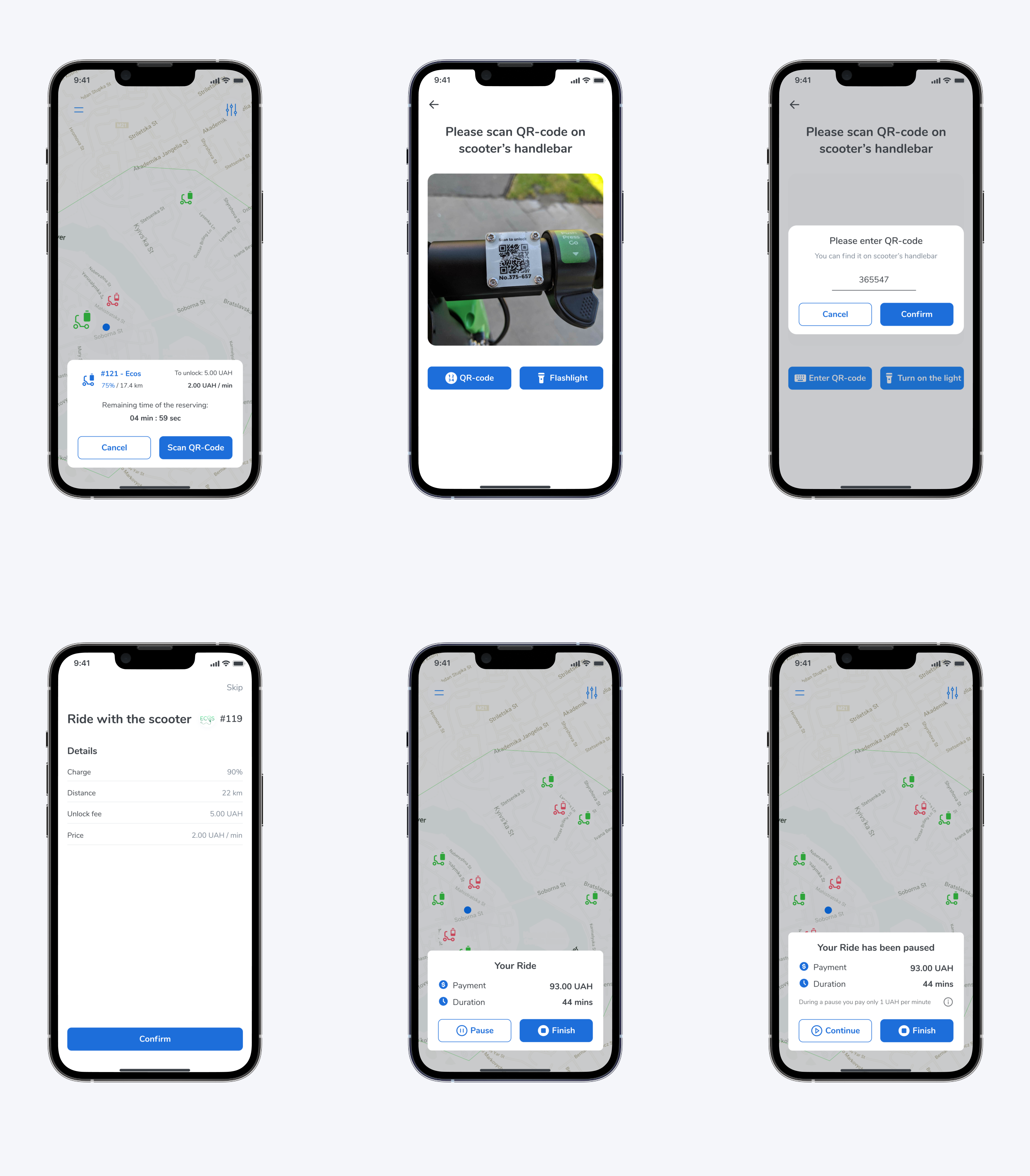 This is a really brilliant idea, putting all the different scooter rental companies into one app for easy access by users. The designs are also really well executed.
