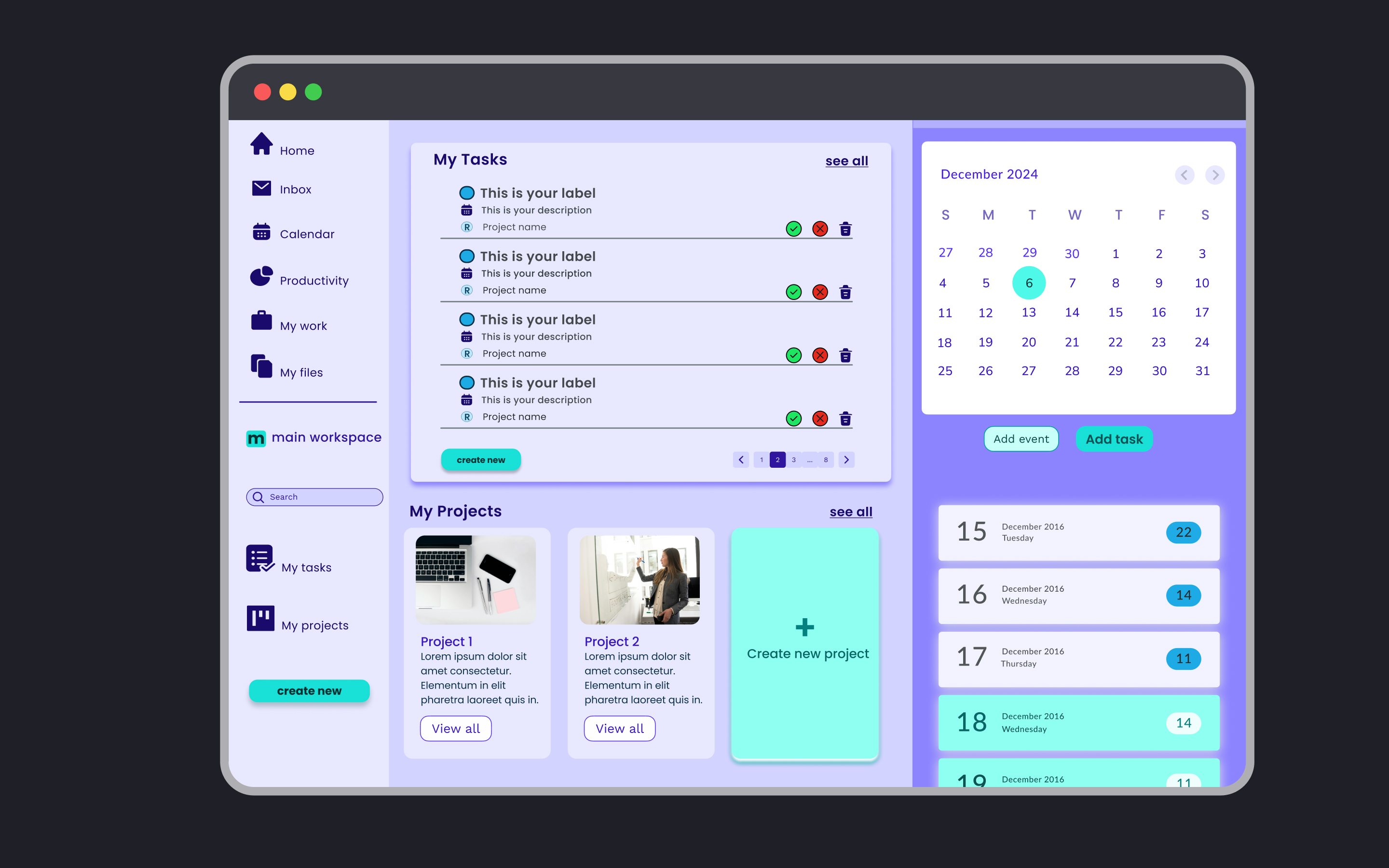 Also, colors are directional. What I mean here is that designer should us colors to draw attention to certain elements, while creating a sense of balance on the overall design. In your design, the purple pane on the right side seems to draw more attention (because of its contrast) to the calendar and daily task counter, instead of the central part of the page, which I think is more important. I think you may want to be more cautious when using deep-colored backgrounds on secondary elements of your design.