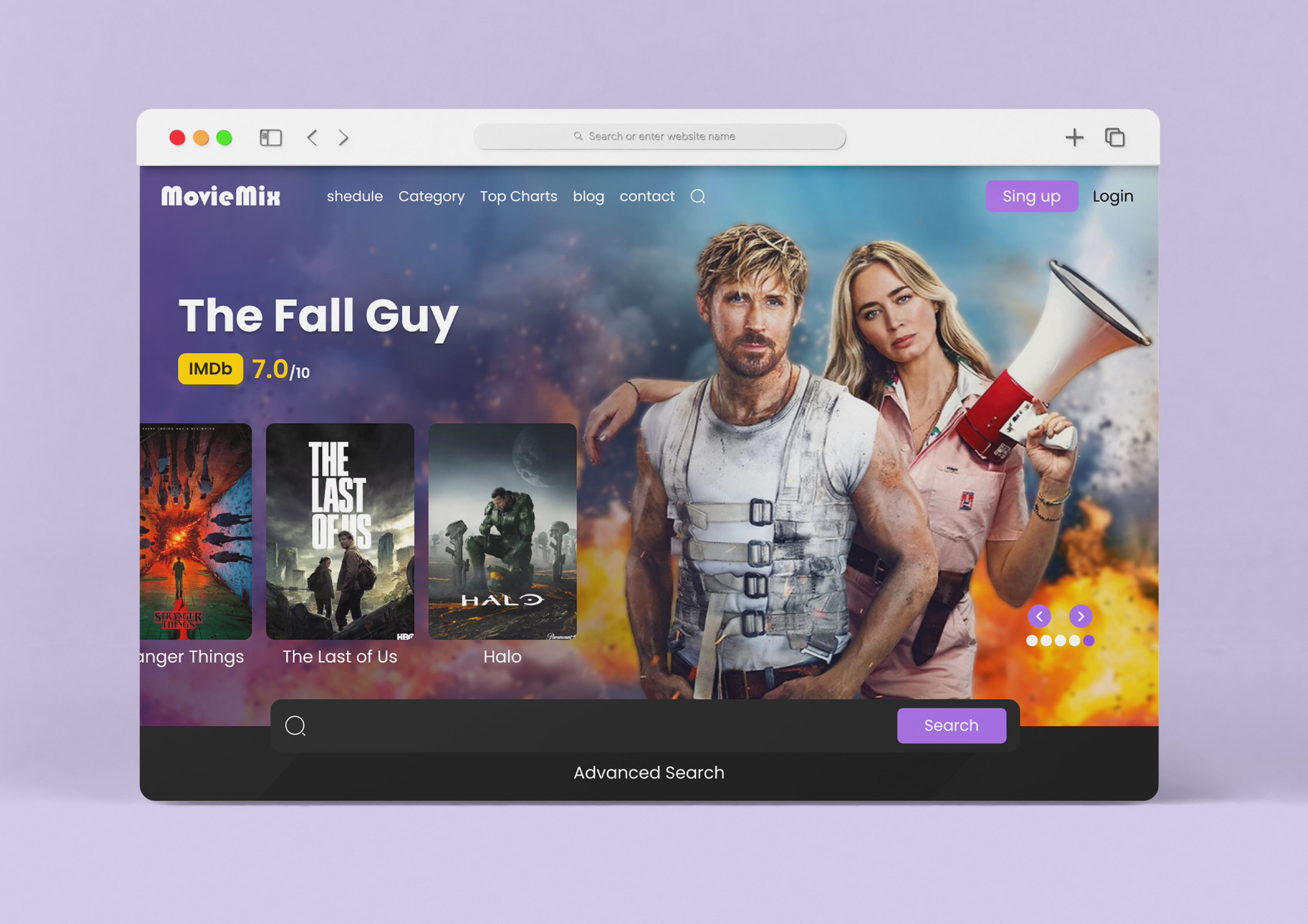 Things you might want to have another look at, with the links in the navigation check the spelling, I do spot a few errors, and also keep the sentence case consistent. 'blog' and 'contact' start with lower case with 'Category' and 'Top Charts' start with higher case letters. Also lean on common design patterns to help make decisions on things such as where to place the carousel directional buttons. The way it looks now, I'm not sure if its going to change the header image or if its going to scroll through the list of movies in the bottom left. You also have a search bar at the bottom in the middle, which is not a common place to find it, and you also have a search icon at the top. I wonder why you have the two?