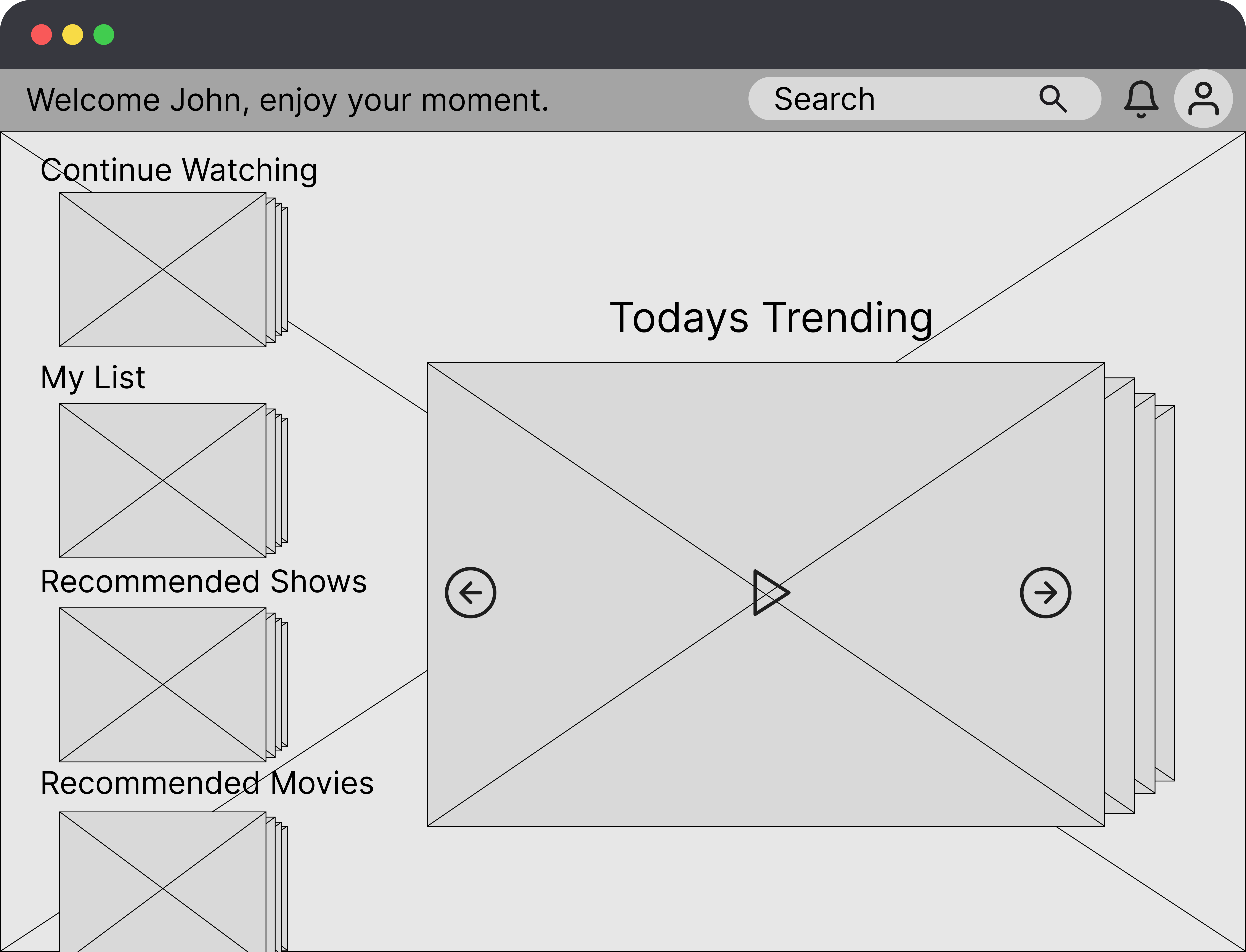 I want the user to be able to find what they are looking for as soon as they open the streaming service page. The page shows the user what is trending and gives them the option to immediately continue with their most recent show. The user can also find recommended shows/movies and their saved list. All of these options expand to give the the top recommendations as seen on the second screen.