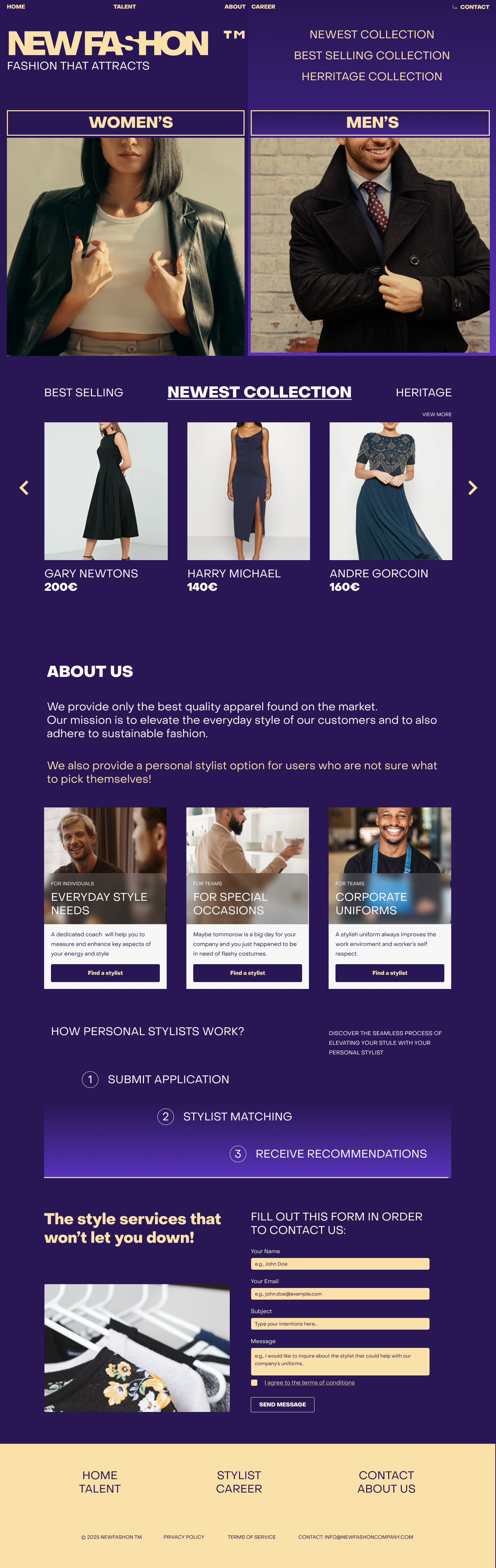 Content— The customer can pick the main categories of clothing right upon arrival on the landing page. He can also choose between the main clothing collections. If the customer isn't sure what to pick or feels like they lack competence in choosing these expensive items, the "Stylist" option is a perfect service for this endeavour. The fill out form is in the bottom of the page.