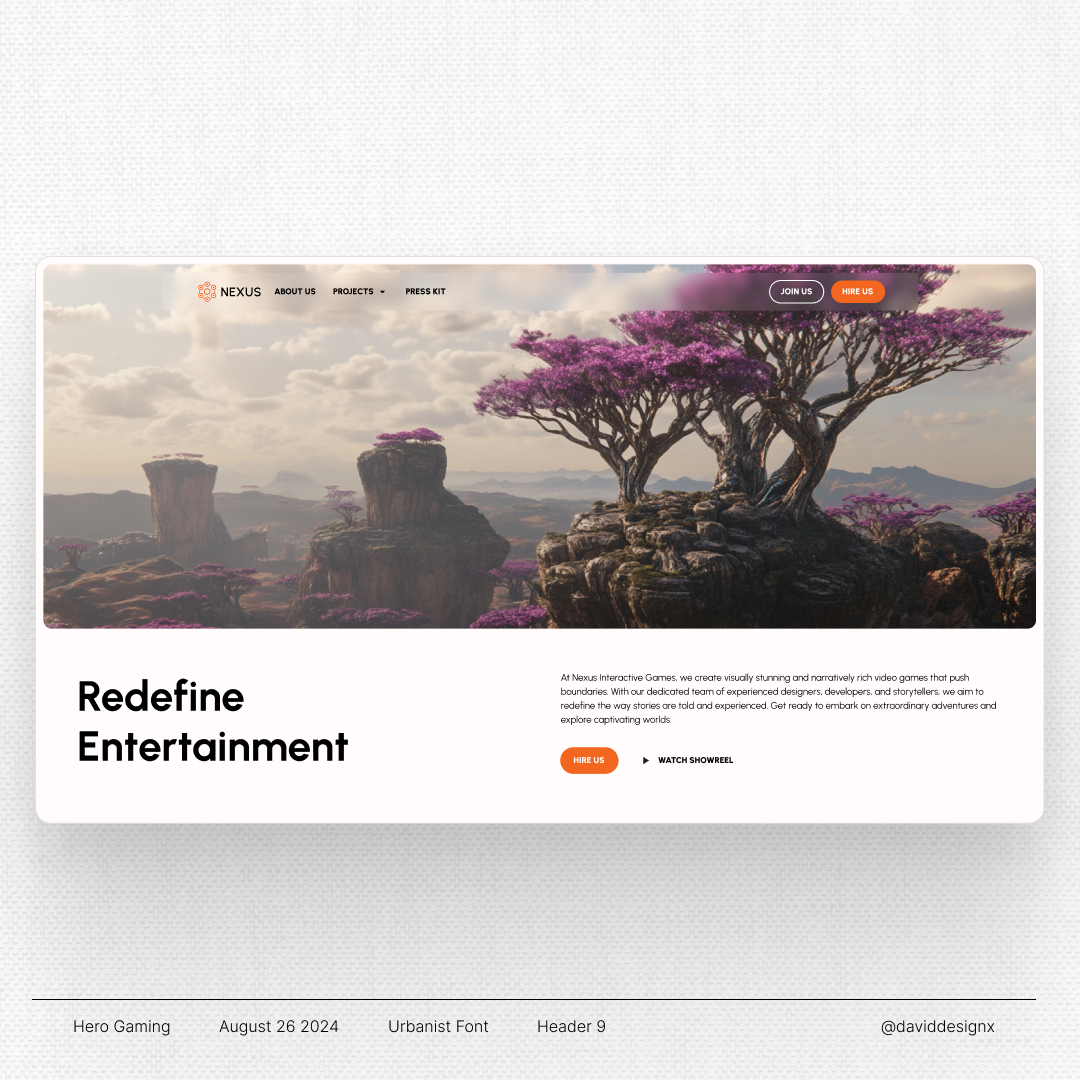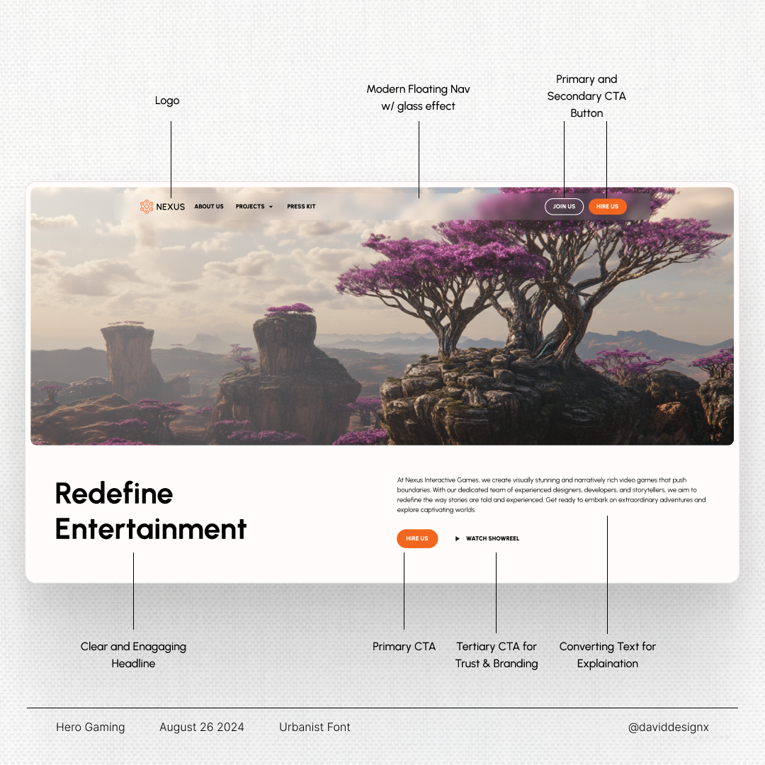 In my research I saw, that most studios use a big image in their header about their latest game. I saw many carousels, but thought for a smaller studio with less projects might want to showcase their main MVP. In the beginning I was planning on having a video instead and having too much text on with a video in the background would feel too busy.