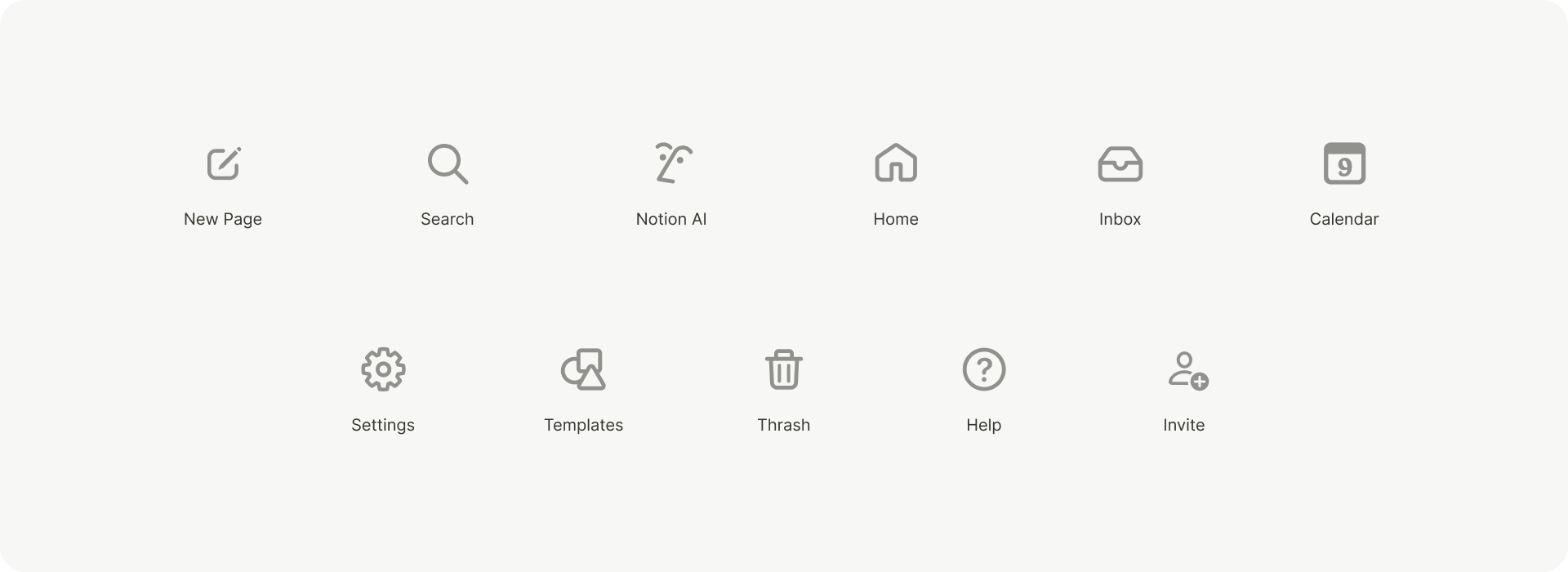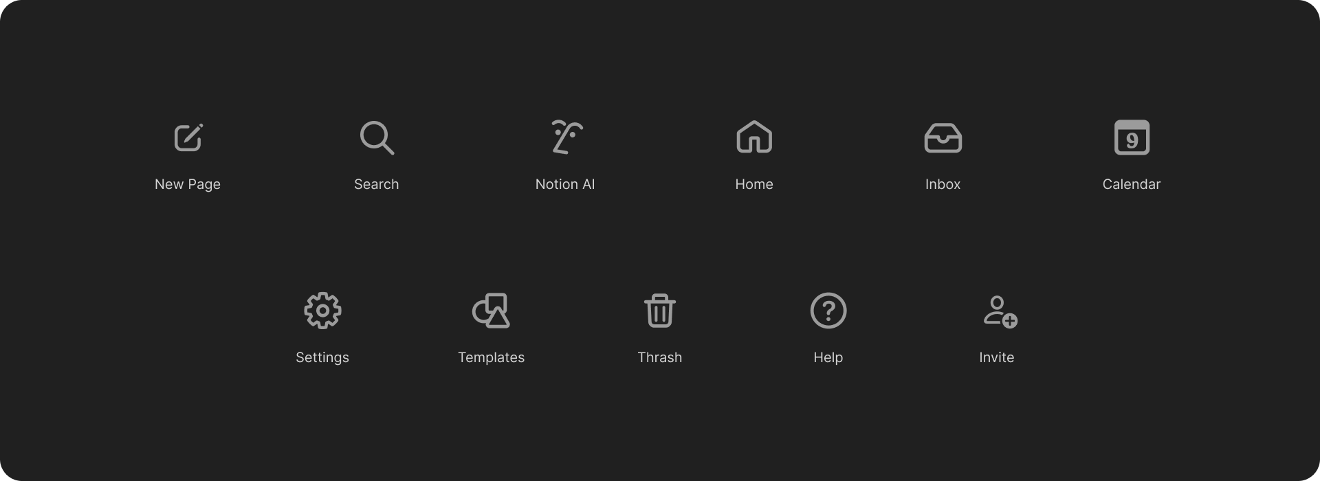 My choice was Notion and the icons displayed in the sidebar with all their most important functionalities: