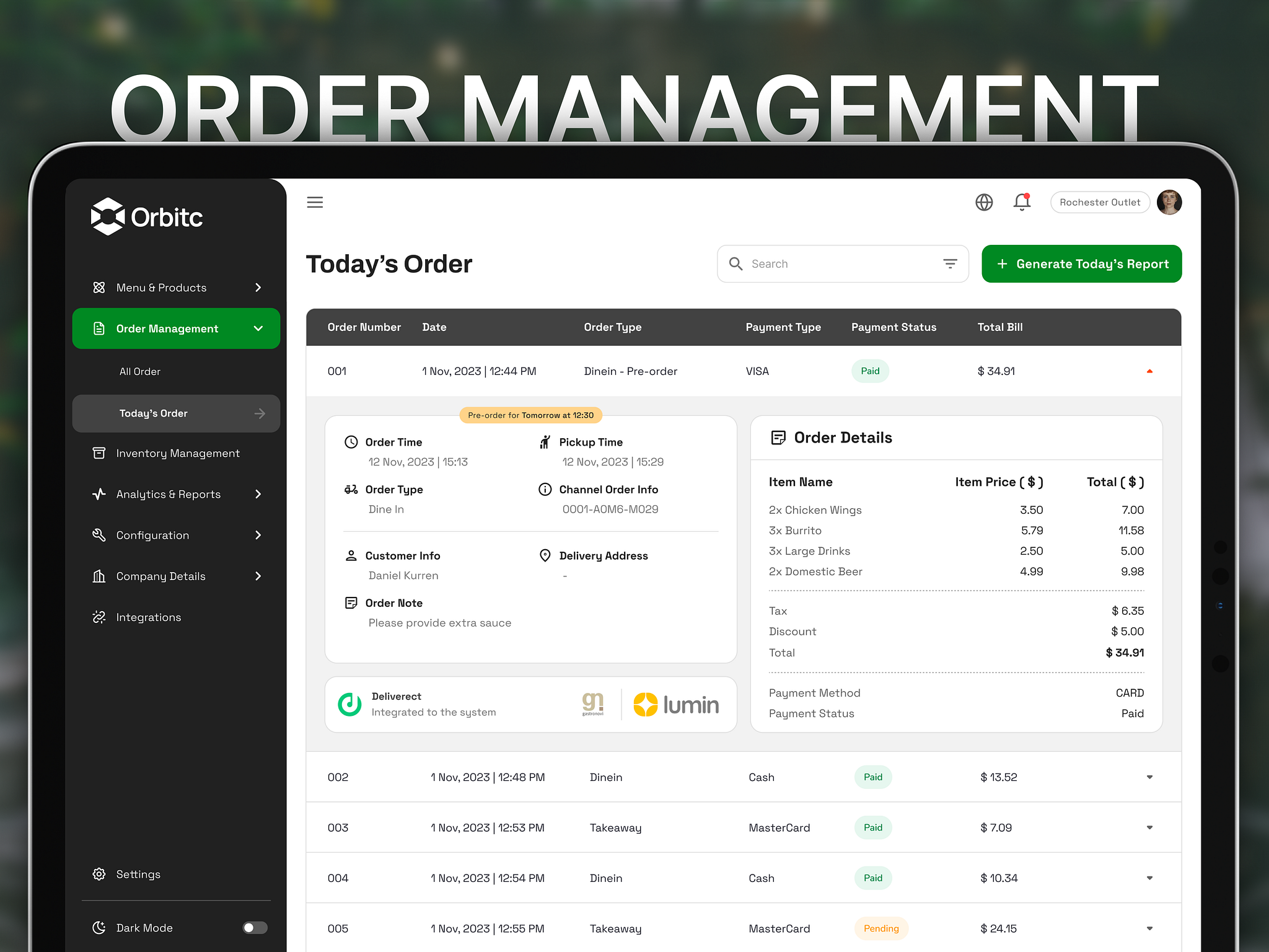 Orbitc’s Order Management app design provides a clean interface for managing orders, with essential details and a detailed breakdown of each order. The sidebar offers navigation to other sections and a button to generate daily reports.
