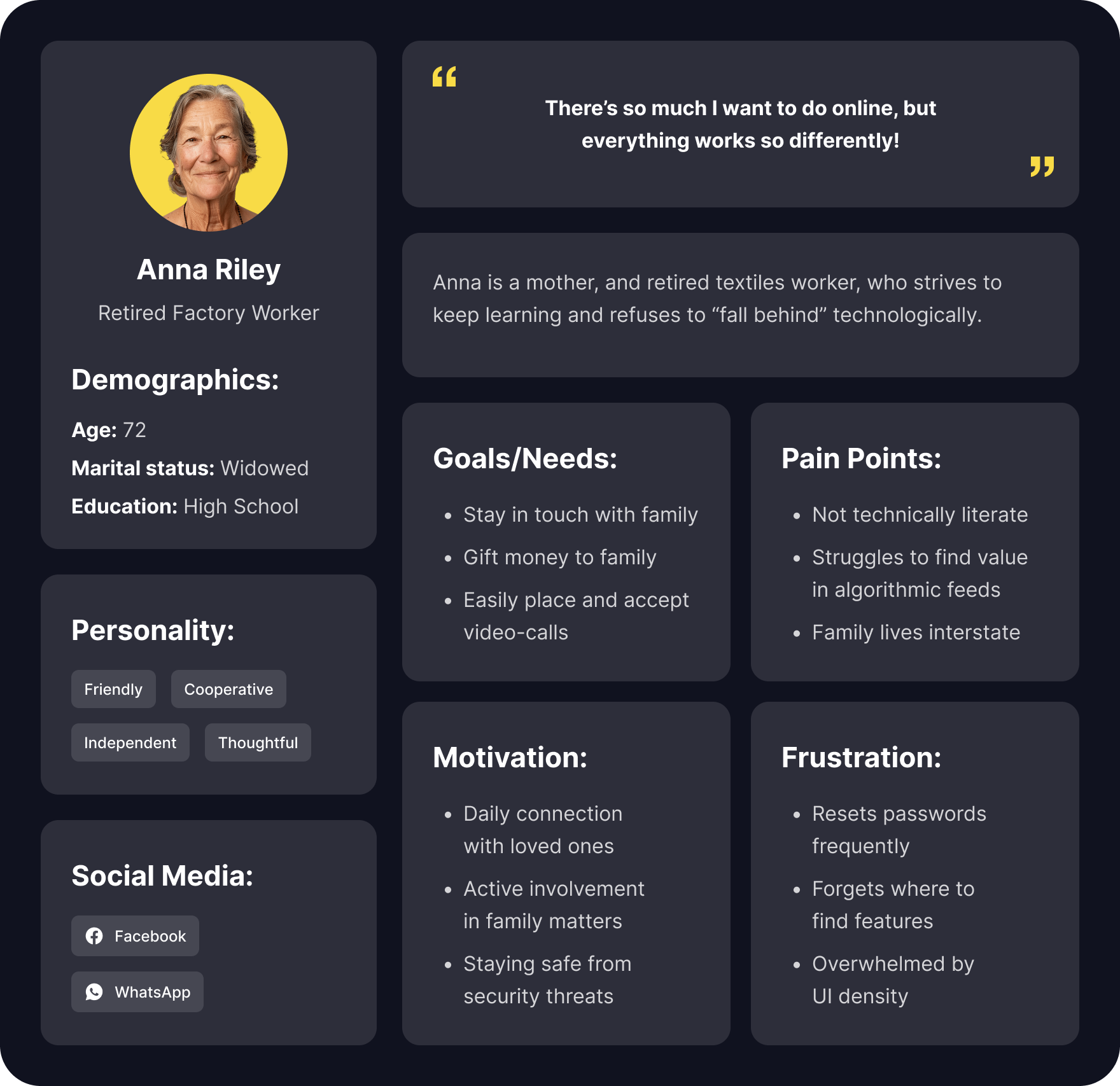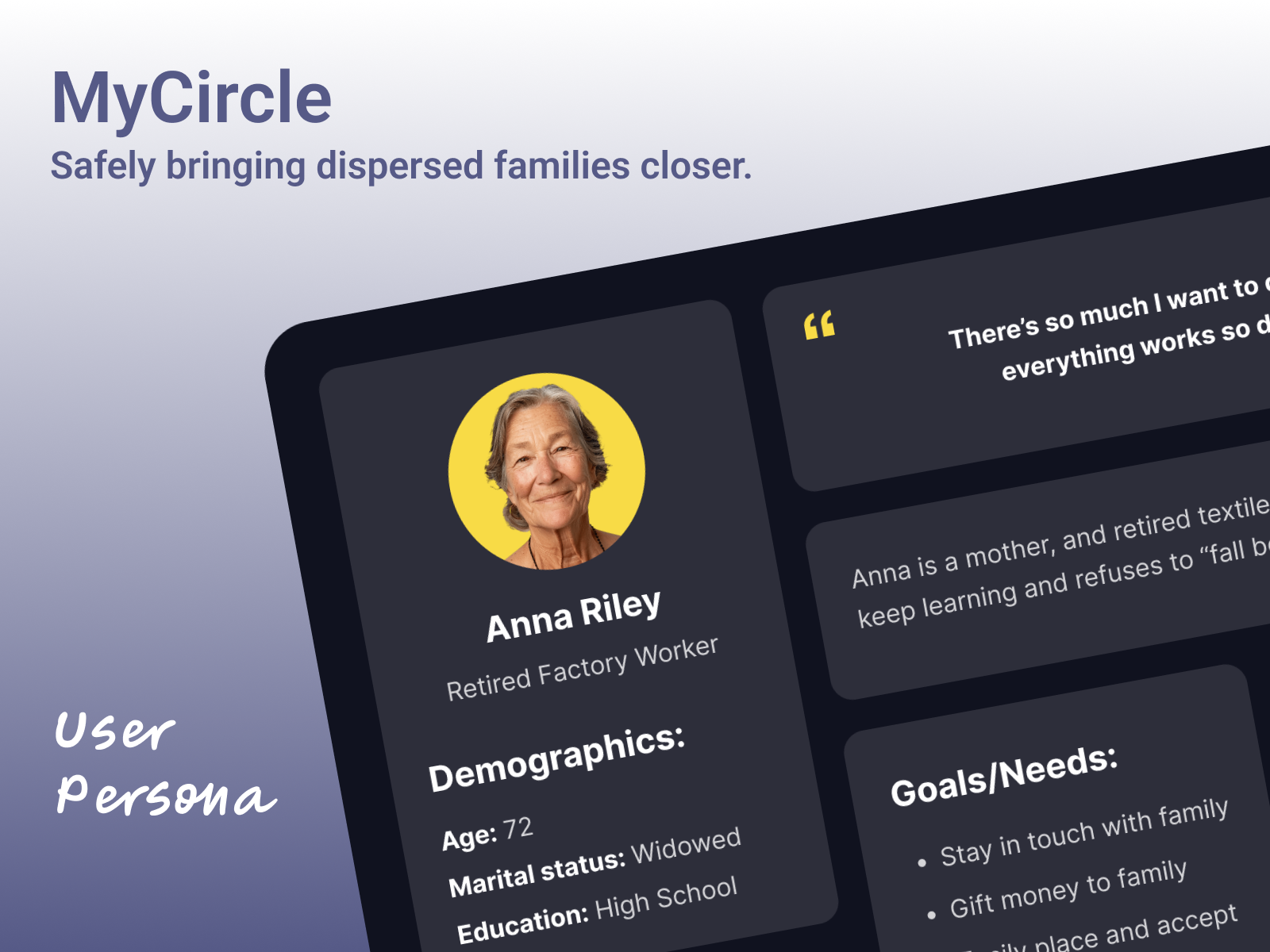 This User Persona describes the typical customer of MyCircle, a highly secure social media platform that connects senior and elderly users with dispersed families, and enables them to gift each other money.