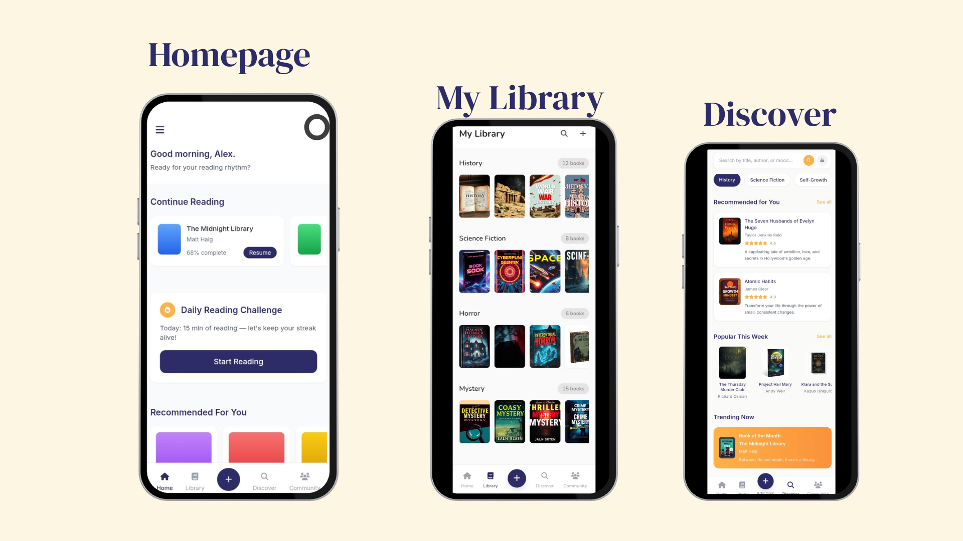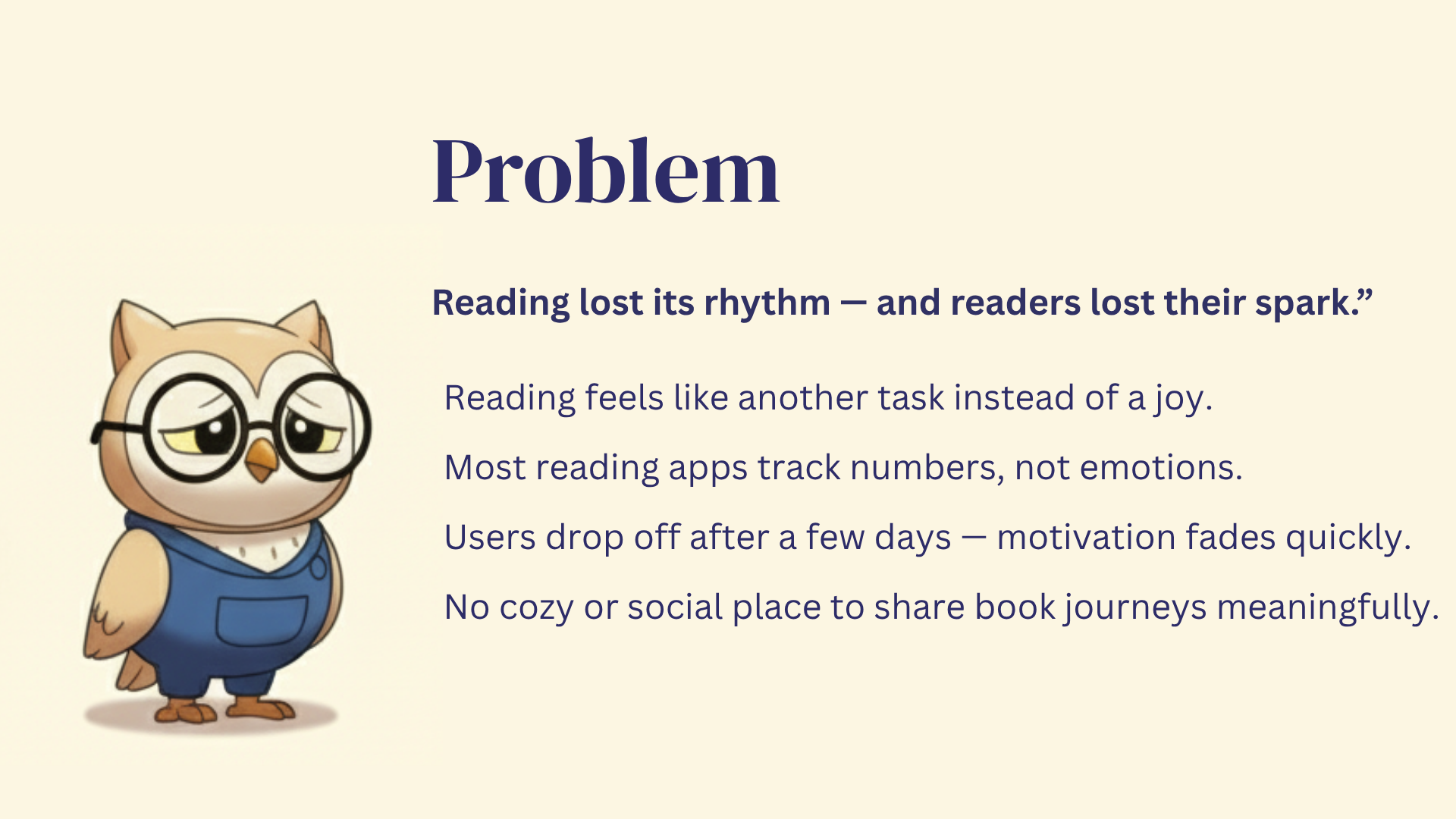 Through research and observation, I identified common struggles faced by readers — losing focus, feeling pressured, and lacking community.