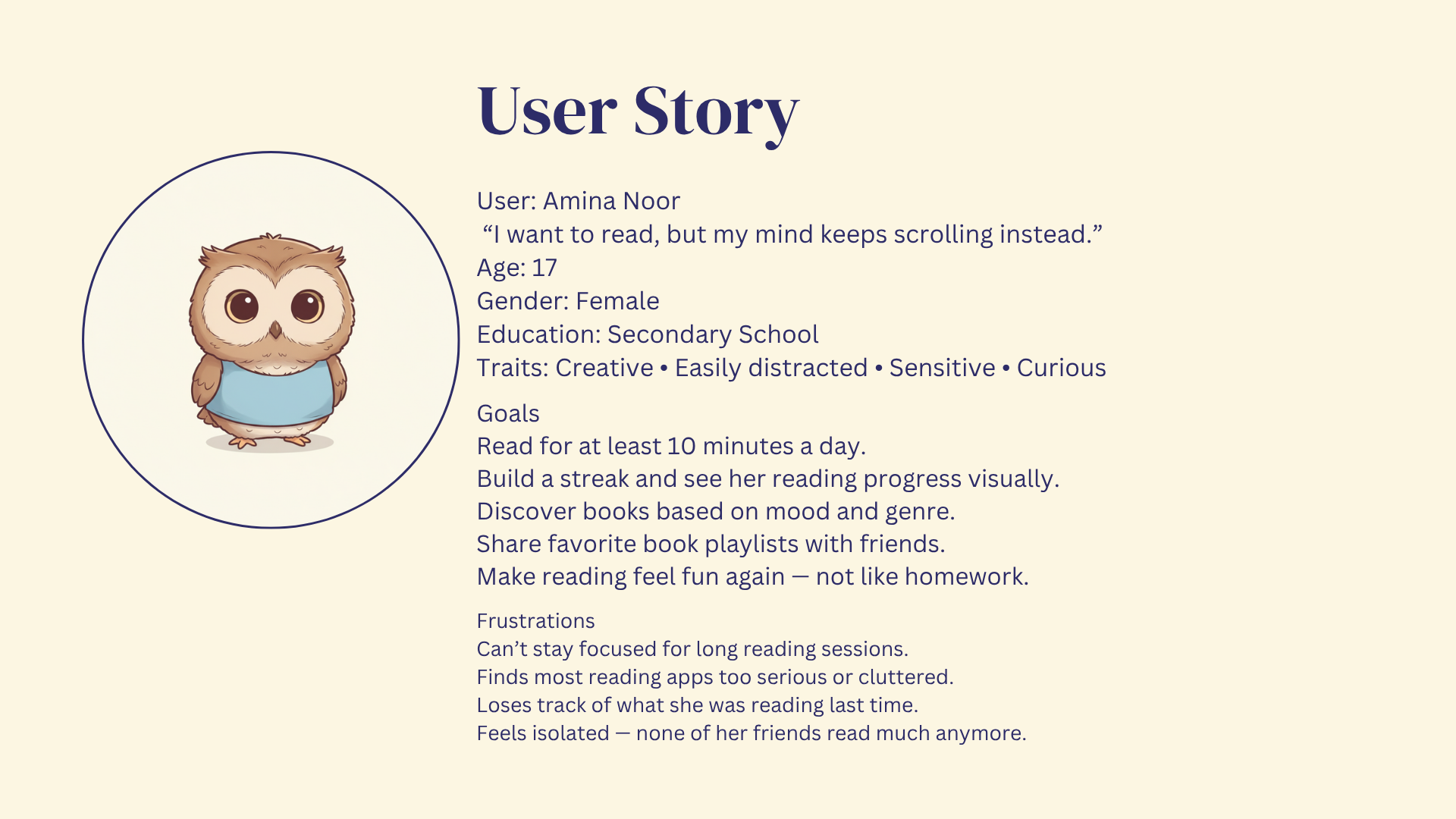 This led to defining a user story that represents the core experience Owly Reads aims to improve.
