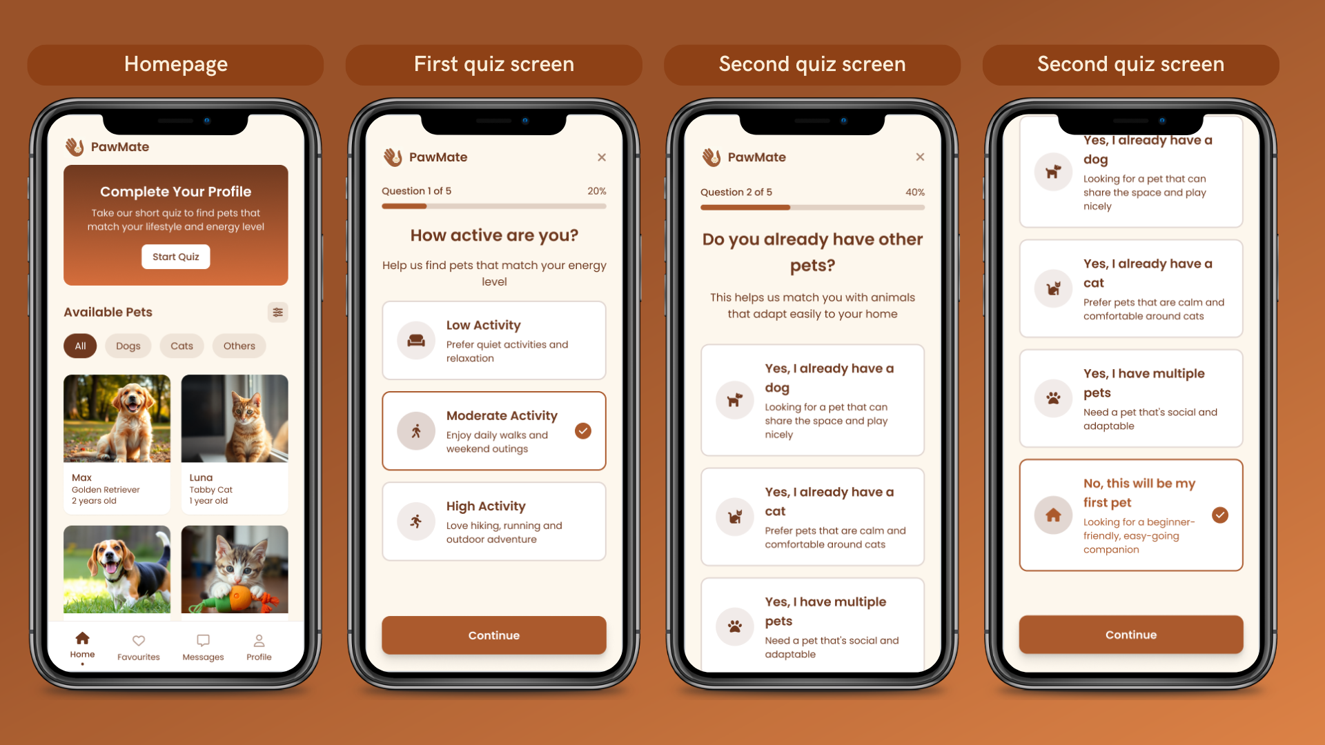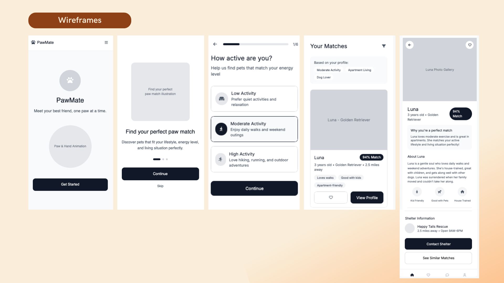 - Design:Card carousel with pet photo, name, and “match percentage.”