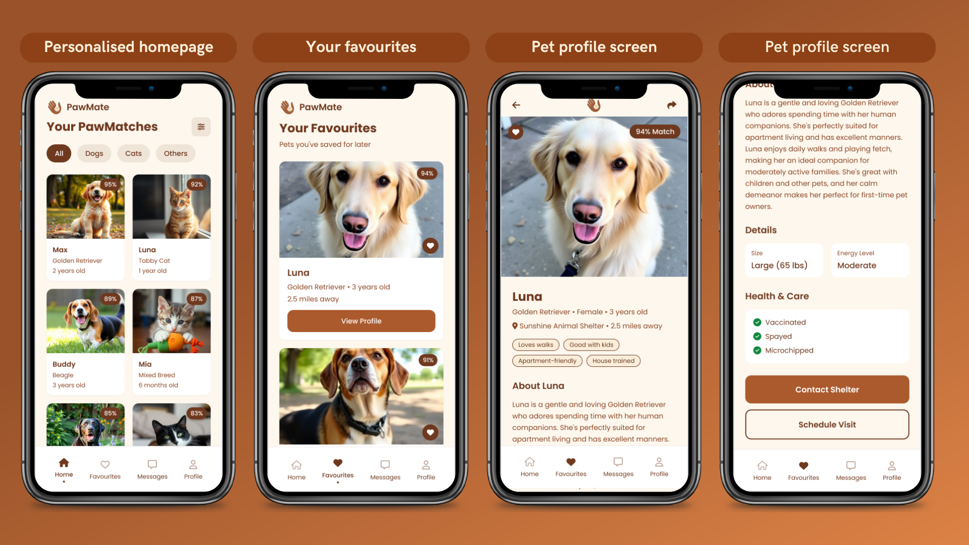 - Design:Grid or list of saved pets with “match %,” status (Available / Reserved).