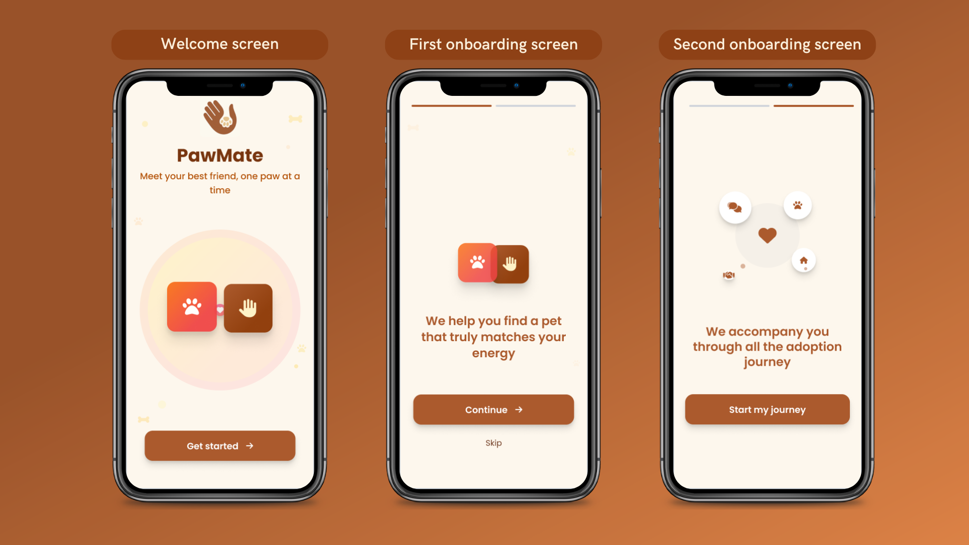 The onboarding flow was designed to create an immediate emotional connection with users while clearly explaining what makes PawMate unique. Each screen gently guides the user into understanding the value of the app — from curiosity to excitement to action.