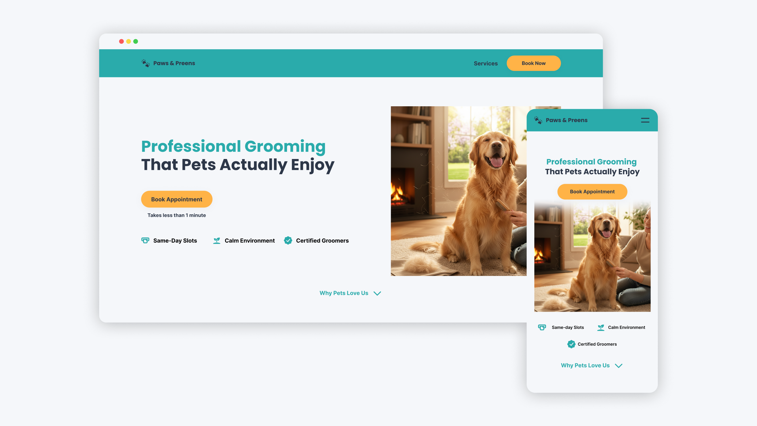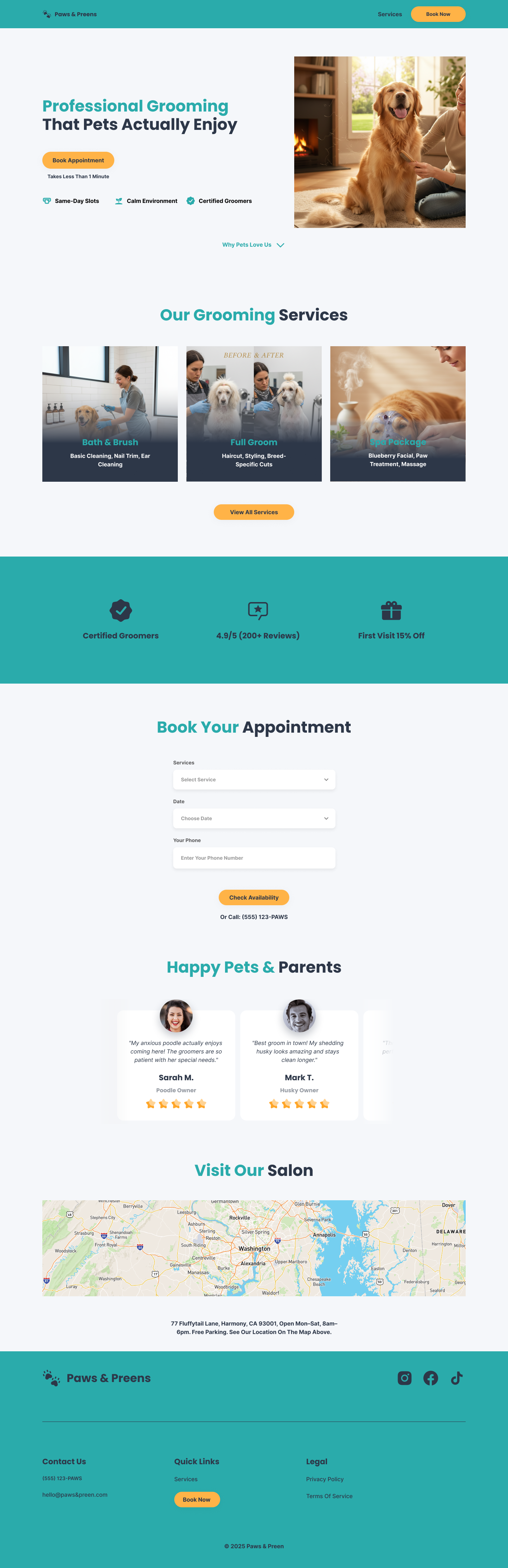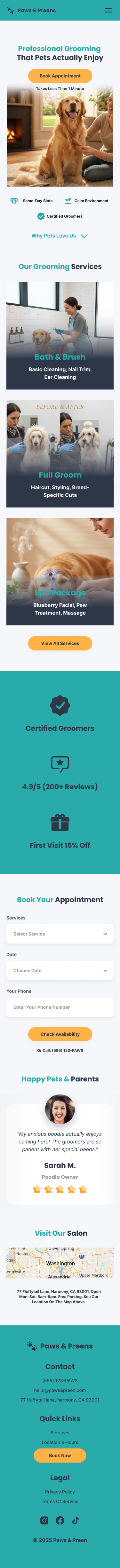 - Imagery: Contextual photos showing happy pets and professional grooming environments.