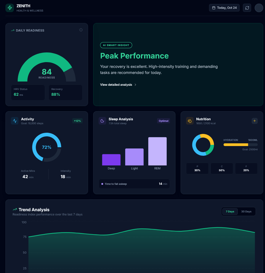 VitalTrack is a health-intelligence interface that consolidates fragmented data from wearables and manual logs into a single view. It solves "data fatigue" by converting raw metrics into a Readiness Score, moving the user experience from passive tracking to active decision-making.