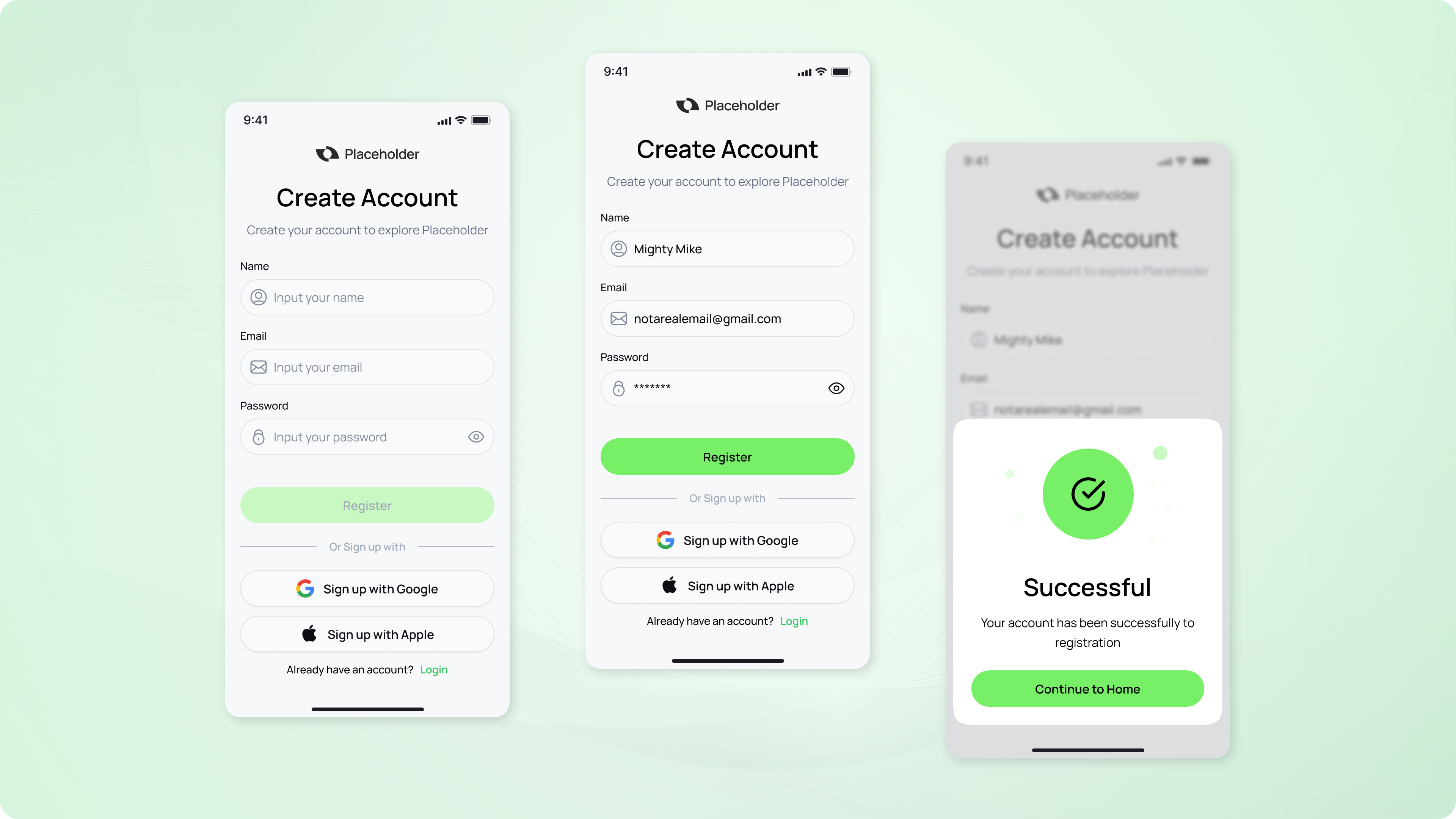 A small adjustment I would make is that I'd shorten the copy for the placeholders - currently they repeat what the input label says "Input your ..." while creating more text that the user must read. This can be either just shortened to e.g. "first name" (also beware - some users might be left wondering if the name field should contain just the first name, both first and last, or if it's a username field) or, what's better, it can specify an example like "eg. Adam Smith".
