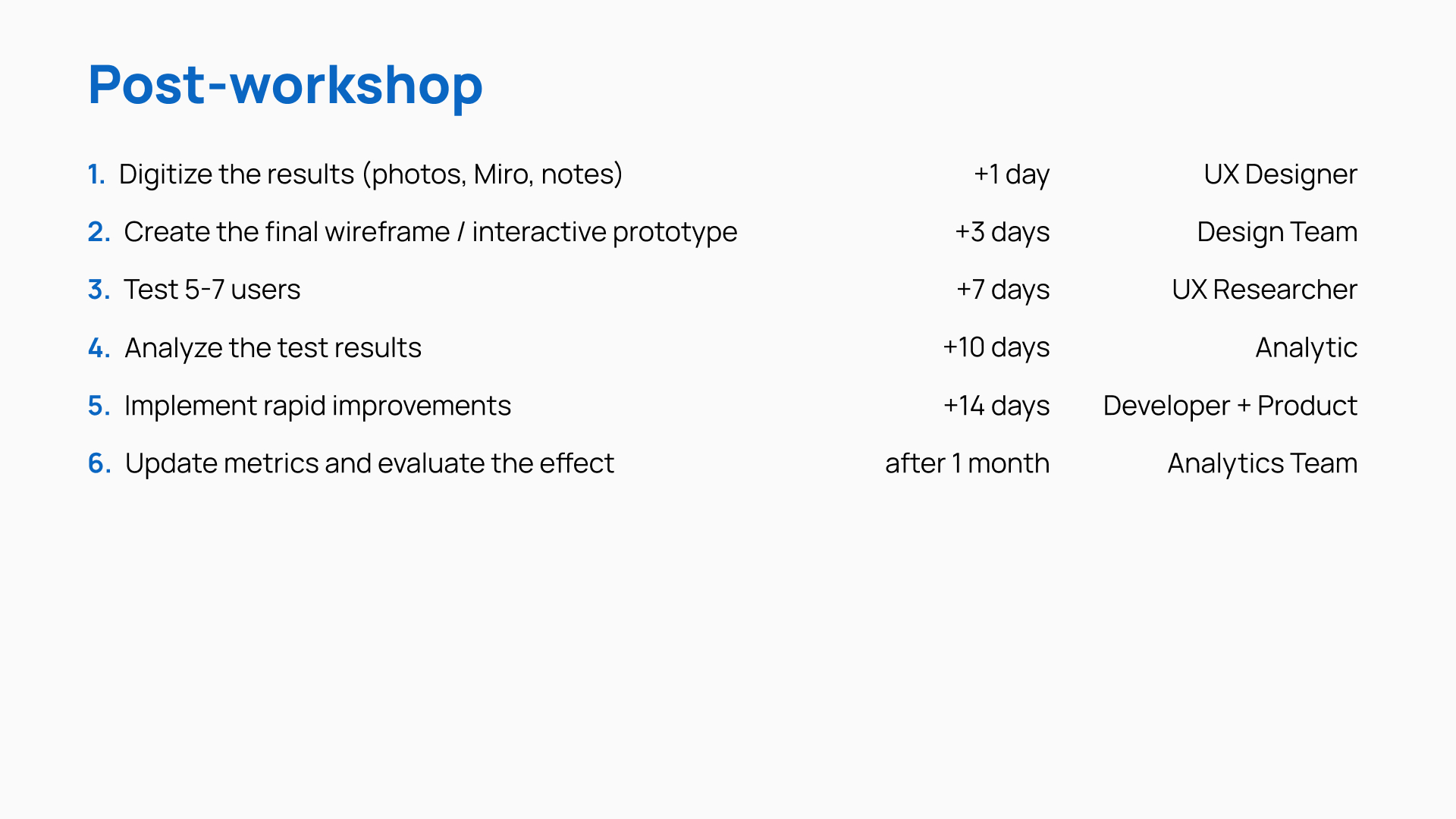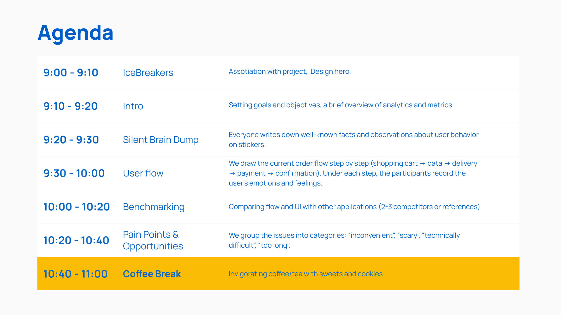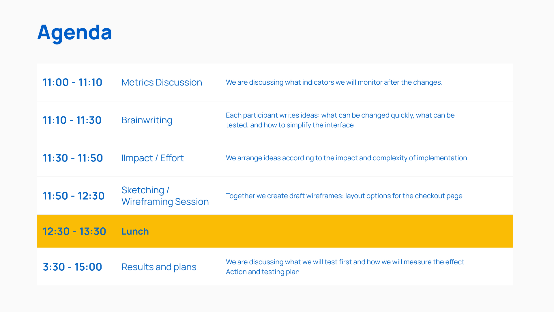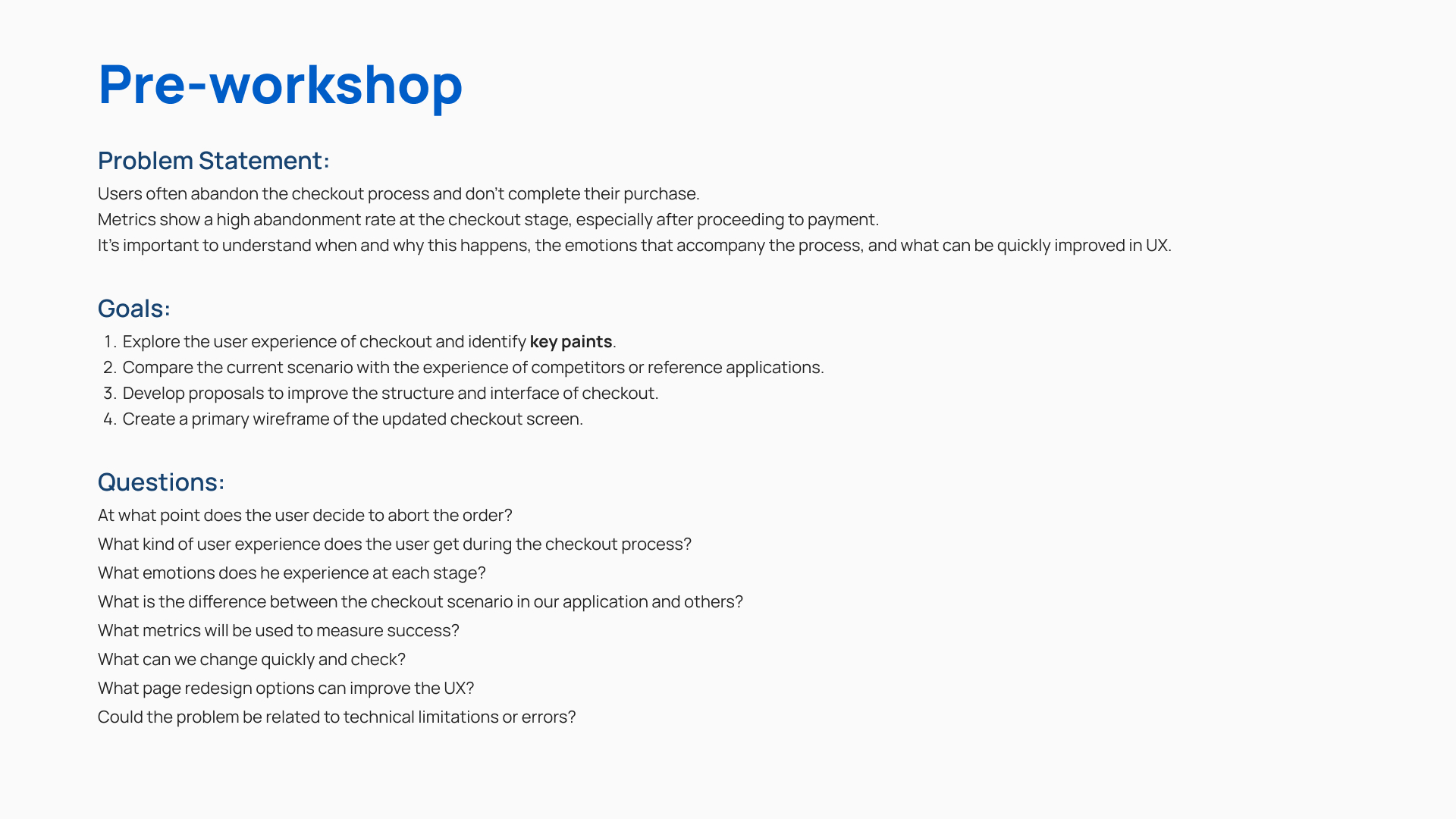 At the end of the workshop, we must understand these pains, propose solutions, and receive a low-fidelity wireframe.