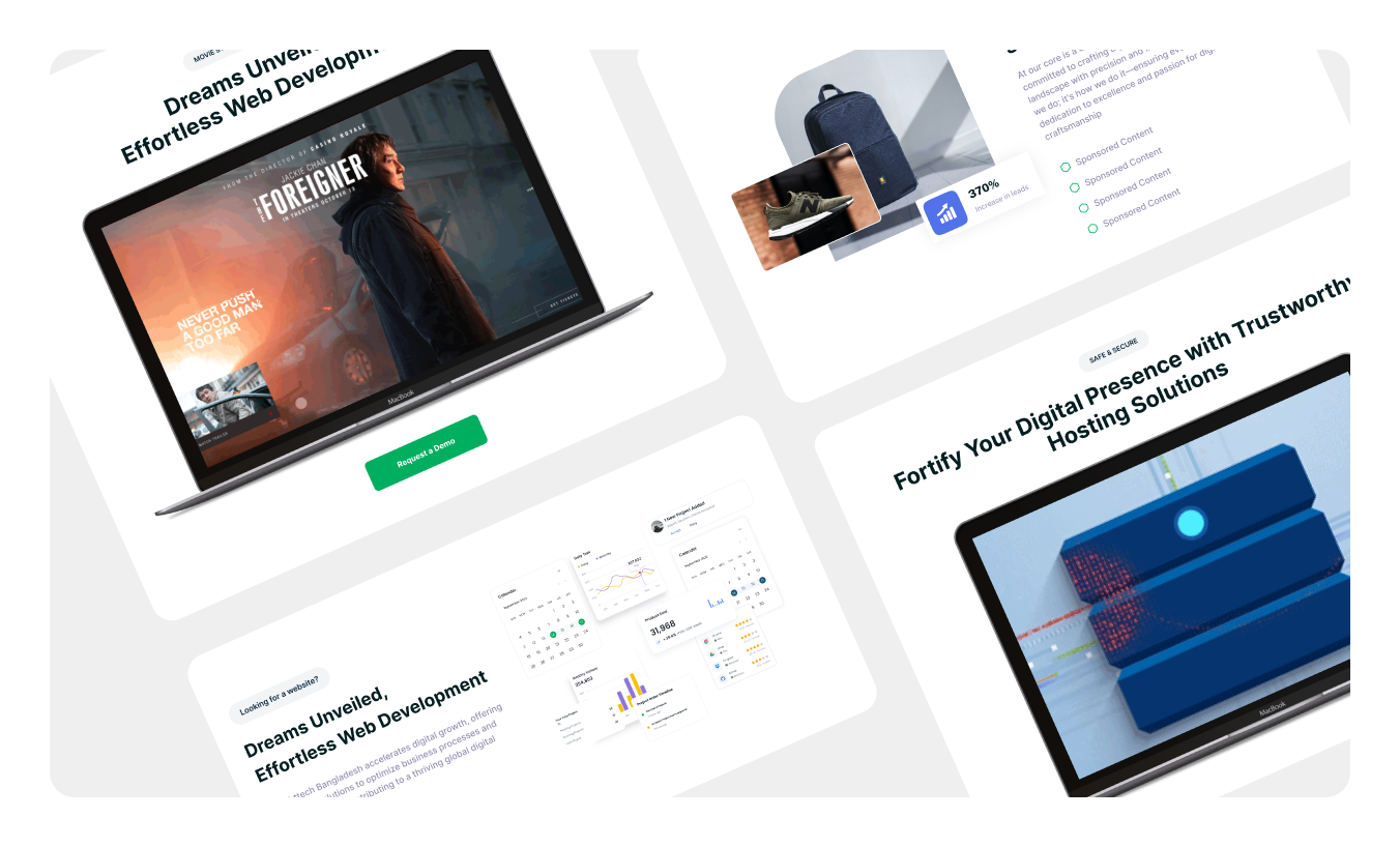 - Web Development: User-focused, mobile-first platforms with rich functionality and SEO optimization.