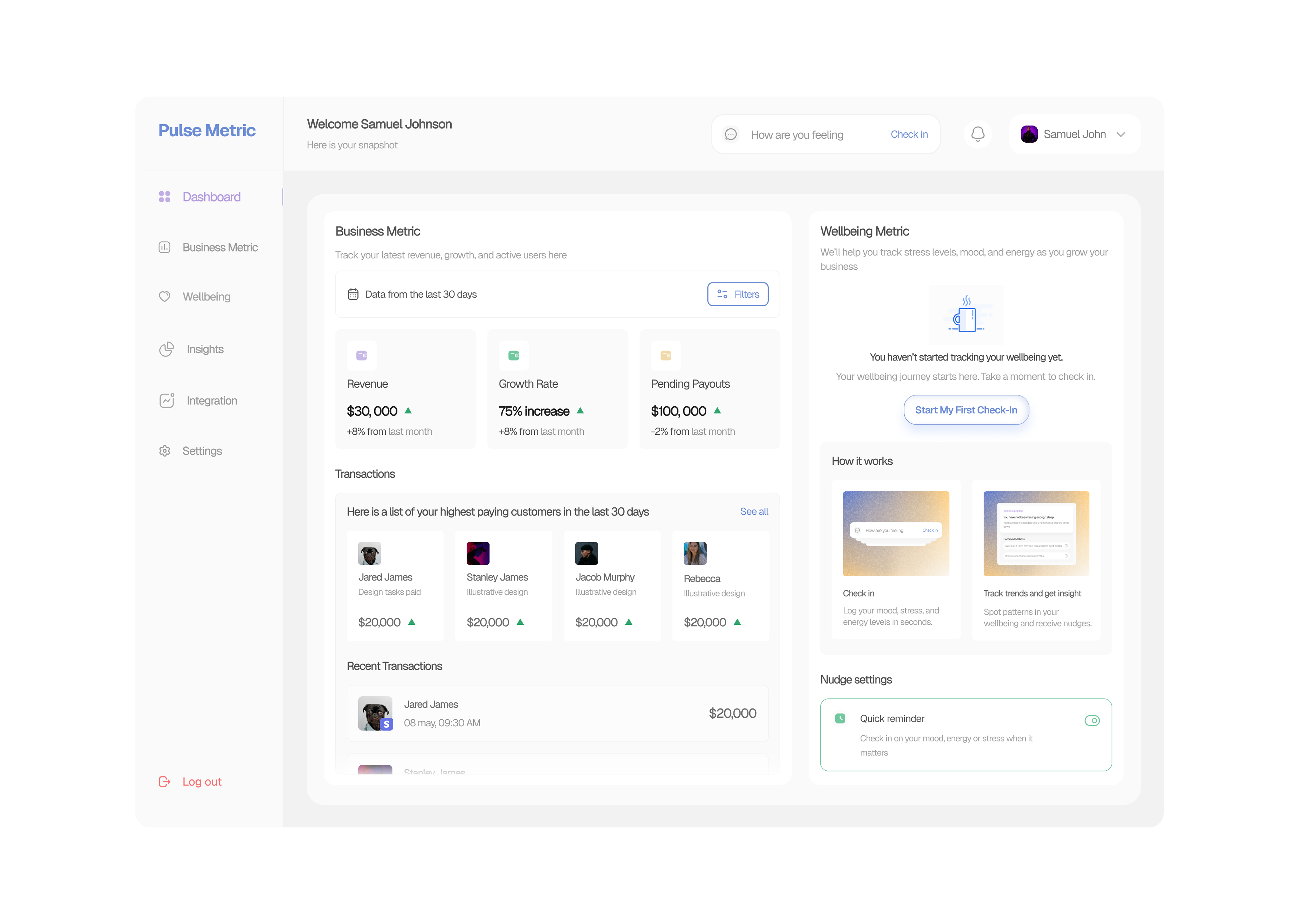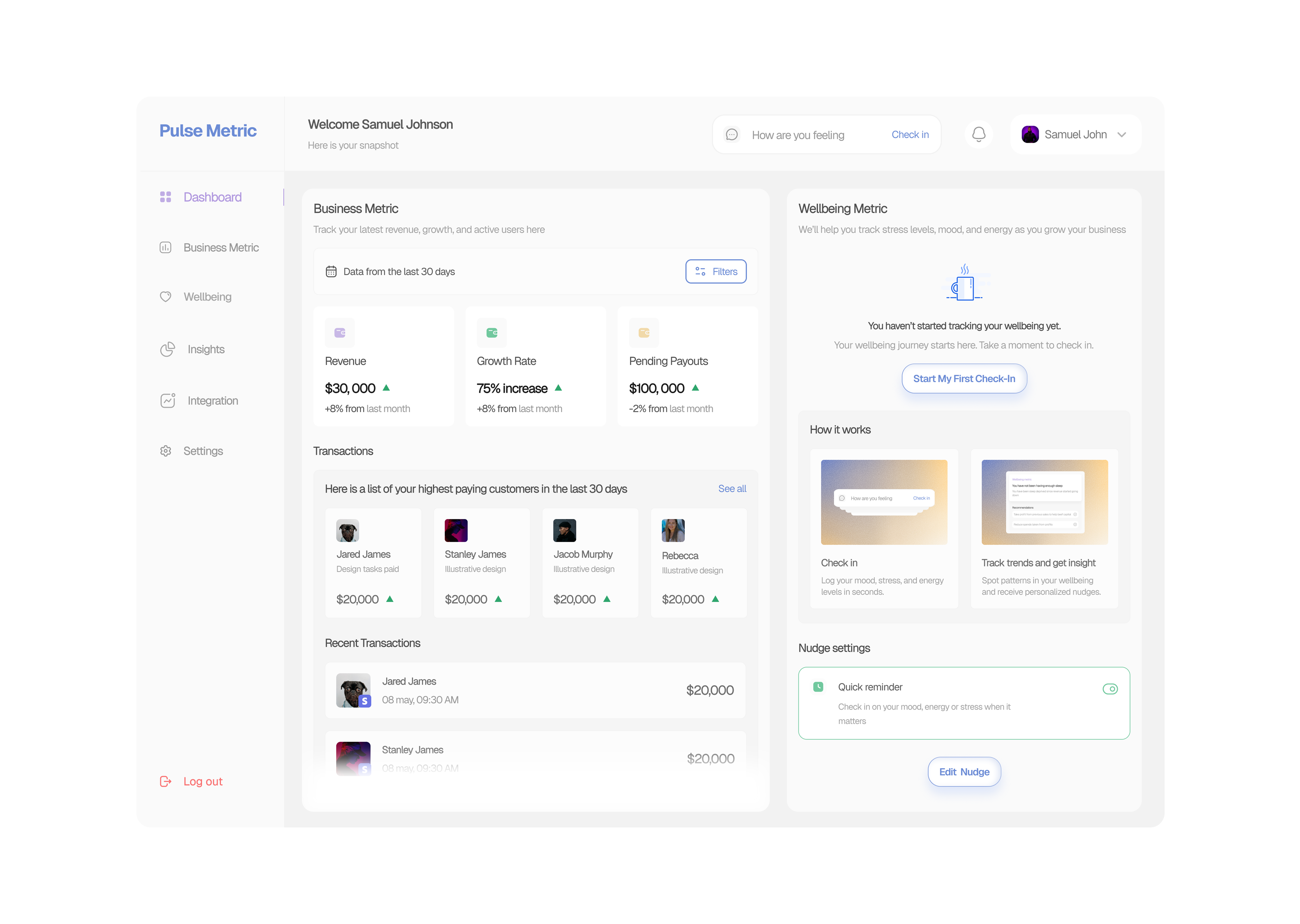 Pulse metric is a platform designed to help solo founders monitor the health and well-being of their businesses. We often celebrate revenue growth, MRR, and customer wins, but we rarely measure what’s happening inside the person running it all. Pulse is designed to help change that.