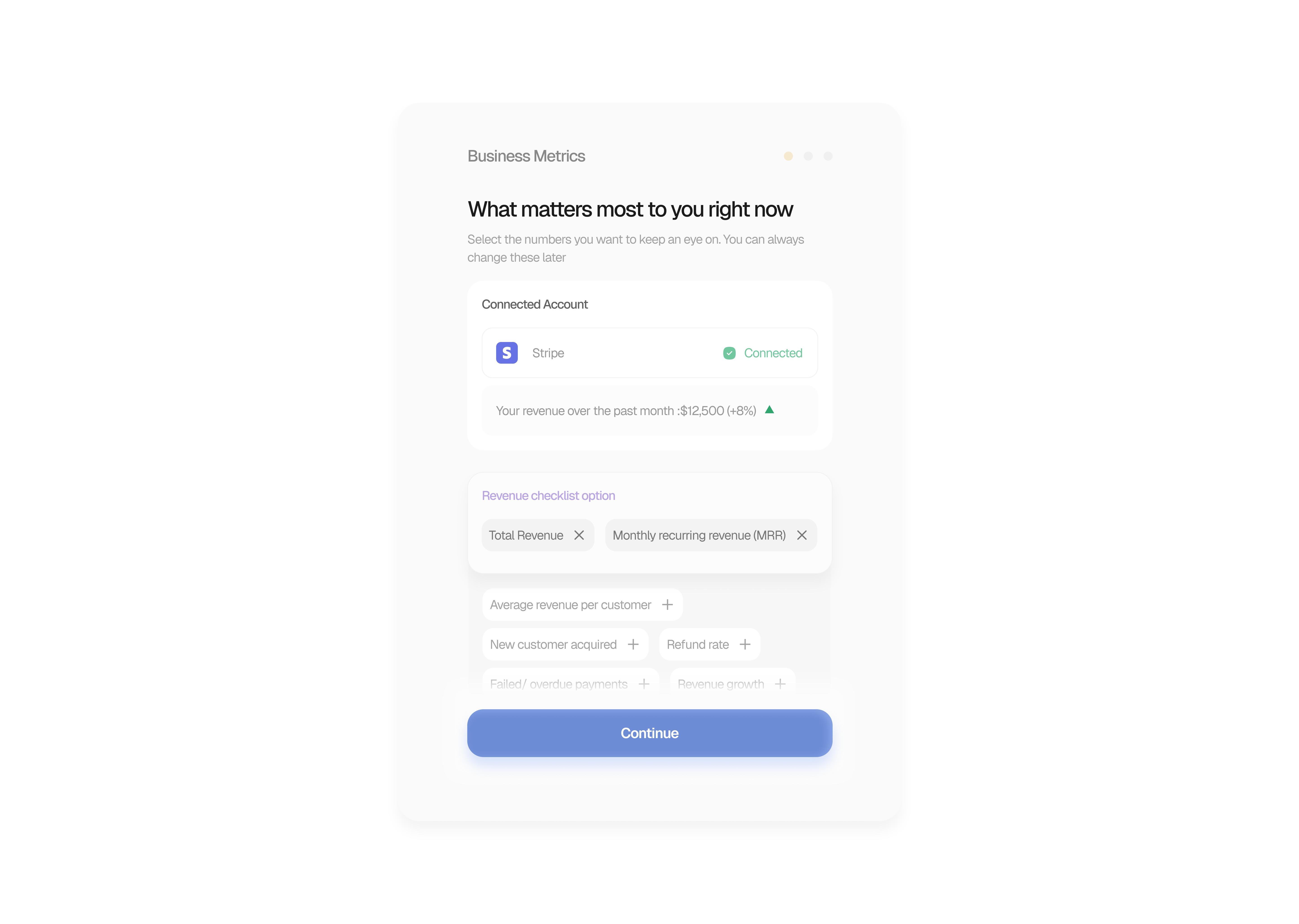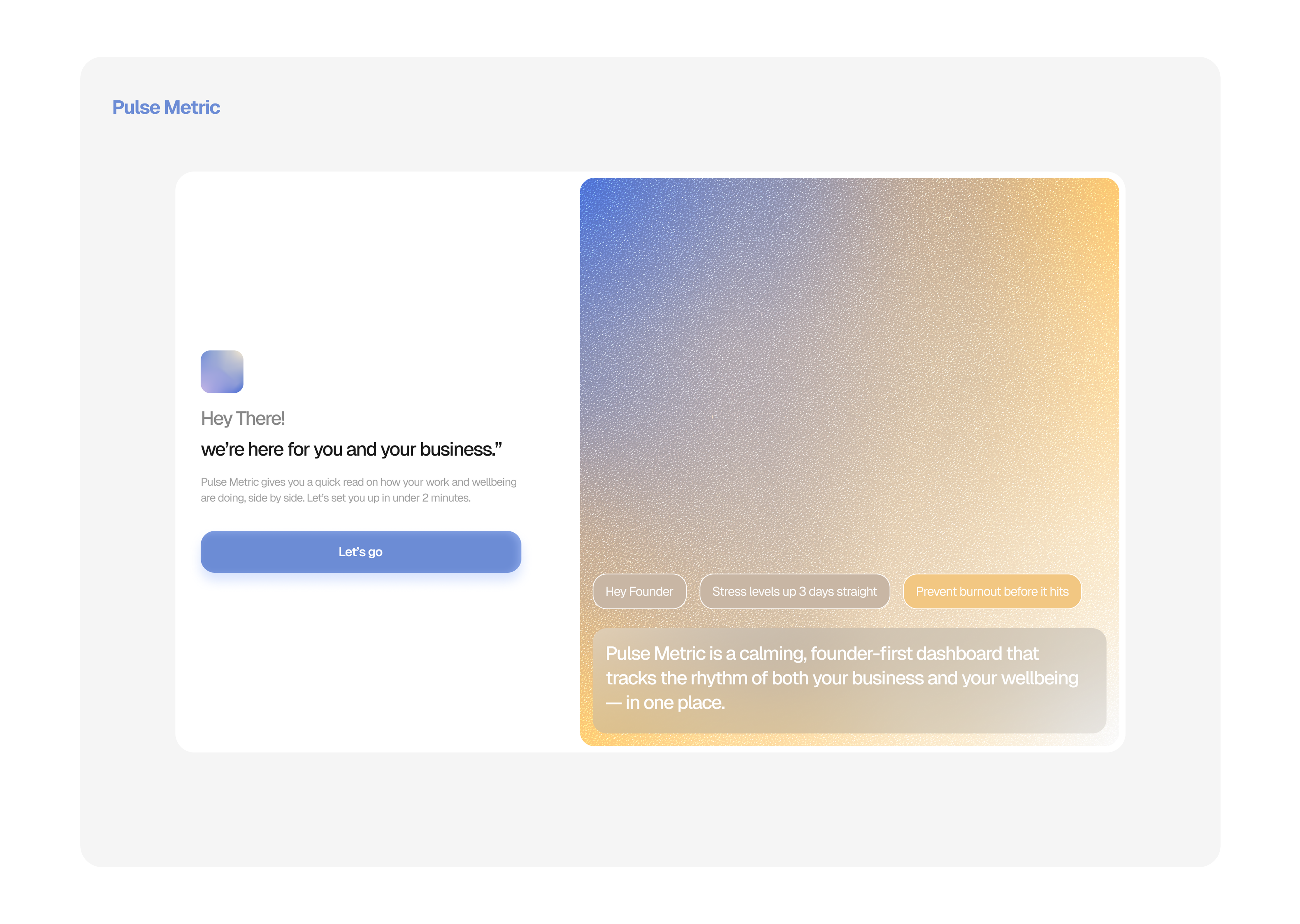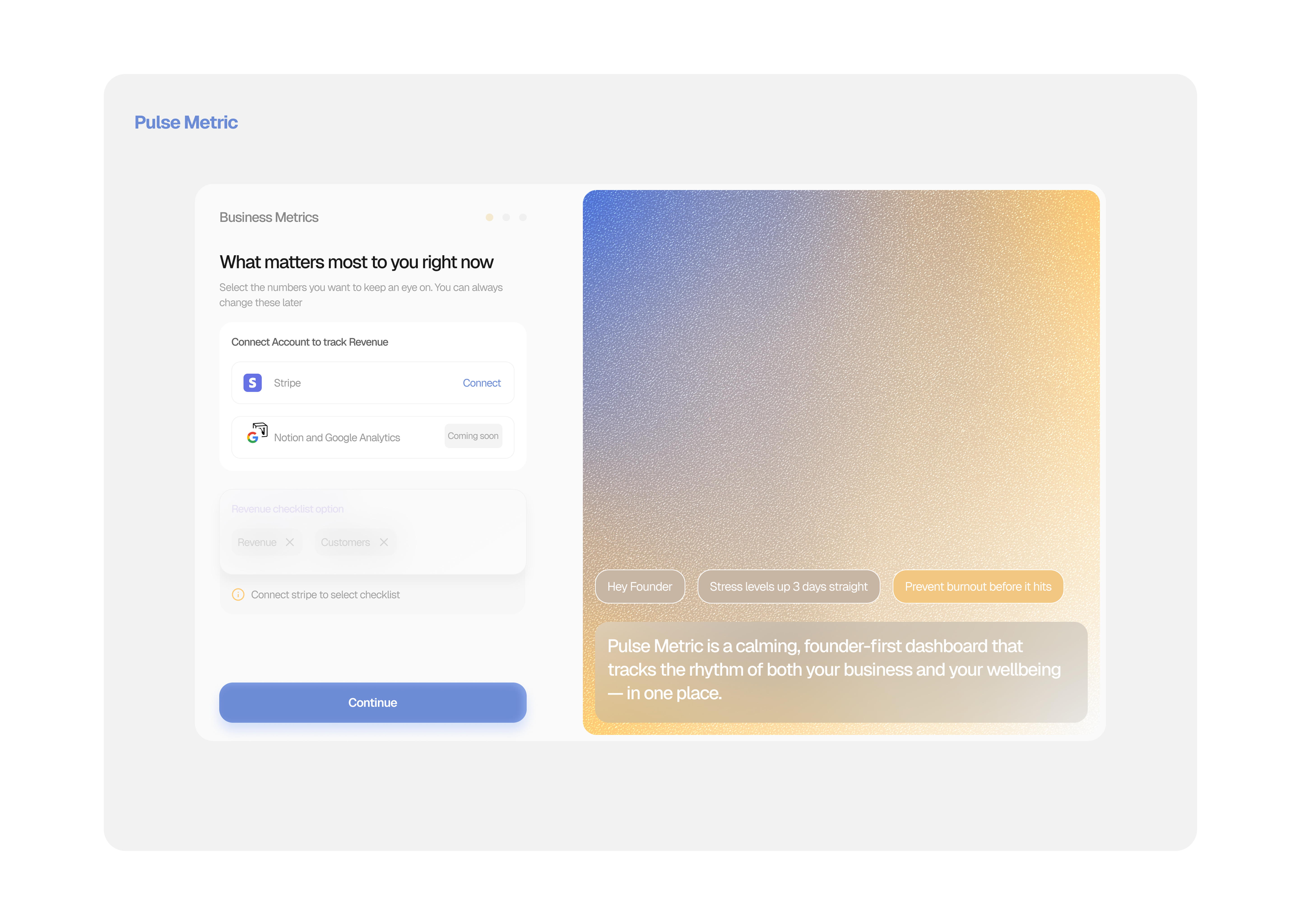Onboarding with Pulse is frictionless — solo founders can sign in with email or Google, connect Stripe in under a minute, auto-set key wellbeing check-ins, and get their first snapshot, all without jargon or overwhelm.