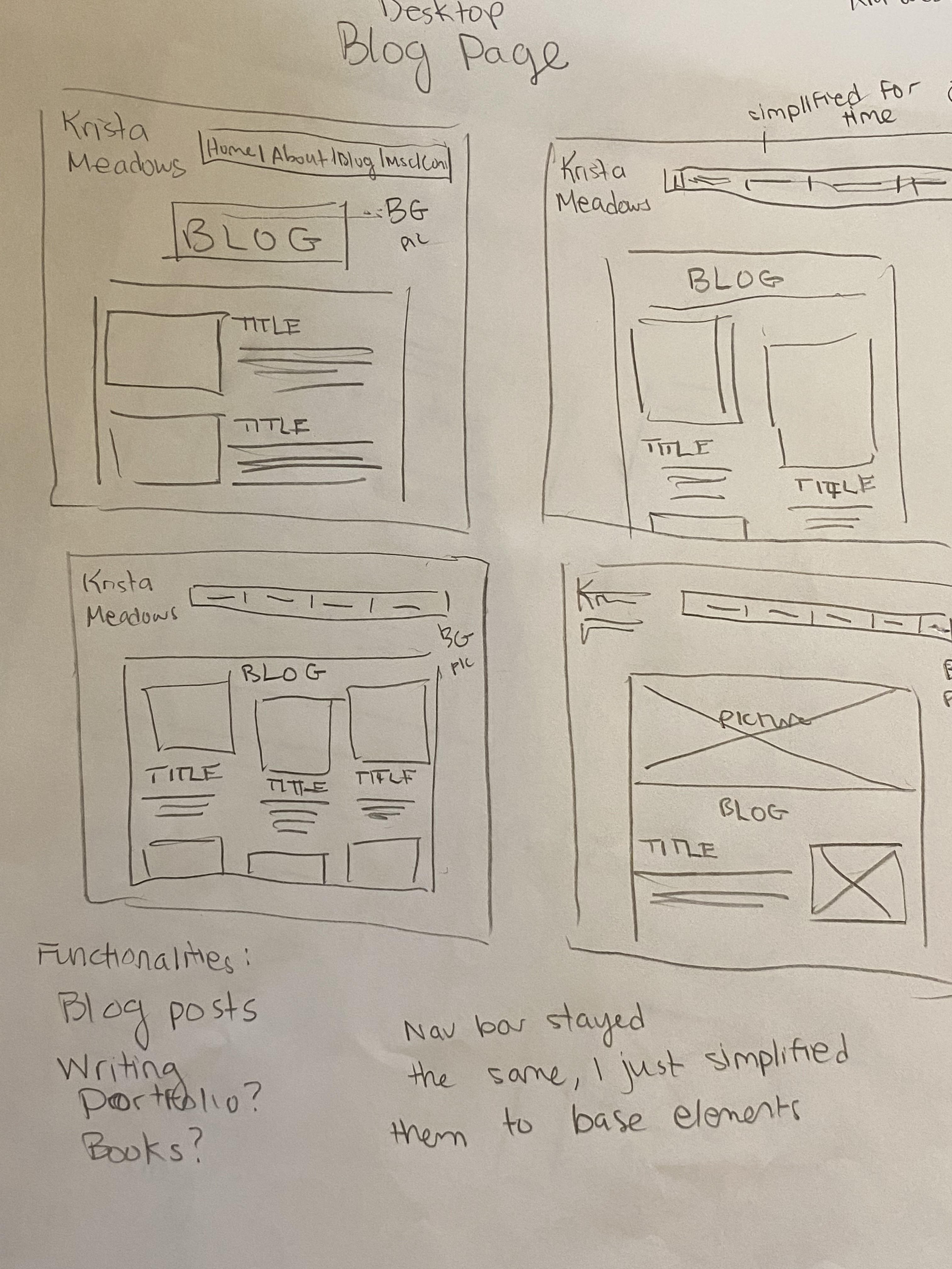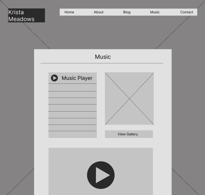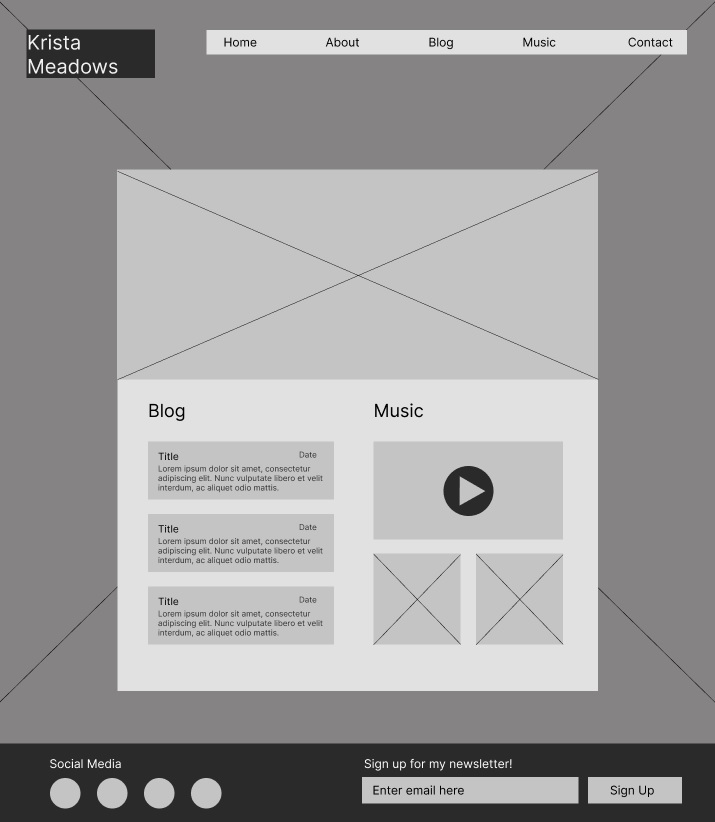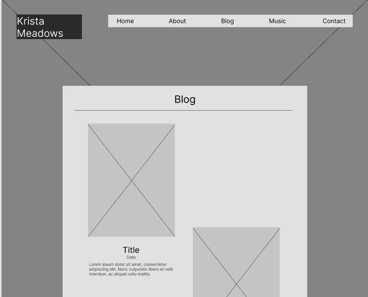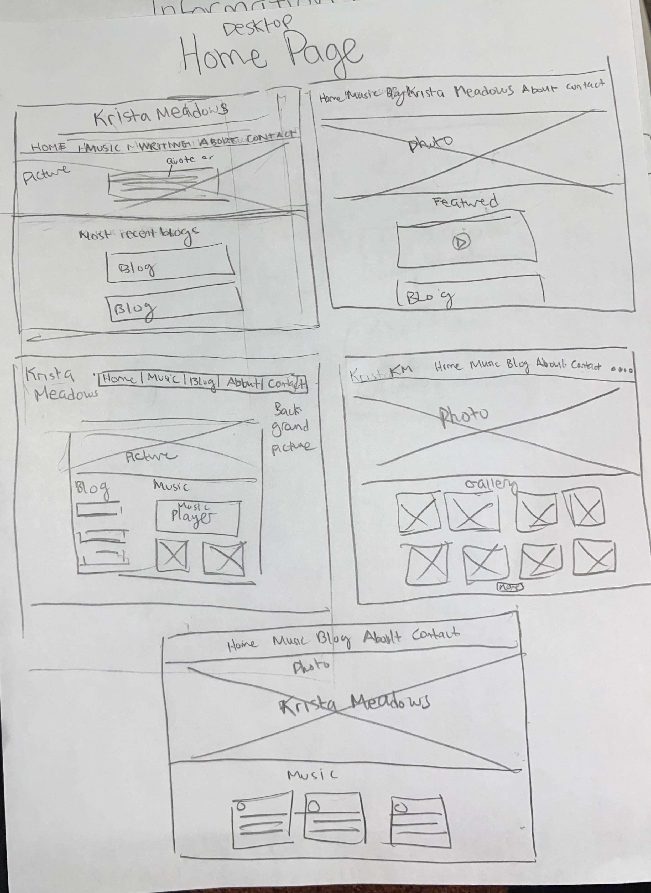 I constructed low fidelity wireframes of the home page, blog section, and music page. I placed Home, About, Blog, Music, and Contact in order of priority in navigation. On the home page I decided to place featured blog posts on the left so that users will see it first, and I maintained the music player and video above the fold.